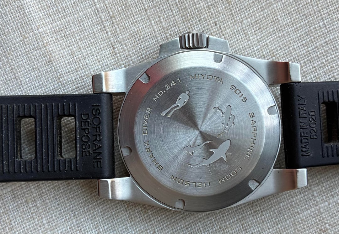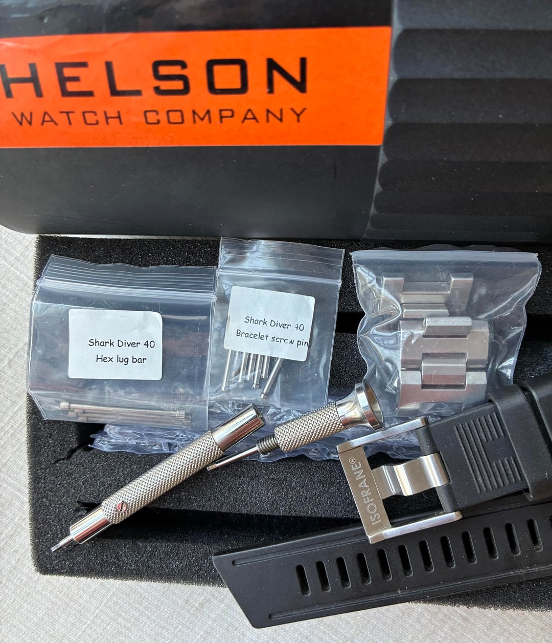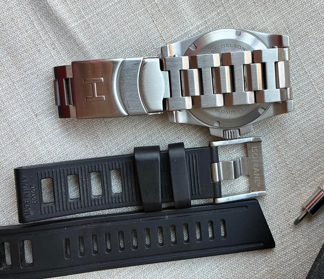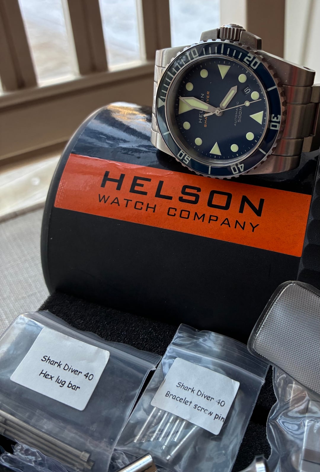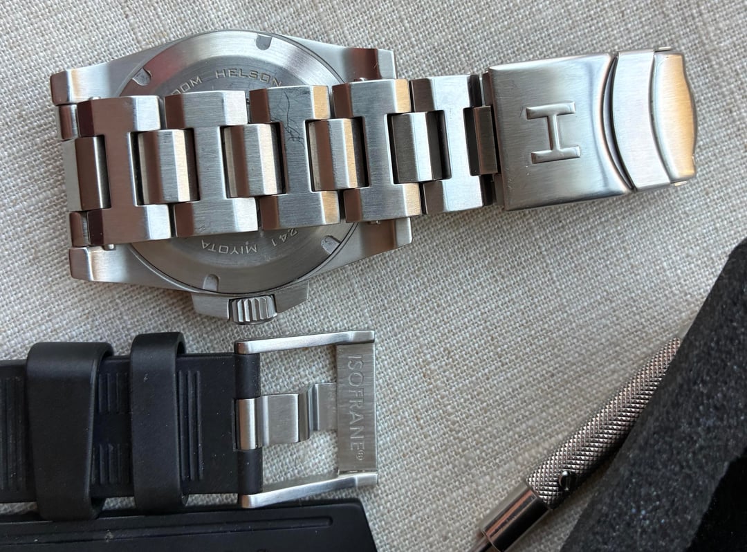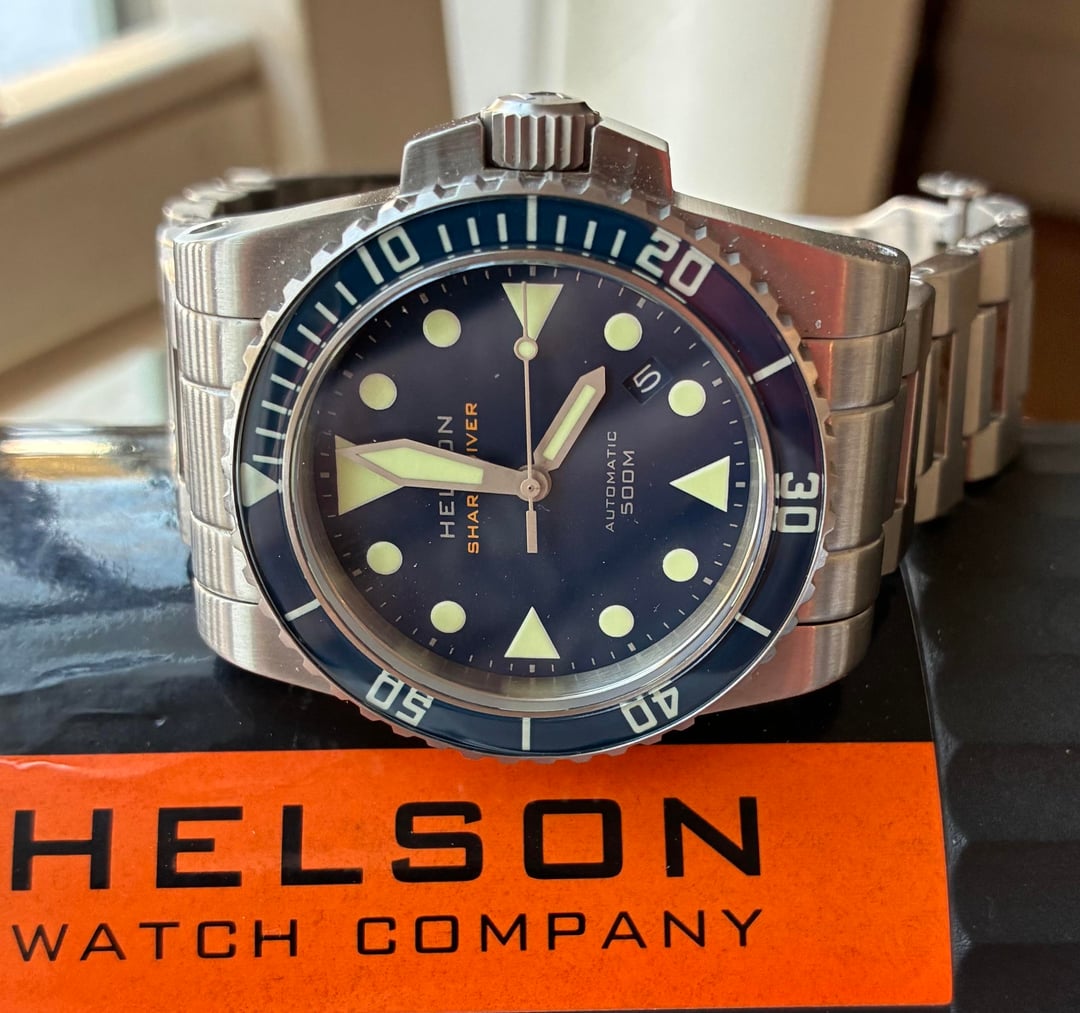 Happy New Year WatchEx! First sale of the season. Putting up an excellent condition Helson 40mm “Shark Diver” Blue dial. Very clean and has been well taken care of. A well respected previous owner I’m familiar with, on WatchUseek forum, had a new Miyota 9105 movement professionally installed so this watch is good to go for the long haul. Keeping good time & running strong! Outrageous Lume!!! One rugged tool diver! Kit includes extra lug bars, extra bracelet screws, the nest hex driver for the lugs, and I’ve added an Isofrane rubber strap, as there wasn’t the Helson “Cuda” rubber included when I received it. Watch ships in the Helson padded tube. Finger grips of the padding have seen some wear. Still functional. Prompt shipping in CONUS VIA USPS for **$325.00 -** I can do PayPal F & F, G & S, or Zelle - I’ve got 18 yrs of positive feedback on WatchUseek, and my WatchEx transactions in good standing.  Specs: Case 40mm x 49mm x 12mm Movement 24 jewel Miyota 9015 (New) Automatic Crystal 3mm thick, flat sapphire with inner AR coating Bezel 120 click sapphire with C3 superluminova (great bezel action) Dial Blue with C3 Superluminove 4:30 date wheel WR 500M Bracelet 20mm brushed stainless steel solid end links hex head screw bars tool included Crown 7mm signed Thanks for looking!