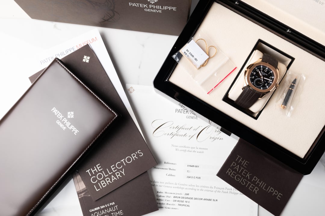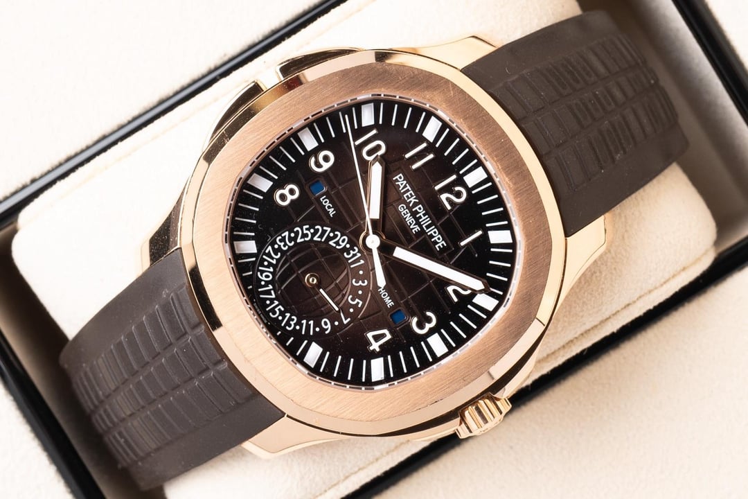 2020 Patek Philippe Aquanaut Travel Time 5164R-001 with Box and Papers $118,550 Touted by Patek Philippe as “the favorite travel companion,” the Aquanaut Travel Time in rose gold houses two timezones (local, and home), with dual pushers on the side of the case for ease of use. Purchased from the original owner, the rose gold case remains unpolished and well defined despite minor signs of wear. Some scratches visible on the high finish surfaces, particularly on the edges of the bezel as well as the clasp. Tiny nicks present towards the edge of the bezel in some areas. The clear sapphire caseback showcases the beautiful movement. The brown rubber strap pairs nicely with the rose gold case, and brown dial. The watch comes as a complete set as purchased. Serial - Year: Movement No. 73***** / Case No. 64***** Bracelet - Strap: Patek Philippe brown rubber strap with original buckle Box - Papers - Accessories: Complete as purchased - Triple boxed (production box, outer box, inner box), cloth box cover, booklets and manuals, pin pusher, original certificate of origin Pictures https://imgur.com/a/5164r-EstgcBE Timestamp https://imgur.com/Ktj7Yw3 Watches will be shipped via FedEx upon receipt of bank wire only. Sorry, no P2P payment platforms due to scams. Zelle with references. Prices are for an outright purchase, no trades preferred. **Inquiries:** [Instagram](http://www.instagram.com/angelcitytime), PM or chat Member of r/watchexchange for years. Excellent references on other platforms and forums which I can provide upon request. Please buy with confidence. All sales are final. Thanks for looking!