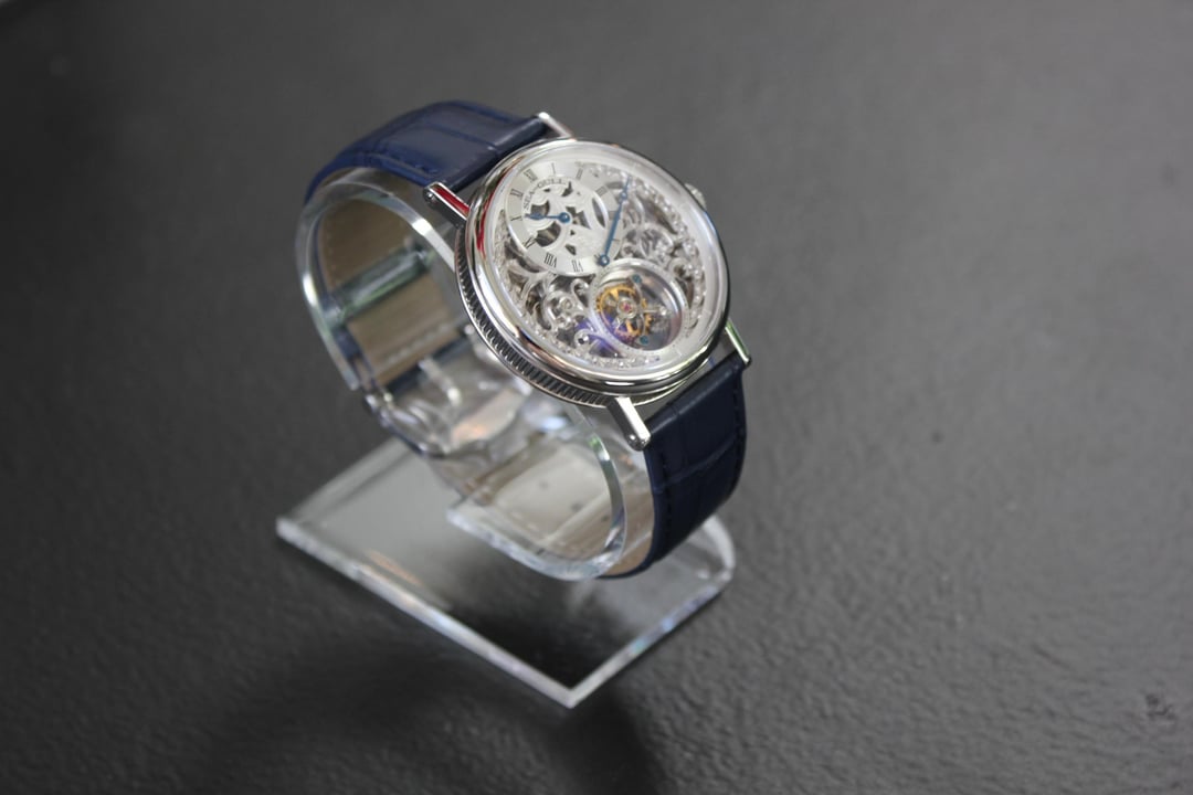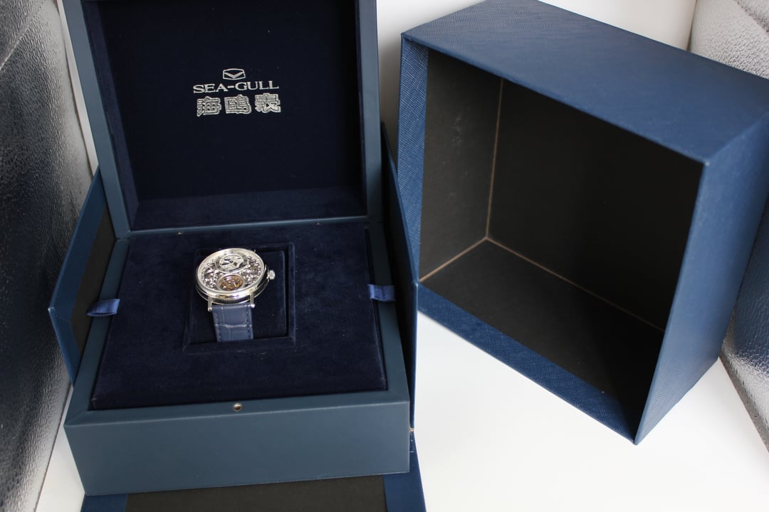 **Summary**: For sale is a Sea-Gull tourbillon model with a hand-engraved, skeletonized dial: model 818.11.8847K. Unlike cheaper skeletonized designs made with quick CNC laser cutting, the production of the skeletonized dial on this Sea-Gull 8847K is more involved. With this model, the cut-outs on the dial are beveled and hand carved to resemble creeping vines. The exhibition case back shows the decorated movement's skeletonized base plate, which is also decorated hand-engraved vines. At 6 o'clock is the ST8006's eccentric tourbillon, which not only (theoretically) provides an overall benefit to accuracy but also serves as a seconds indicator. The 12mm thickness and 39mm case diameter makes this a good choice to wear with suit jackets and dress shirts. This watch comes with "full kit" -- box, papers, manual, etc. **Price**: **$2400** (price reduced from $2450)**.** Shipping is $25 in continental US via USPS Priority Mail, signature required. Local sale in Los Angeles area welcome. I accept Zelle, Venmo, and Paypal (+4%). The $2400 price represents a **$450+ savings** off the lowest available price offered by Sea-Gull, and this watch is like new. **Timestamp**: [https://imgur.com/a/pJQI63M](https://imgur.com/a/pJQI63M) **Edit** \- Full photo album here: [https://imgur.com/a/SSTrh9W](https://imgur.com/a/SSTrh9W) . I have tried to take photos from multiple angles under multiple lighting conditions. **Overall condition**: Like new / extremely light marks on case. Worn a small handful of times -- less than five times. See detail photos for reference. **Case/Dial diameter**: 39mm diameter. **Crystal**: sapphire. **Movement**: Sea-Gull ST8006 **Strap/bracelet**: Sea-Gull OEM blue genuine alligator leather strap. Comes also with Sea-Gull OEM black genuine alligator leather strap. Both fully un-used. **Accuracy**: regulated by Sangamon Watches to to achieve excellent accuracy. The timegrapher photo is a "best case" reading across 1 minute in dial-up position; your experienced accuracy may vary. But the accuracy snapshot gives you a good idea of what to expect--well within the ISO 3159 chronometer standard. **Miscellaneous**: I posted a brief review of this watch on r/Chinesewatches [here](https://www.reddit.com/r/ChineseWatches/comments/1p5p3eb/seagull_skeletonized_tourbillon_model_818118847k/). **Official listing from manufacturer**: [https://seagullwatchofficial.com/products/8847k](https://seagullwatchofficial.com/products/8847k)