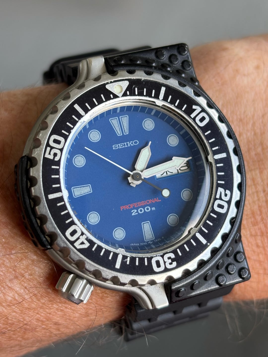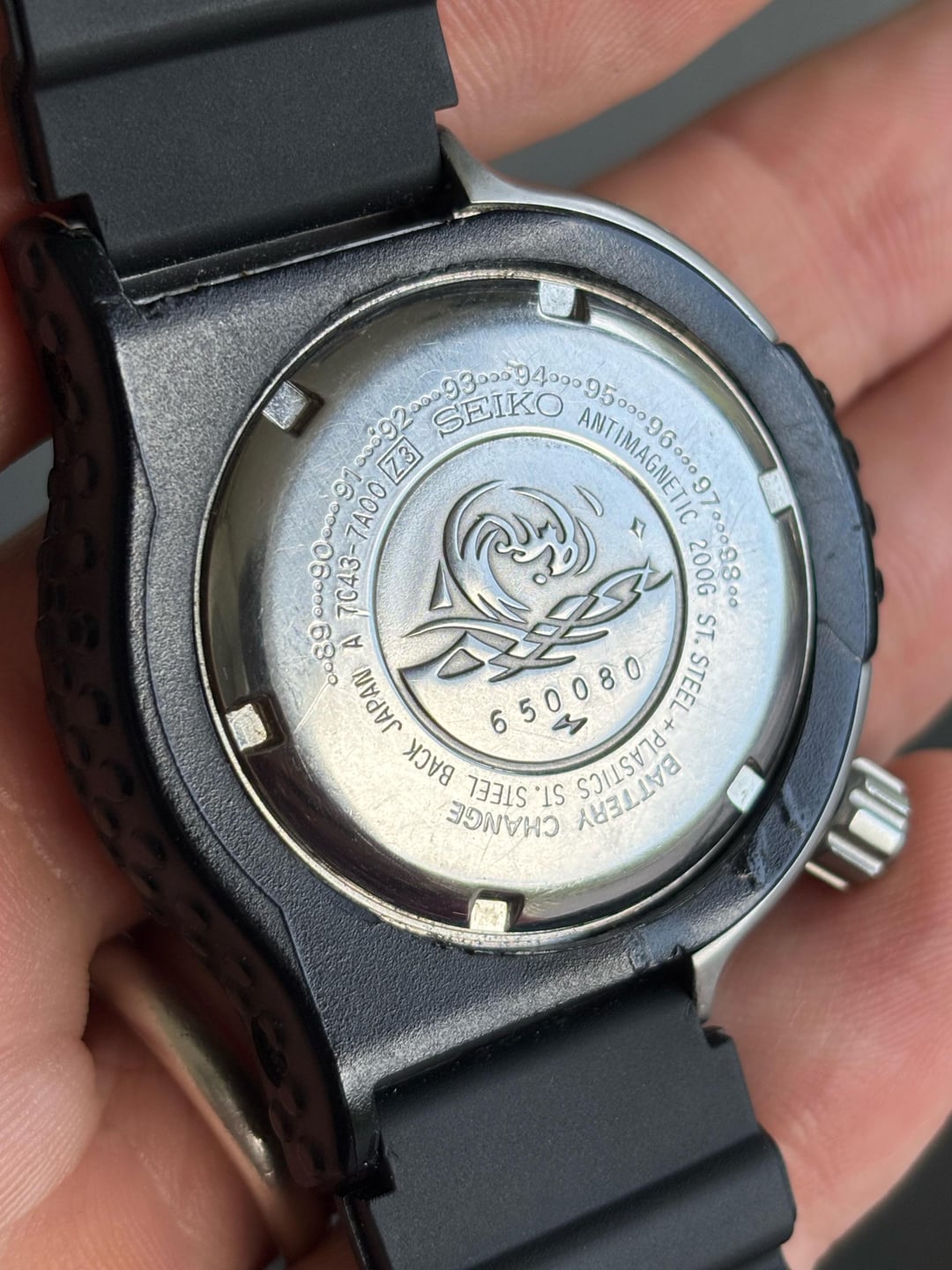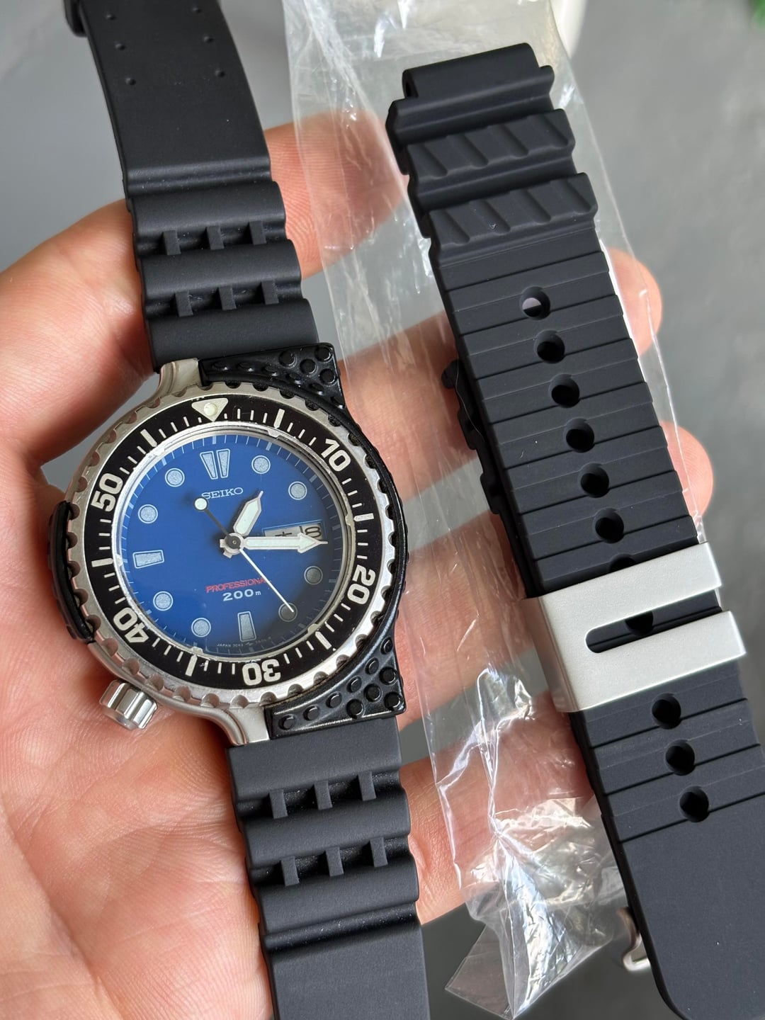 Very rare Giugiaro 7c43 Professional Diver, not the re-issue but the original from May '86. These come up very infrequently and often have broken or missing shrouds. This example has a missing screw and one that is broken off in the case, but is in otherwise good cosmetic condition, with very few marks on the case, bezel and shroud. Its sold on a generic strap that suits the watch well and an unworn OEM strap from 2000's re-issue, which fits the original 16mm lugs. **Case:** 40mm stainless steel case, 16mm lug width and a screw down crown. **Movement:** Seiko 7c43 quartz with day and date, working well with new battery fitted. **Price:** Asking $650. This includes international shipping from Cape Town, South Africa using FedEx, with a signature. Duties and taxes for the buyers account. Payment accepted using PayPal G&S I’m aware that I have no transactions on Reddit, I’ve been selling on eBay (cameronb143) for a few years but things have finally become too difficult on there. My IG account is u/allmyhobbiestogether, where you’ll be able to see this and other watches in my collection.