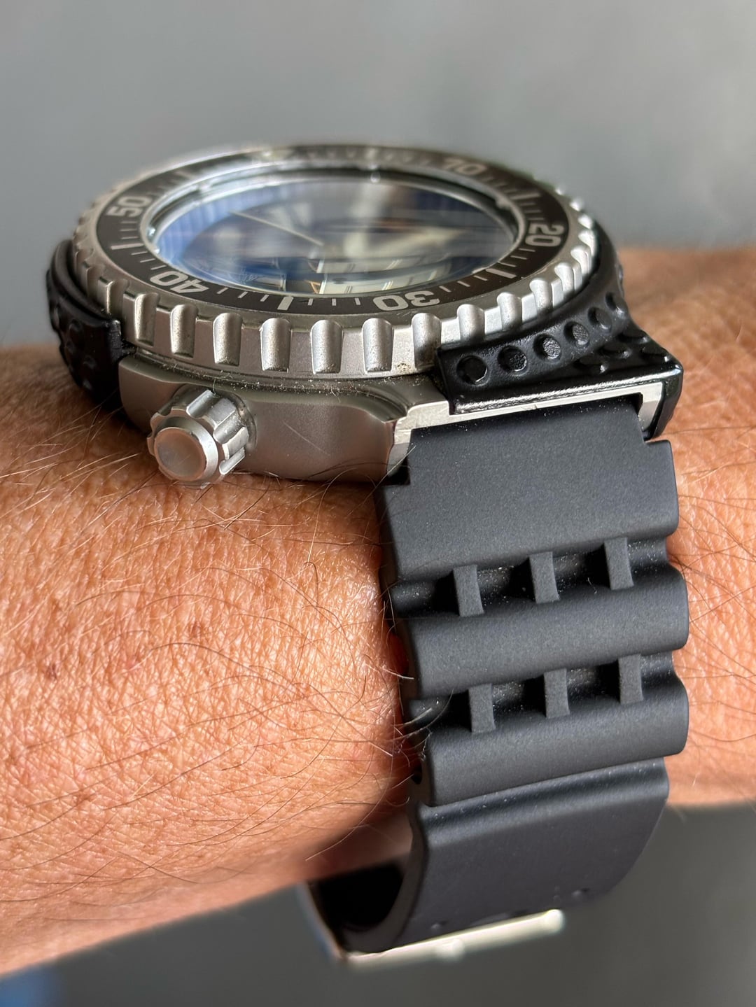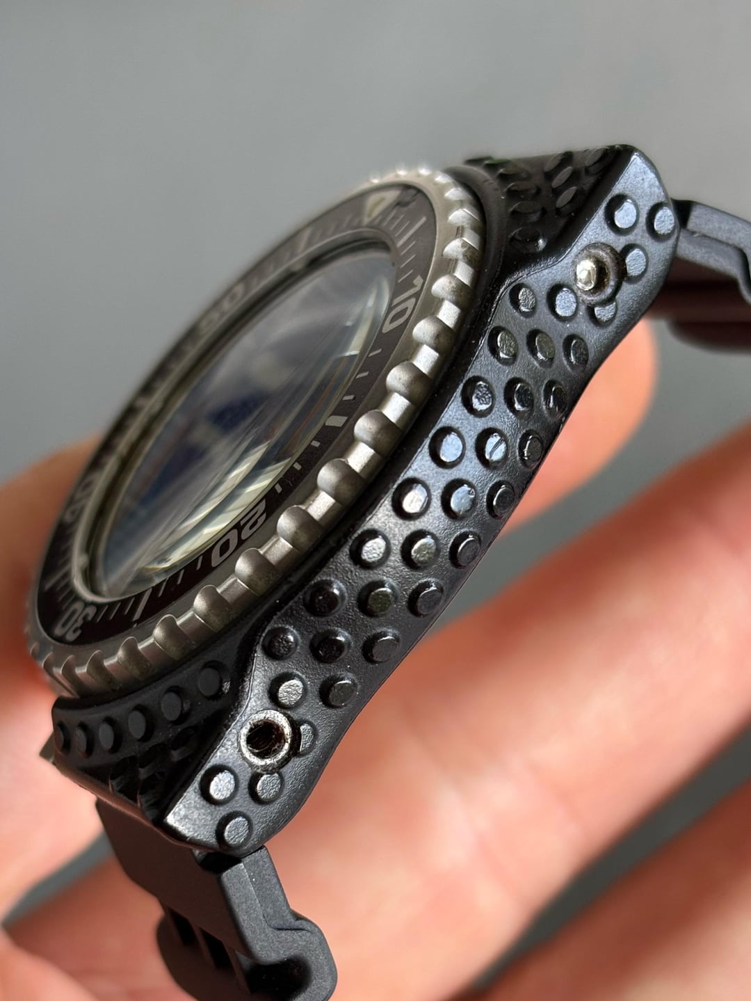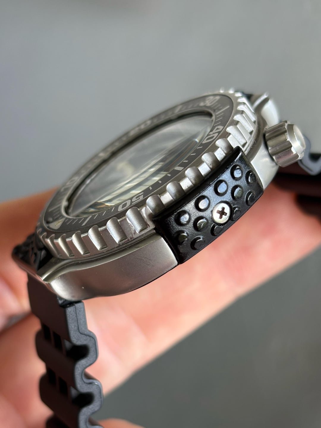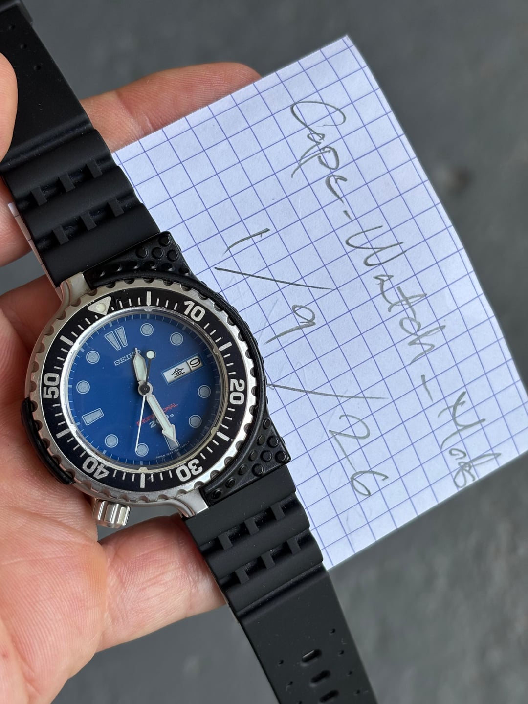 Very rare Giugiaro 7c43 Professional Diver, not the re-issue but the original from May '86. These come up very infrequently and often have broken or missing shrouds. This example has a missing screw and one that is broken off in the case, but is in otherwise good cosmetic condition, with very few marks on the case, bezel and shroud. Its sold on a generic strap that suits the watch well and an unworn OEM strap from 2000's re-issue, which fits the original 16mm lugs. **Case:** 40mm stainless steel case, 16mm lug width and a screw down crown. **Movement:** Seiko 7c43 quartz with day and date, working well with new battery fitted. **Price:** Asking $650. This includes international shipping from Cape Town, South Africa using FedEx, with a signature. Duties and taxes for the buyers account. Payment accepted using PayPal G&S I’m aware that I have no transactions on Reddit, I’ve been selling on eBay (cameronb143) for a few years but things have finally become too difficult on there. My IG account is u/allmyhobbiestogether, where you’ll be able to see this and other watches in my collection.