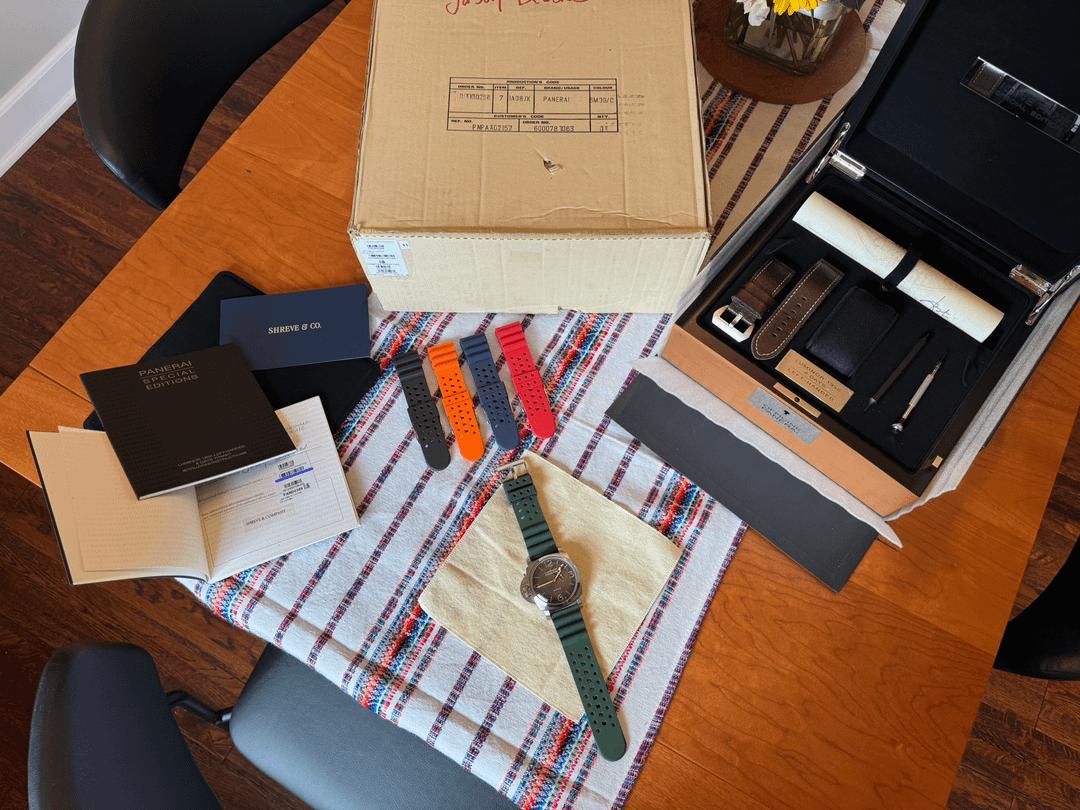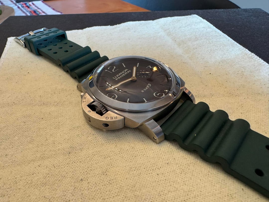 Passing along my gently used PAM00368 8 Day Titanium Destro. New to posting here, but many years of experience/feedback on WUS and the Bay. Sale includes the full B&P (including original receipt of purchase), OEM strap and buckle, and 5 aftermarket FKMs that I primarily wore the watch on. The watch is in excellent condition as can be seen from the photos. No major signs of wear, some hairlines on the case. Everything functions as expected, no issues with the lug pusher system or seconds-reset function. Gently wore it for \~6 months on and off, mostly off as I literally don't leave my house 5 days a week. Thus, having a hard time reconciling keeping it. Asking $8,250 + label within the continental United States.