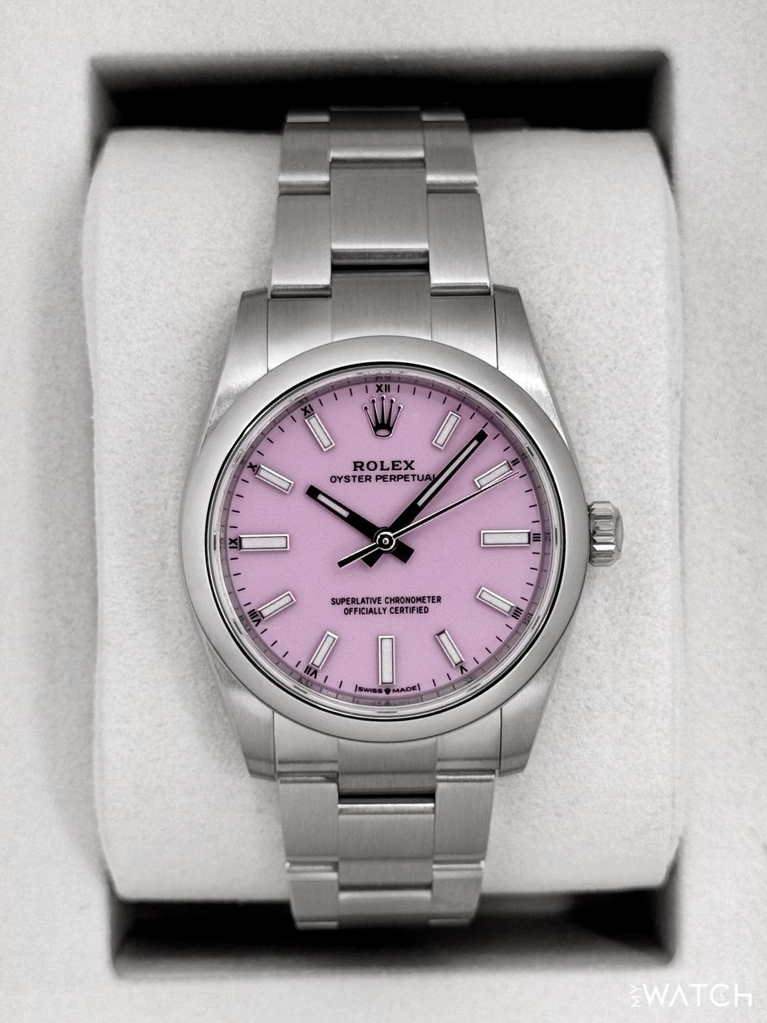 🔵**NEW 2025 Rolex Oyster Perpetual 34mm 124200 Stainless Steel Oyster Bracelet Candy Pink Dial** 🔵**TRADE or SELL us your luxury watch, all brands considered. Message me details.** **Includes the following:** **✔️BRAND NEW 2025 UPDATED ROLEX BOX (Double Boxed)** **✔️Box and Papers - Yes** **✔️Warranty card dated 2025** **✔️5 year manufacturer warranty** **✔️Manual and Warranty booklets** **✔️Green Hang Tag included** **✔️Size: 7.25inch wrist (Full Links)** **✔️Watch is BRAND NEW/UNWORN** **✔️**[**Trades**](https://mywatchllc.com/pages/sell-rolex-watch) **welcome** Business Name: **My Watch LLC** LOCATION: Oak Park, Michigan ✔️[MyWatchLLC.com](http://mywatchllc.com/) for current inventory ✔️Google Business Listing [https://g.co/kgs/Cmd6FPW](https://g.co/kgs/Cmd6FPW) ✔️Business Hours M-F 9-6 ✔️Facetime/Video chat/calls welcome to view the watch interested. ✔️Contact: 248-422-0909 via text or call for quickest response. 🟢TERMS: Visit [MyWatchLLC.Com](http://mywatchllc.com/) for payments accepted 🟢REFERENCES/REVIEWS: We are well reviewed on all platforms from google, trust pilot, rolexforums, additionally we have 300+ reference in multiple FaceBook watch groups, reference checks welcome. 🟢SHIPPING: If you are not local, we offer Fully Insured FedEx overnight shipping in the USA for a fee. International shipping available. [https://mywatchllc.com/products/new-2025-rolex-oyster-perpetual-34mm-124200-stainless-steel-pink-dial](https://mywatchllc.com/products/new-2025-rolex-oyster-perpetual-34mm-124200-stainless-steel-pink-dial)
