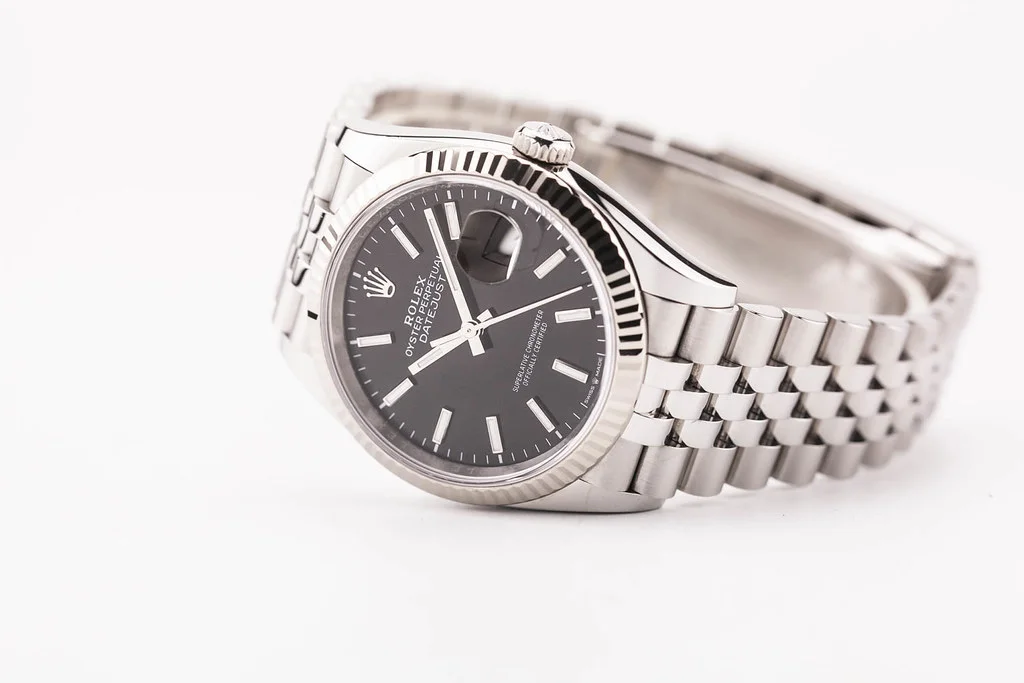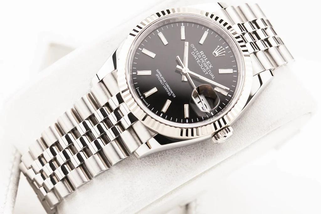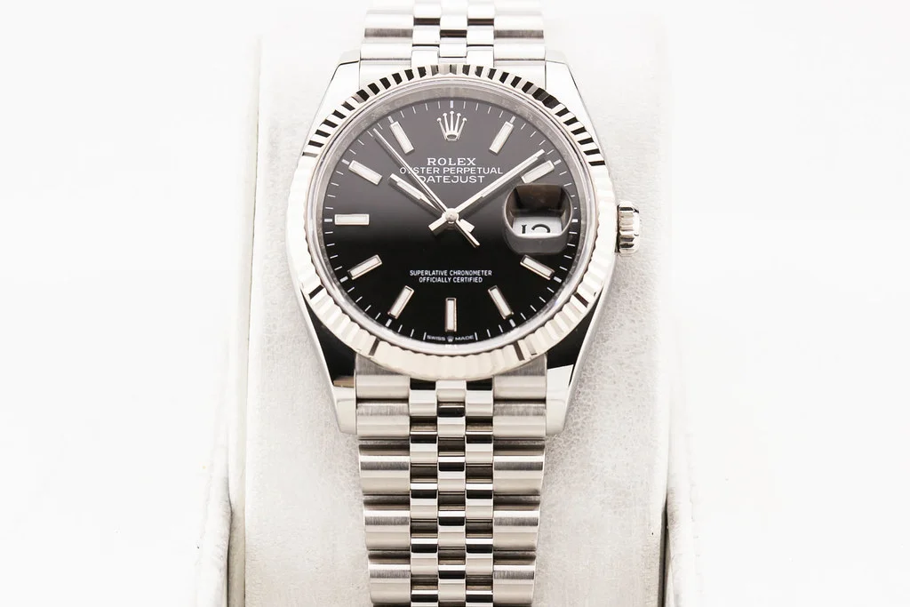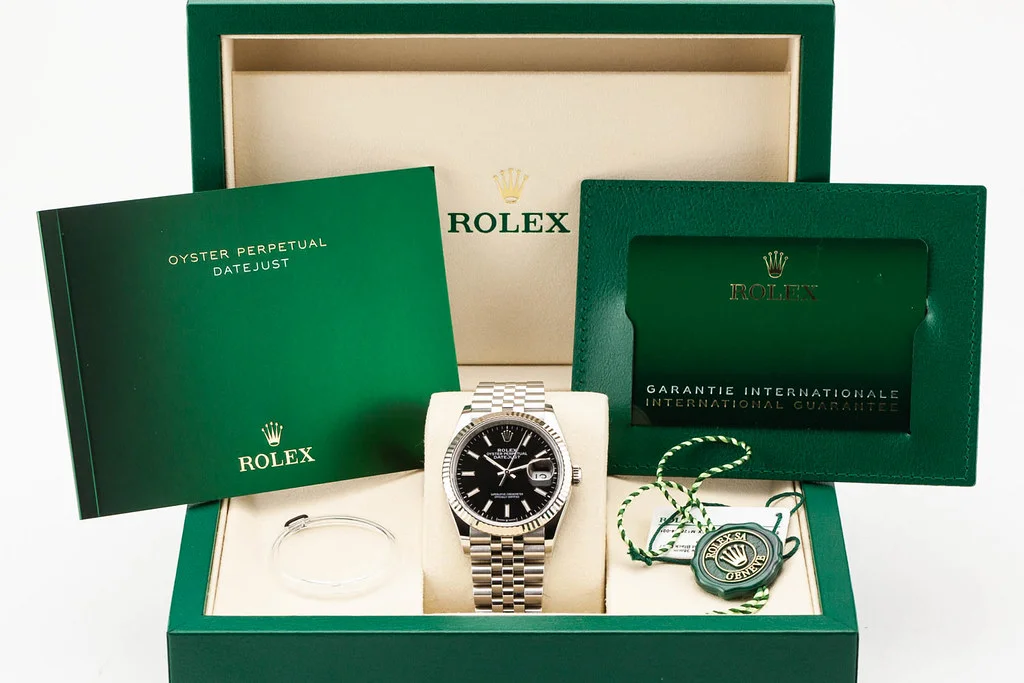 Up for sale is an excellent condition Rolex Datejust 36 Black Stick Numeral Dial Fluted Bezel on Jubilee Bracelet, reference # 126234 It comes with all newly redesigned boxes, papers, booklets, hang tags, bezel guard and Rolex Warranty Card dated July 2025.