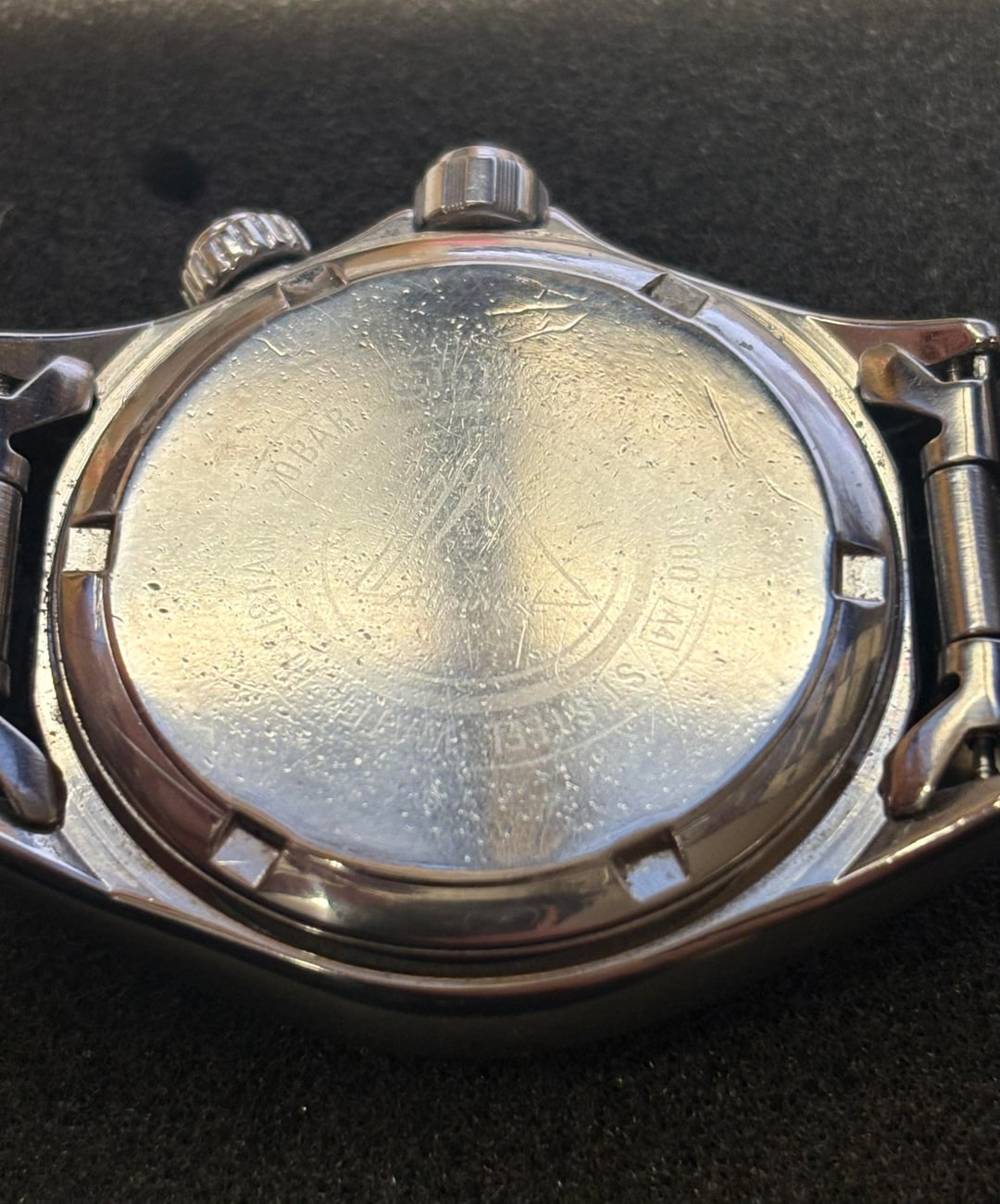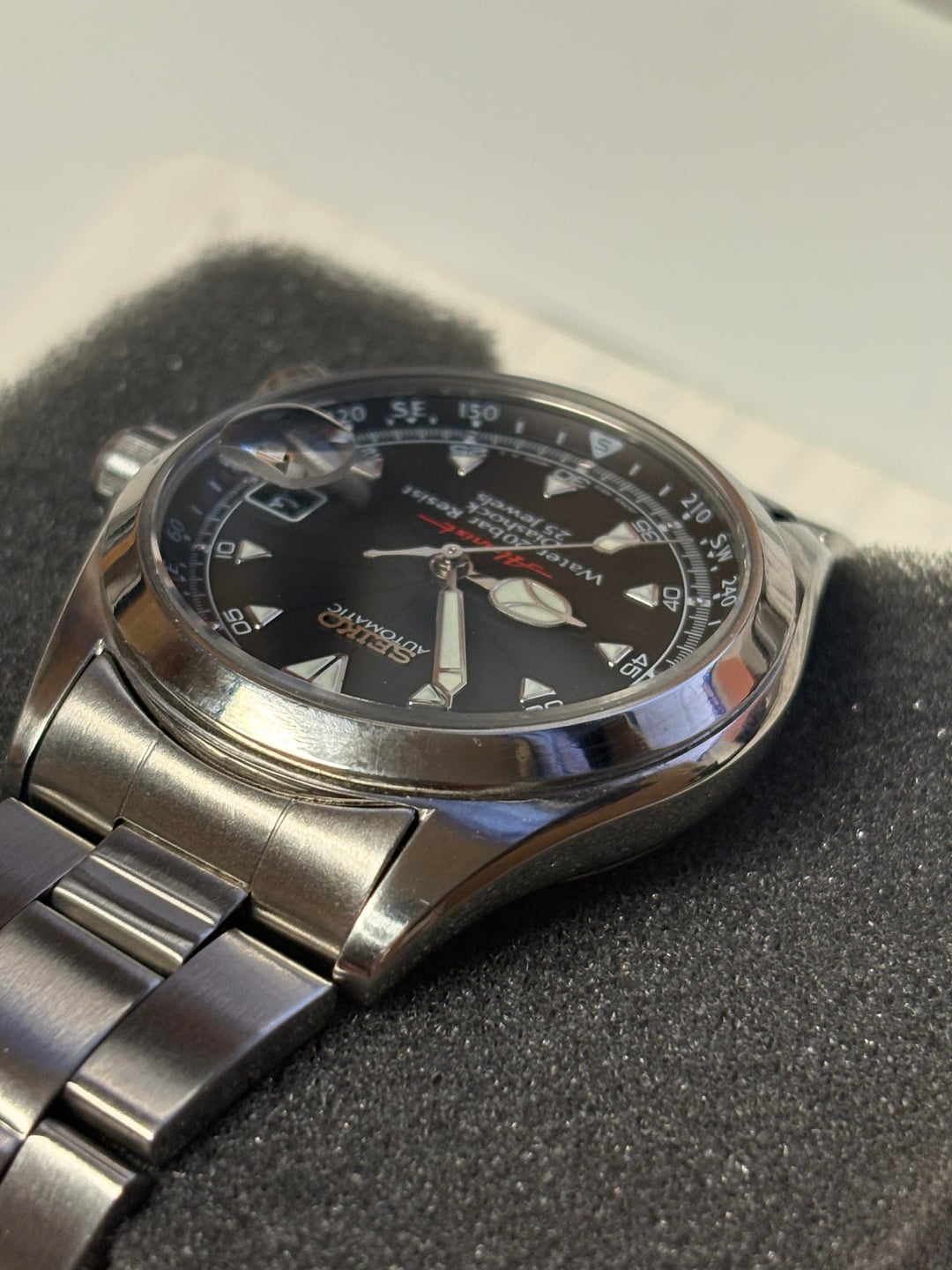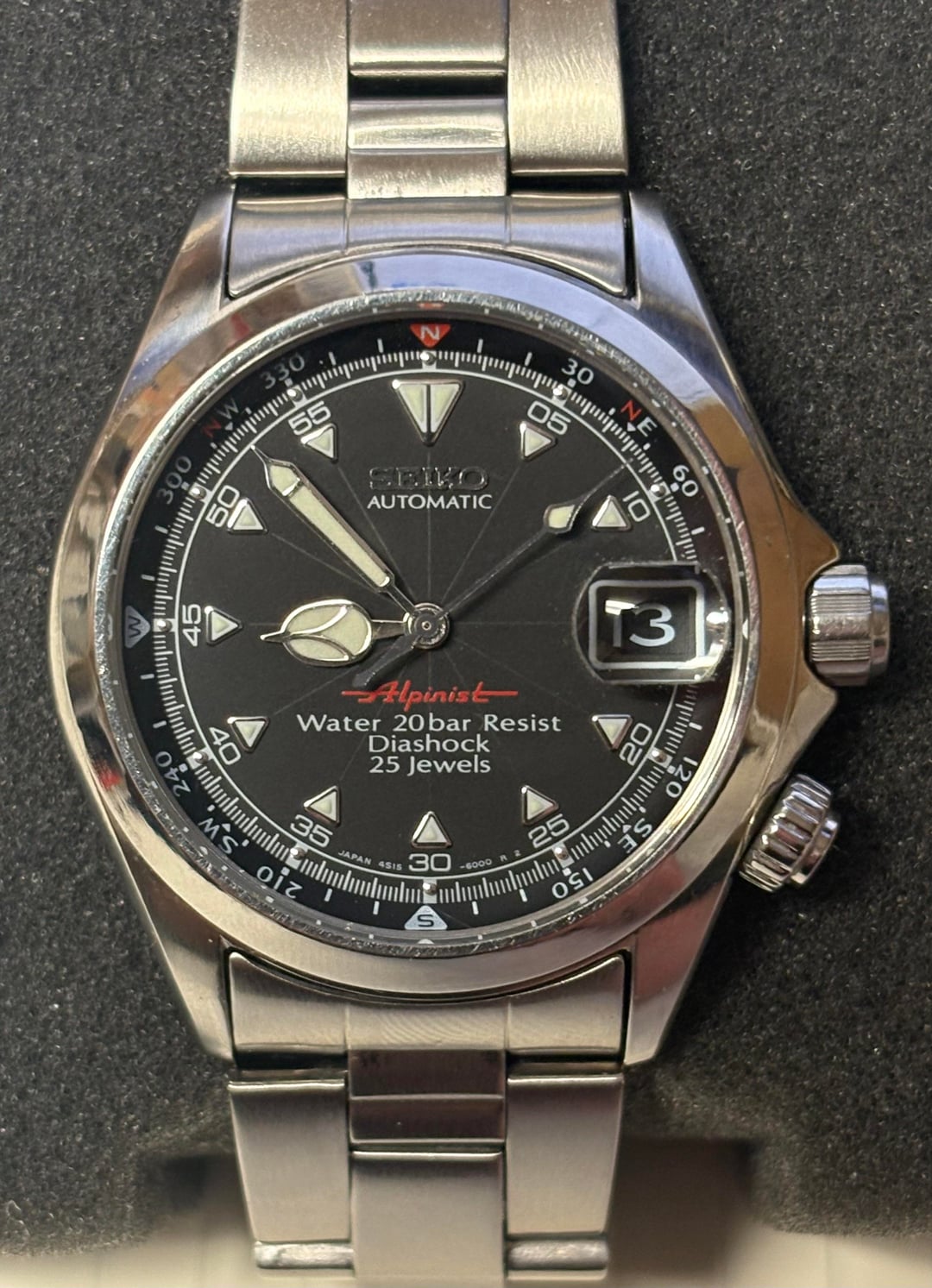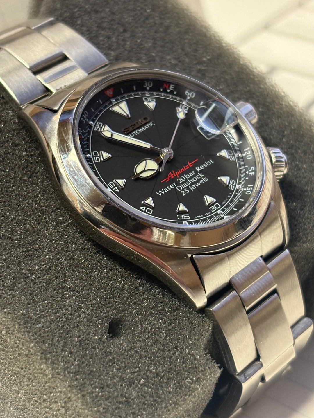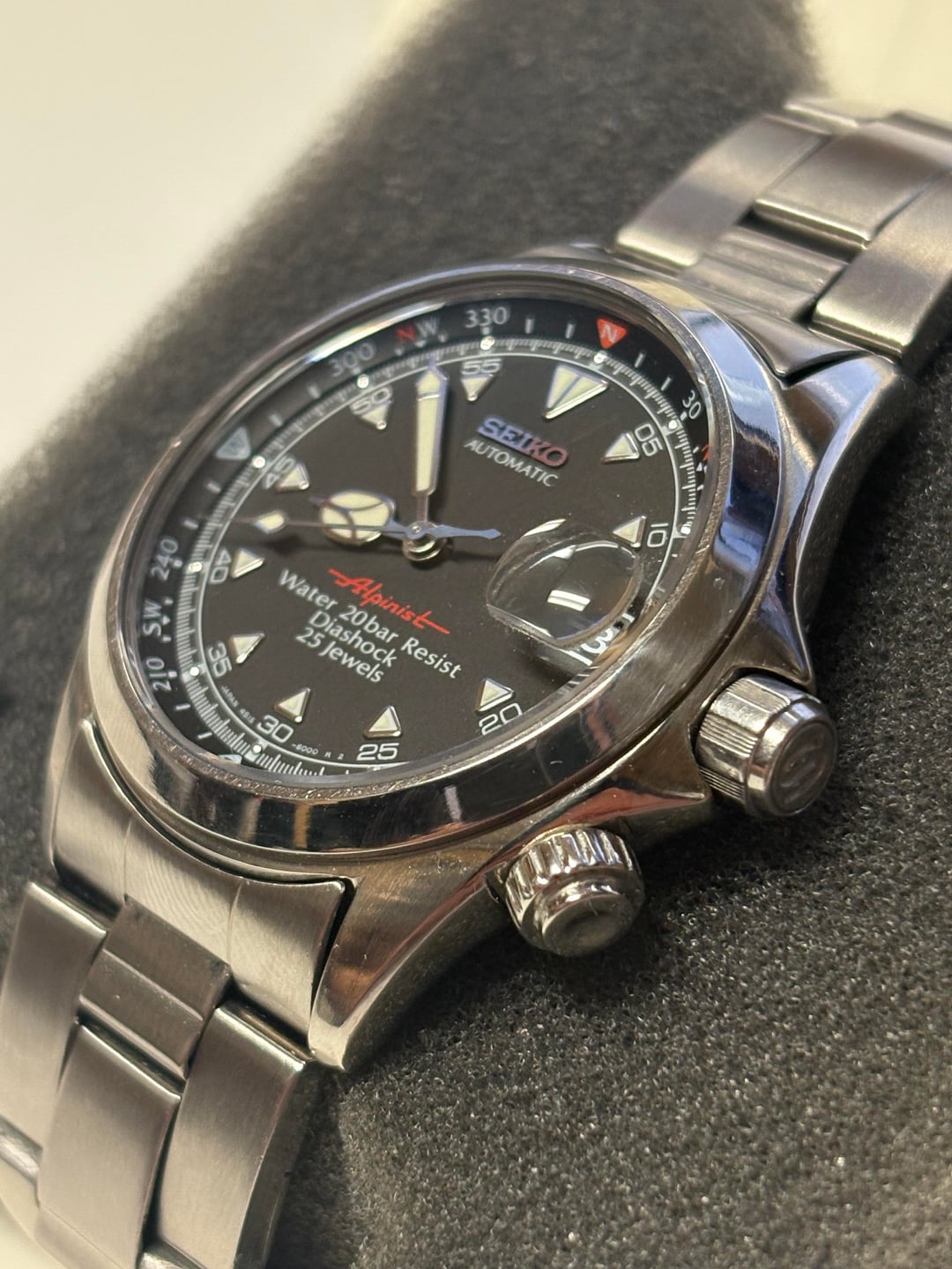 For your consideration: Seiko “Red” Alpinist, SCVF005 I purchased this watch last year and have worn it daily for the past couple of months. Some minor blemishes but in overall good condition, especially for its age. One noticeable scratch on the crystal, near the South arrow / number 30 marker. The crown feels a little loose but only when unscrewed and it doesn’t affect the winding or adjusting of date & time. Caseback is somewhat faded but the Alpinist branding is still visible. Watch keeps time well and everything functions as it should: inner bezel, time/date functions etc. Comes on original bracelet. Sapphire crystal is a replacement. Case size: 37mm Lug width: 19mm Asking $800 shipped. Zelle preferred. Venmo/Paypal G&S is okay as well (buyer pays fee). Watch only. Sold “as is” with no warranty expressed or implied. No returns. Feel free to reach out for more pictures and/or videos.