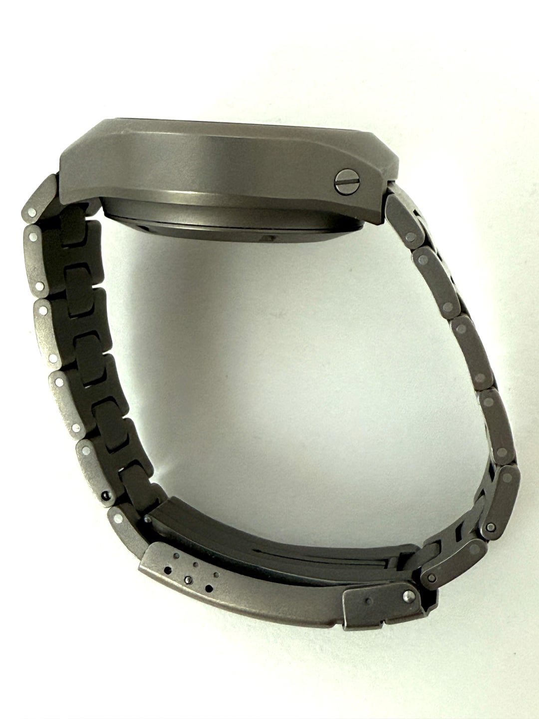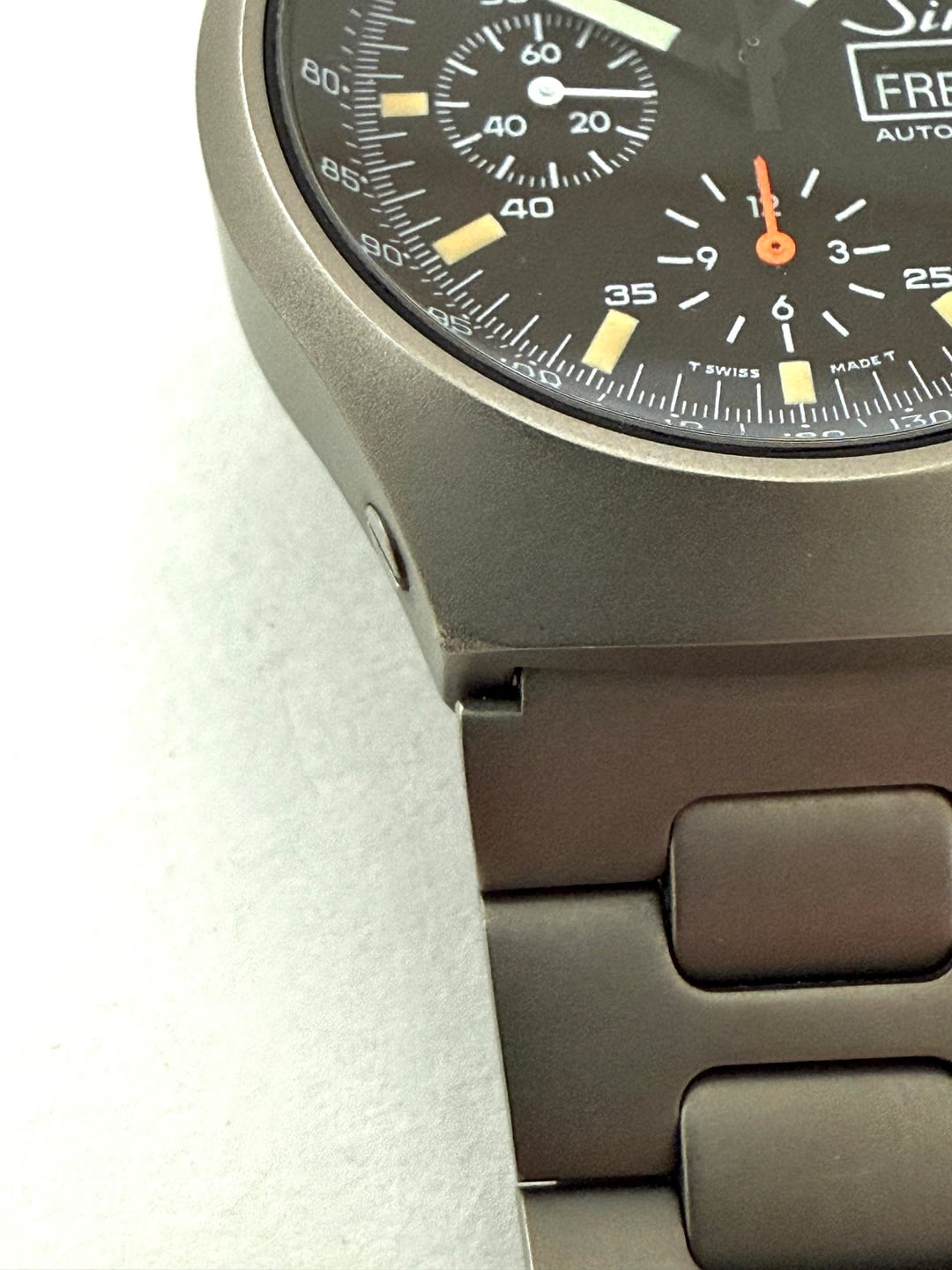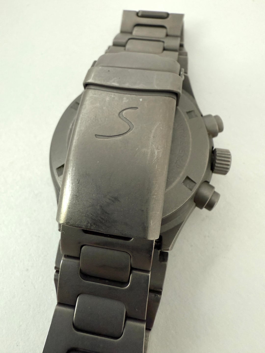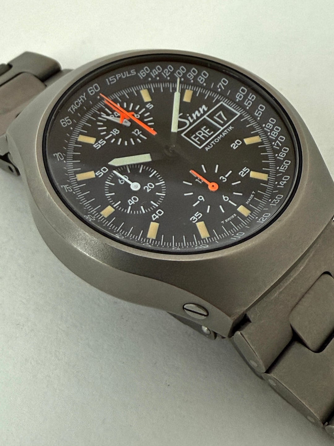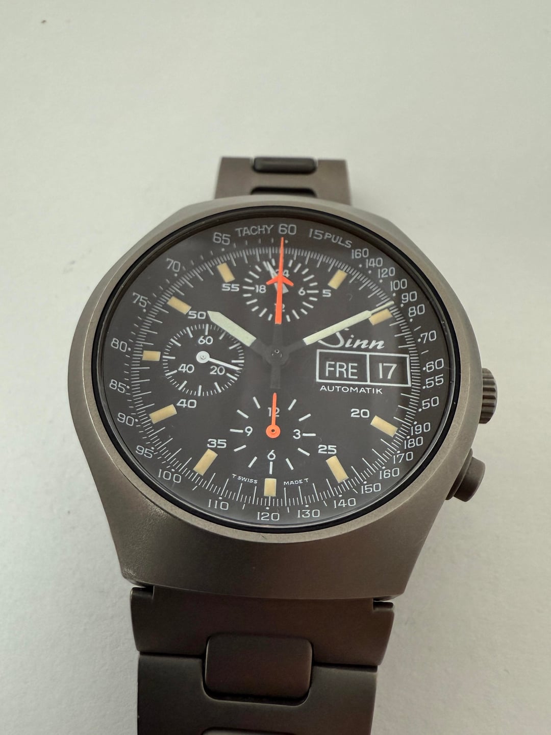 FS: SInn 157 Ti Ty. $2300. These things are seriously hard to beat for uniqueness and cool factor. Titanium 157’s are rare enough, but I waited forever to find specifically this vintage because: 1. 2005 is a sweet spot for these because you get tritium lume but the superior D3 pushers for water resistance (and yes, they look cooler) 2. Being newer, the blasting is still intact - most Ti’s are pretty polished if not scratched up with age, this one looks great. Part of a much bigger Sinn collection, so worn sparingly! Keeping excellent time with all functions of the seven-hand Lemania 5100 working as they should. Some small scuffs on the clasp (shown). Small ding on lower left lug that’s very hard to see when wearing. Any additional pictures just ask.