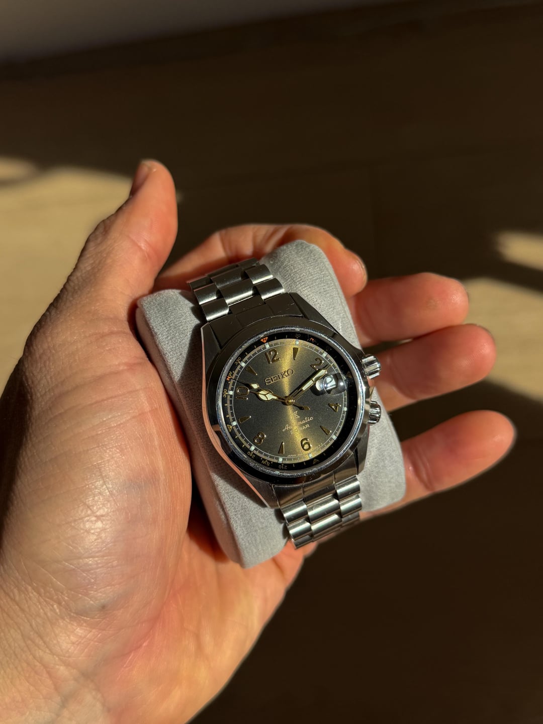 selling a Seiko Alpinist spb209j1 Sunbeam Forest Brown. Awesome sunburst dial that looks brown or olive green. My favorite Alpinist colorway. Comes with uncle Seiko Lincoln Bracelet with extra links as well as the OEM unworn leather strap. Great condition with very minor micro scratches on some polished surfaces. $600 shipped CONUS.