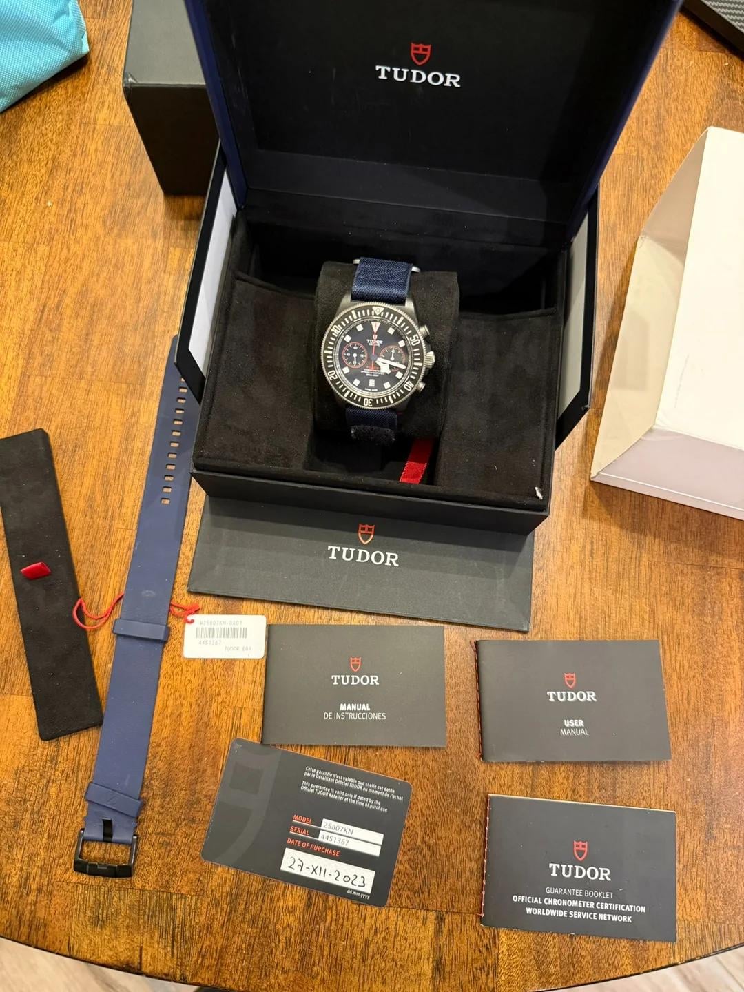 [Timestamp](https://i.imgur.com/4X5ML2p.jpeg) **Who am I ? I'm a watch nerd that buys and sells a lot of watches. You can find me** **on Instagram** [**HERE**](https://www.instagram.com/ryansrolexes/) **and on Facebook** [**HERE**](https://www.facebook.com/profile.php?id=61576924864004)**.** **I'm happy to facetime, send you more photos and videos. I'm based in North Texas and have a private meeting area in Frisco if you'd like to see this in person.** Brand: Tudor Reference: 25807KN Model: Pelagos Fxd Chrono Material: Carbon Bracelet: Fabric ( and rubber) Size: 43mm Dial: Blue Bezel: Titanium Year:2023 Condition: Preowned (Worn) Paperwork: Yes Service papers: No Box: Yes Movement: MT5813 Crystal: Sapphire Water Resistance: 20 ATM Warranty: Factory Warranty Comes as a full set **$3,600 Open to trading up**