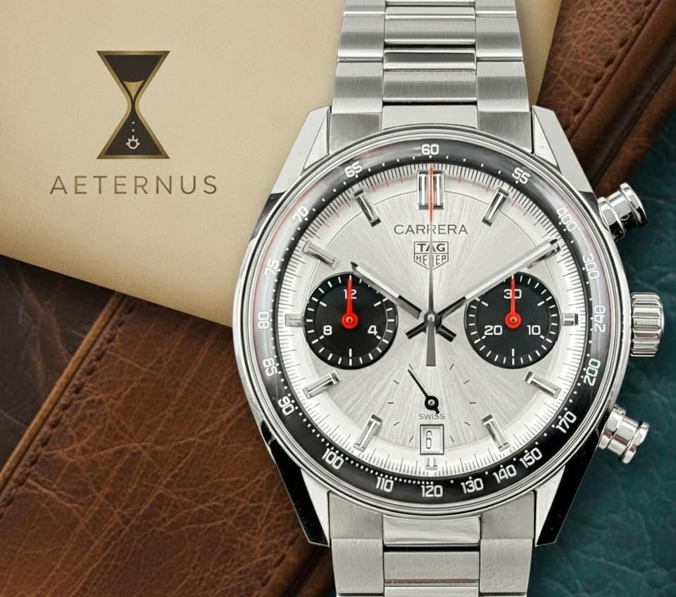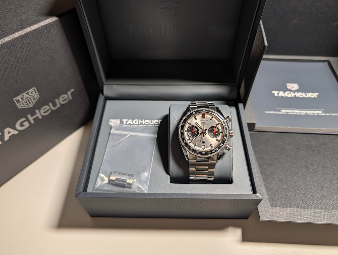 **Reference:** CBS2216.BA0041 **Full Set:** Box, Papers (Factory warranty through 2030), Hangtag, All Bracelet Links If you’ve been hunting the modern “Panda” chrono done right, this Carrera **GlassBox** delivers. The **TH20-00** is the real deal: column wheel + vertical clutch, with an **80-hour** reserve, wrapped in that double-domed sapphire that makes the dial pop from every angle. # Technical Specifications * **Movement:** In-house Calibre TH20-00 (Automatic) * **Chronograph:** Integrated chronograph with **Column Wheel** \+ **Vertical Clutch** * **Power Reserve:** 80 hours * **Case Diameter:** 39mm * **Lug-to-Lug:** 46mm * **Crystal:** Double-domed “GlassBox” sapphire w/ anti-reflective treatment * **Dial:** Silver sunray brushed dial with contrasting black “Panda” sub-dials * **Water Resistance:** 100m * **Bracelet:** Stainless steel H-link with folding clasp + double safety push-buttons # Condition Report * **Overall:** Very Good * **Case:** Excellent condition with minimal signs of wear * **Crystal:** Flawless; no scratches or chips * **Bracelet:** Light desk-diving marks on the clasp; **all original links included** * **Warranty:** Factory warranty active through 2030 # Transaction Details * **Retail Price:** $7,250 * **Asking Price:** $4,975 * **Payment:** Wire or Zelle * **Shipping:** FedEx insured shipping included for CONUS * **Location:** San Antonio Please DM for additional photos or video of the movement/chronograph functions. Timestamp: [https://trugrowth.notion.site/TAG-Heuer-Carrera-GlassBox-Panda-Ref-CBS2216-BA0041-2cbacf6eb9558003a02ad3c2cba2036a?source=copy\_link](https://trugrowth.notion.site/TAG-Heuer-Carrera-GlassBox-Panda-Ref-CBS2216-BA0041-2cbacf6eb9558003a02ad3c2cba2036a?source=copy_link)