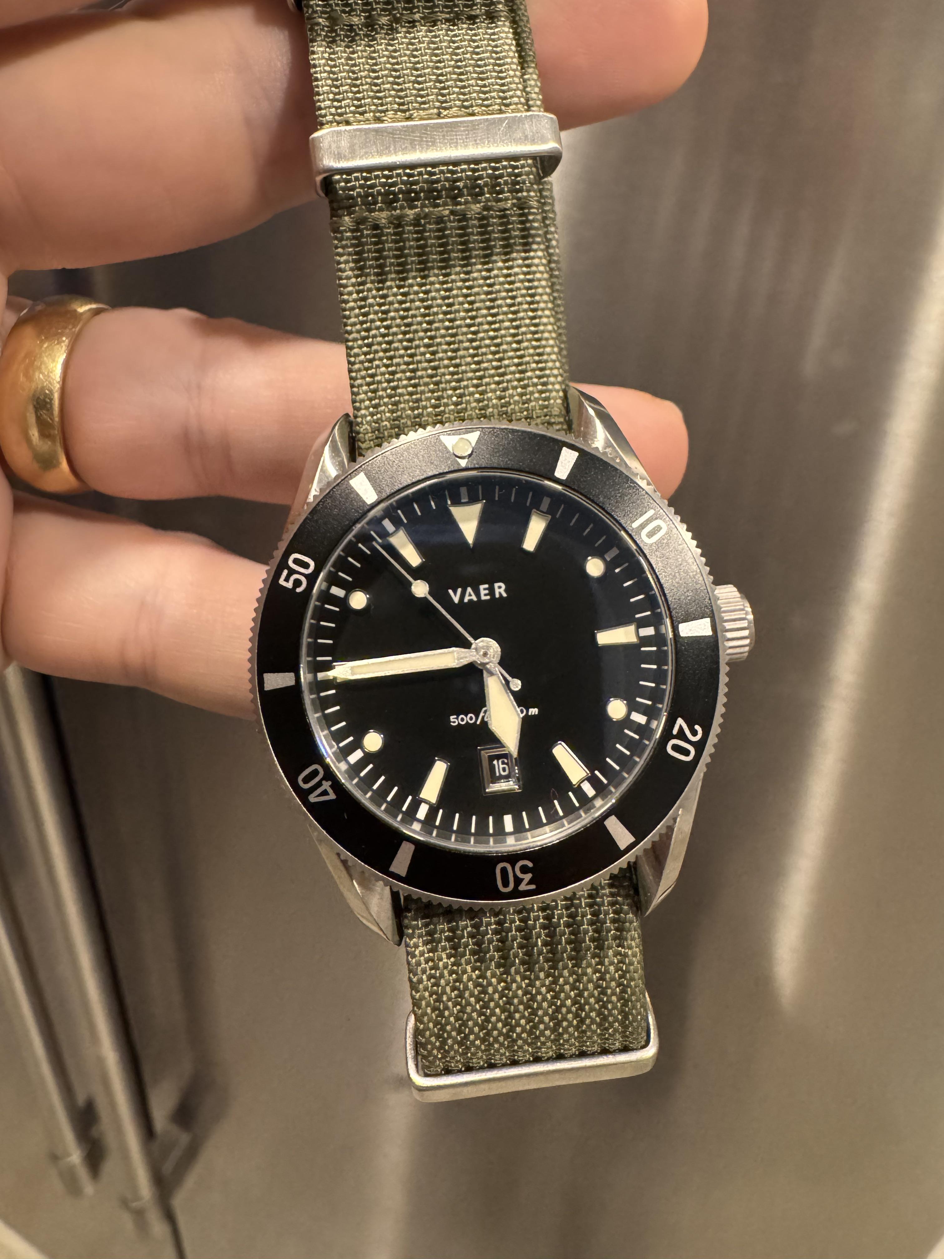 Bought new by me last month. 39mm version, sapphire crystal. Very well made and it has great lume. Comes with the black silicone strap, khaki nylon strap, and also an olive green thick NATO strap I bought extra. Great watch, but I bought 2 watches on the same day and decided I only wanted to keep one, so this one is for sale. Worn less than 10 times. Price from Vaer is $239 for the watch and $30 for the NATO strap. **I’m selling for $195 delivered in the USA only.** Album with timestamp: https://imgur.com/a/Qj3ToeF Edit: I just realized my timestamp says 1/16/25 and not 26 🤦 so if anyone wants a corrected timestamp I’ll make a new one when I get home from work tomorrow.