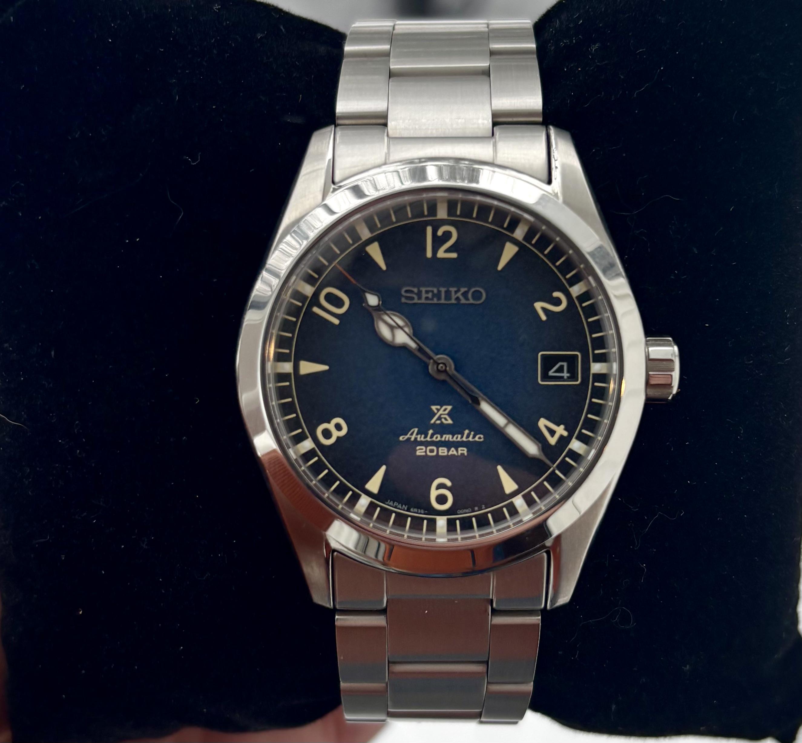 Hi All, I’m offering my Seiko SPB157 Prospex “Baby Alpinist” with the beautiful blue gradient dial. The watch is a great everyday watch, rugged enough for the field and sized right to fit under a dress shirt cuff. It comes on the Seiko M0TZ111J0 stainless steel bracelet, an additional accessory for this line, all links included. (currently $180 on Seiya Japan). Original blue leather strap is unworn and included. Included: Outer Box, Inner box, Manual, Unsigned Warranty Booklet and Card, Hang tag, original unworn blue leather strap, authentic Seiko M0TZ111J0 bracelet for the 38mm Alpinist line. Timestamp: [https://imgur.com/a/spb157-timestamp-VPEXnnD](https://imgur.com/a/spb157-timestamp-VPEXnnD) Gallery: [https://imgur.com/a/spb157-baby-alpinist-c1W3iM3](https://imgur.com/a/spb157-baby-alpinist-c1W3iM3) Condition: Extremely clean. No marks or scratches on crystal, bezel, or case. Some small desk diving scuffs on bracelet back of wrist. Case: Extremely comfortable polished stainless steel case with see-through caseback and a screw-down crown allows easy operation. 38mm diameter, 12.9mm thickness, 46mm lug to lug. 200m WR Curved sapphire crystal with inner AR coating. 20mm band size Movement: Seiko 6R35, 70-hour Power Reserve, 24 Jewels, Date at 3 o’clock. Price: $690 net of any fees Shipping: Free Priority Mail CONUS. Can discuss international. Payment: Pay Pal, Venmo