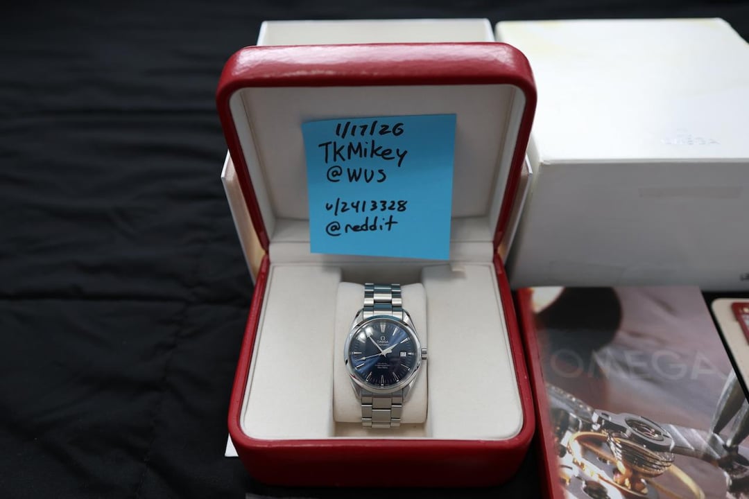Watch: Omega Seamaster Aqua Terra Reference: 2503.80.00 Condition: 8/10 - good preowned condition. Watch is from 2006 so it does show signs from normal use but has no major dings or dents and functions as it should. Keeping excellent time at around +1 sec/day. Movement: Omega 2500 (Chronometer) Crystal: Domed scratch‑resistant sapphire crystal Case: 39.2mm Dial: Blue sunburst WR: 150M Box & Papers: Yes, includes original box (shows signs of age), hang tag, extra link, original operating manual, original international warranty card dated in 2006, and ebay authentication card. Watch is currently sized to a 7" wrist. Price: $3800 shipped within the CONUS. PayPal (Friends & Family or add 4% for G&S) or Zelle only. No trades. Shipping within the CONUS only. Please don’t hesitate to reach out with any questions. Price is firm. This is also listed on eBay under the username mclasssales. Thanks for looking!