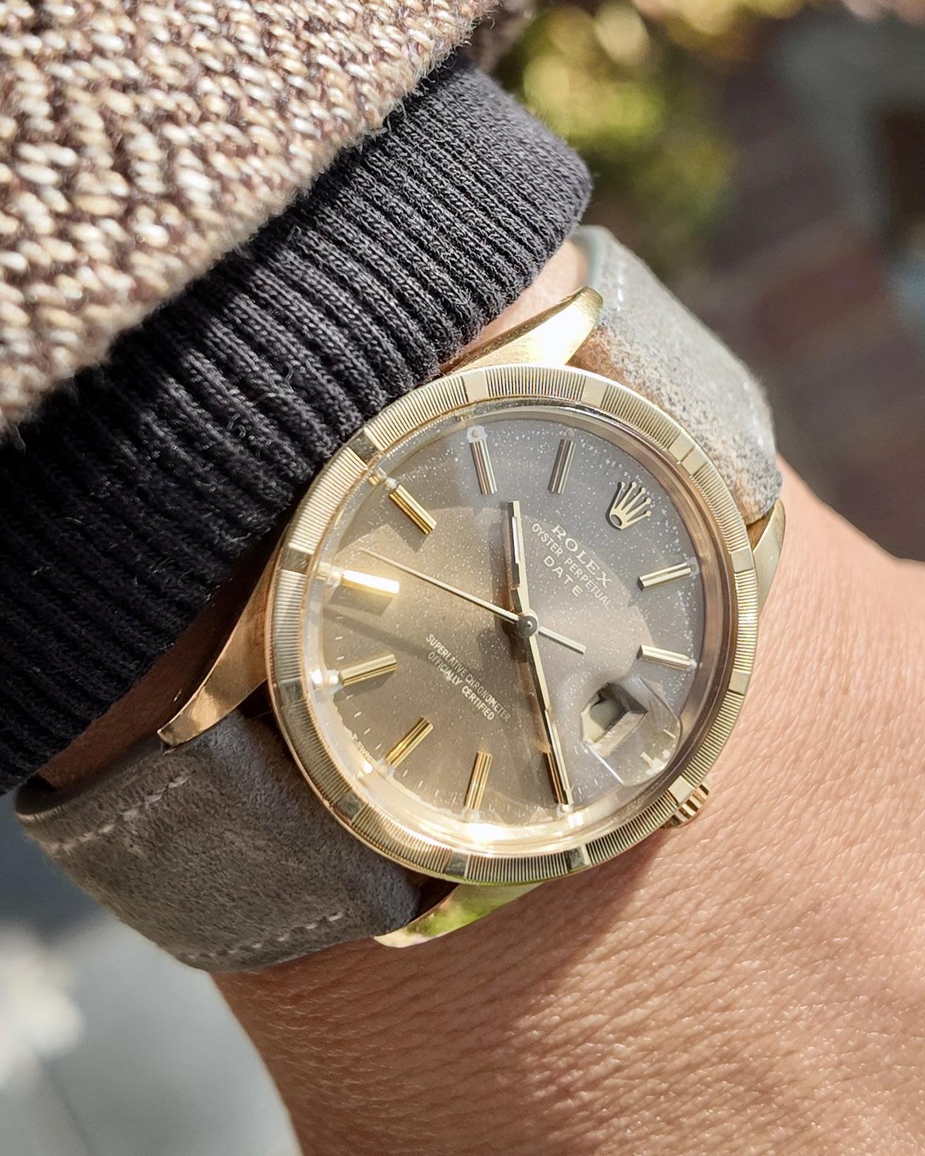 Rolex Oyster Perpetual Date 14k solid gold ref. 15017 circa 1986 A solid gold Rolex…mic drop. During the 1970-1980s, 14k gold we the most precious metal that would be imported into the States but to import taxes—therefore—we know this piece was intended for the USA market and stayed stateside. We point his out as the Day Date 1803 is an 18k creation. The 1500 series is arguably a perfectly proportioned piece and clearly inspires the modern popular OP series today. This 15017 features an engine turned style gold bezel (similar to the steel 15010) and it frames a lovely patina’d metallic toffee colored dial that will ghost in certain angles. Overall, the watch appears to have minimal signs of polish as all the factory finish and textures are distinguishable. On the back of the watch, the marks are the gold hallmark stamps and there are also marks where the original bracelet sat. While no service history, the watch looks very healthy on timegrapher and quickset snaps like it should. The quickset occasionally sticks ever 14-15 days but can be manually advanced. Does not stick just normal wear. ____________________________________ • specs: 35mm case (measuring 8-2) and 34mm if only measuring bezel X 19 lug width X 42h (lug to lug) X 12.5cc including acrylic • Timestamp videos, timegrapher: https://drive.google.com/drive/folders/1f2Ka3SIojb-Ph7F0xbzv6DCEBz-pIC48 • Straps: comes with 2 suede straps grey and olive—not Rolex • no box or papers • 911…serial # _____________________________________ ________________________________________ * video is the best way to view the watch if in-person test drive is not available. Due to the different characteristic of the cameras and gadgets used, the color of the watch you purchase may not be the same as shown on this website or on our Instagram. * will consider trades that make sense but please consider time, shipping, and trade value—not market. * local special: can possibly accommodate at ButterScotch in Downtown Long Beach by appointment * All sales final unless the watch is misrepresented or lost in transit (always fully insured) * Link to [feedback here](https://www.reddit.com/r/WatchExchangeFeedback/search?q=soycowboy&restrict_sr=1&sort=new) & [watchcharts here](https://watchcharts.com/repcheck/user/soycowboy?source=reddit&type=feedback) * Asking a *negotiable* **$5999** via Zelle, venmo, or possibly PayPal Friends & Family with super strong references or if I know you. Price includes fully insured Fedex shipping in the USA— hand delivery in most of the Los Angeles or Orange County areas with drinks or coffee on me ;). Cheers, Stephen