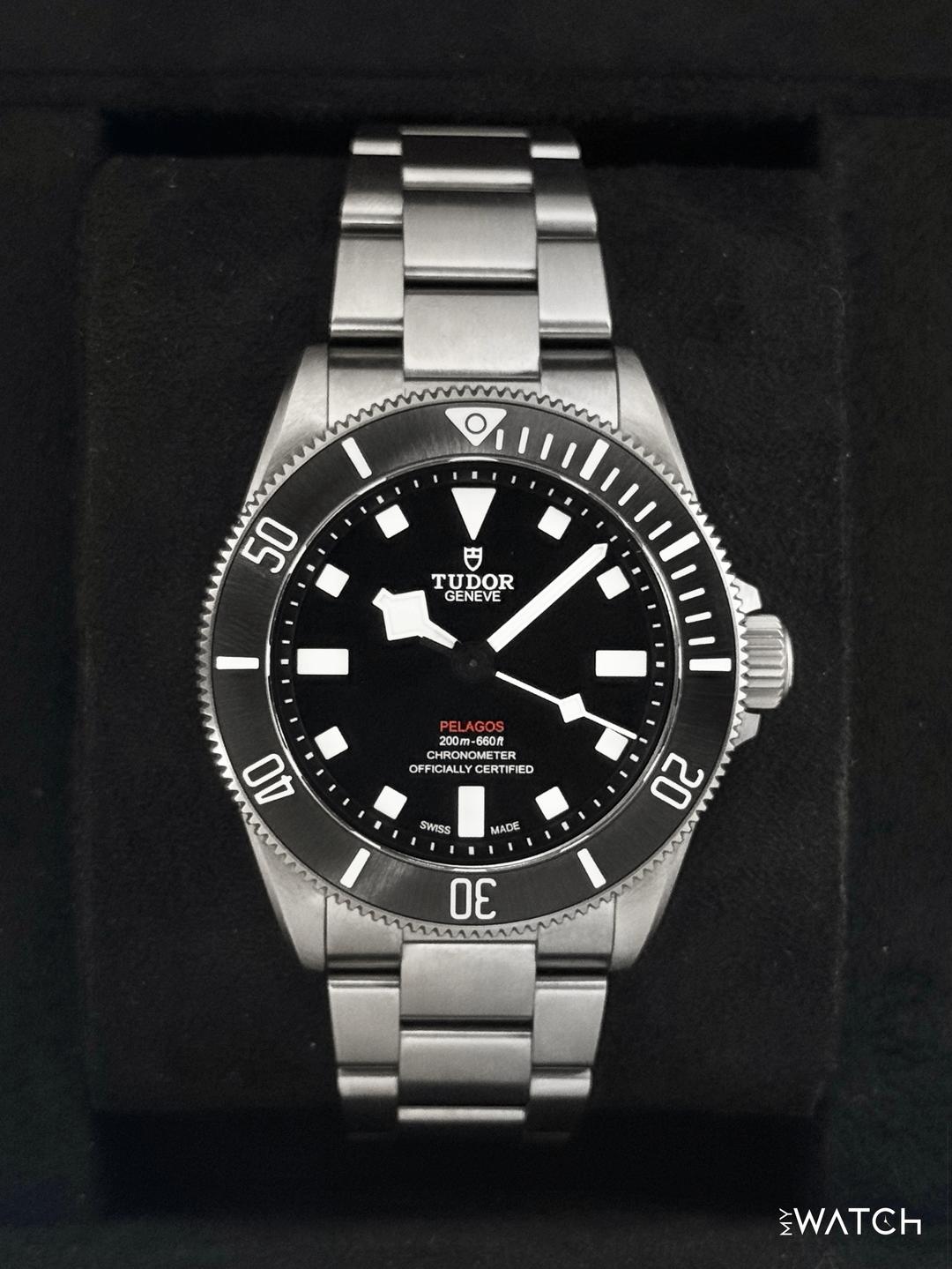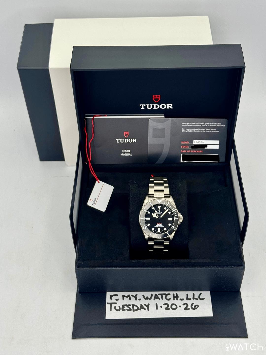 🔵**2025 Tudor Pelagos 39mm 25407N Titanium Black Dial** 🔵**TRADE or SELL us your luxury watch, all brands considered. Message me details.** **Includes the following:** **✔️Original Tudor Double boxed** **✔️Box and Papers - Yes** **✔️Warranty card dated December 2025** **✔️5 Year Manufacturer Warranty** **✔️White Hand Tag** **✔️Manual and Warranty booklets** **✔️Additional Rubber Flex strap with extender** **✔️Size: 7.75inch wrist** **✔️Watch is in excellent overall condition. Please see photos for details.** **✔️**[**Trades**](https://mywatchllc.com/pages/sell-rolex-watch) **welcome** Business Name: **My Watch LLC** LOCATION: Oak Park, Michigan ✔️[MyWatchLLC.com](http://mywatchllc.com/) for current inventory ✔️Google Business Listing [https://g.co/kgs/Cmd6FPW](https://g.co/kgs/Cmd6FPW) ✔️Business Hours M-F 9-6 ✔️Facetime/Video chat/calls welcome to view the watch interested. ✔️Contact: 248-422-0909 via text or call for quickest response. 🟢TERMS: Visit [MyWatchLLC.Com](http://mywatchllc.com/) for payments accepted 🟢REFERENCES/REVIEWS: We are well reviewed on all platforms from google, trust pilot, rolexforums, additionally we have 300+ reference in multiple FaceBook watch groups, reference checks welcome. 🟢SHIPPING: If you are not local, we offer Fully Insured FedEx overnight shipping in the USA for a fee. International shipping available. [https://mywatchllc.com/products/2025-tudor-pelagos-39mm-25407n-titanium-black-dial](https://mywatchllc.com/products/2025-tudor-pelagos-39mm-25407n-titanium-black-dial)