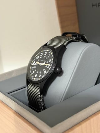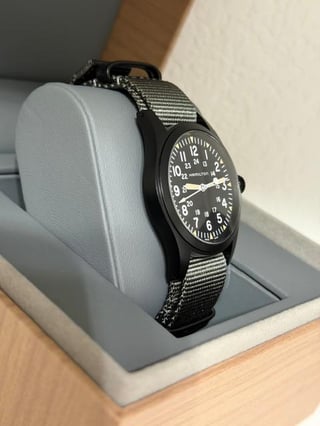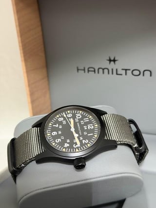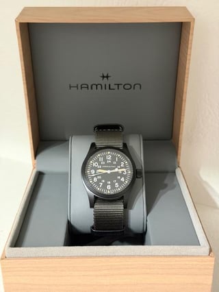 For sale is my Hamilton Khaki Field Mechanical 38mm, model H69409930. The watch is in mint, like-new condition and has only been worn once. There are no scratches, marks, or signs of wear on the case, crystal, or strap. The watch runs perfectly and keeps excellent time. Price: $450 OBO Shipping: Free shipping to CONUS Payment accepted: PayPal, Zelle, Cash App Location: US Condition: Mint / Like New (worn once) Specifications Brand: Hamilton Collection: Khaki Field Model: H69409930 Swiss Made Case diameter: 38 mm Case thickness: 9.5 mm Case material: Stainless steel Caseback: Solid Bezel: Fixed, black PVD Crown: Push/pull Dial color: Black Dial markers: Arabic numerals Second markers: 24-hour markers and minute track Hands: Luminous silver-tone Lume: Hands and markers Crystal: Scratch-resistant sapphire Movement: Hand-wound Hamilton Caliber H-50 Power reserve: Approximately 80 hours Strap: Grey textile NATO Band width: 20 mm Clasp: Tang buckle Water resistance: 50 meters / 165 feet