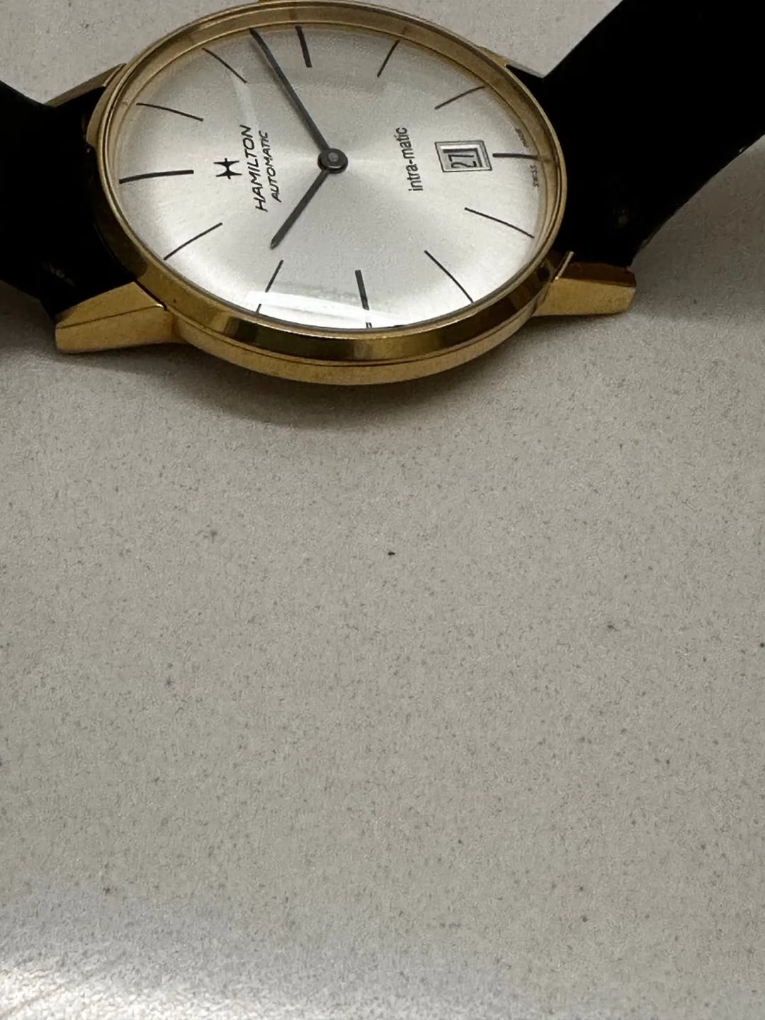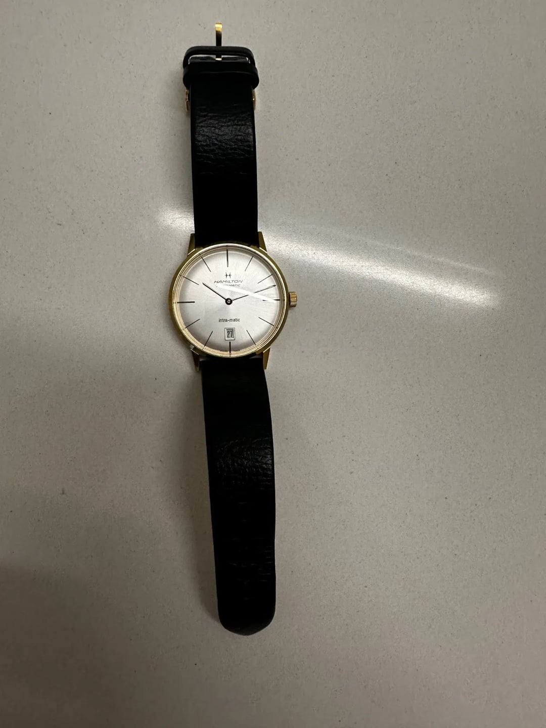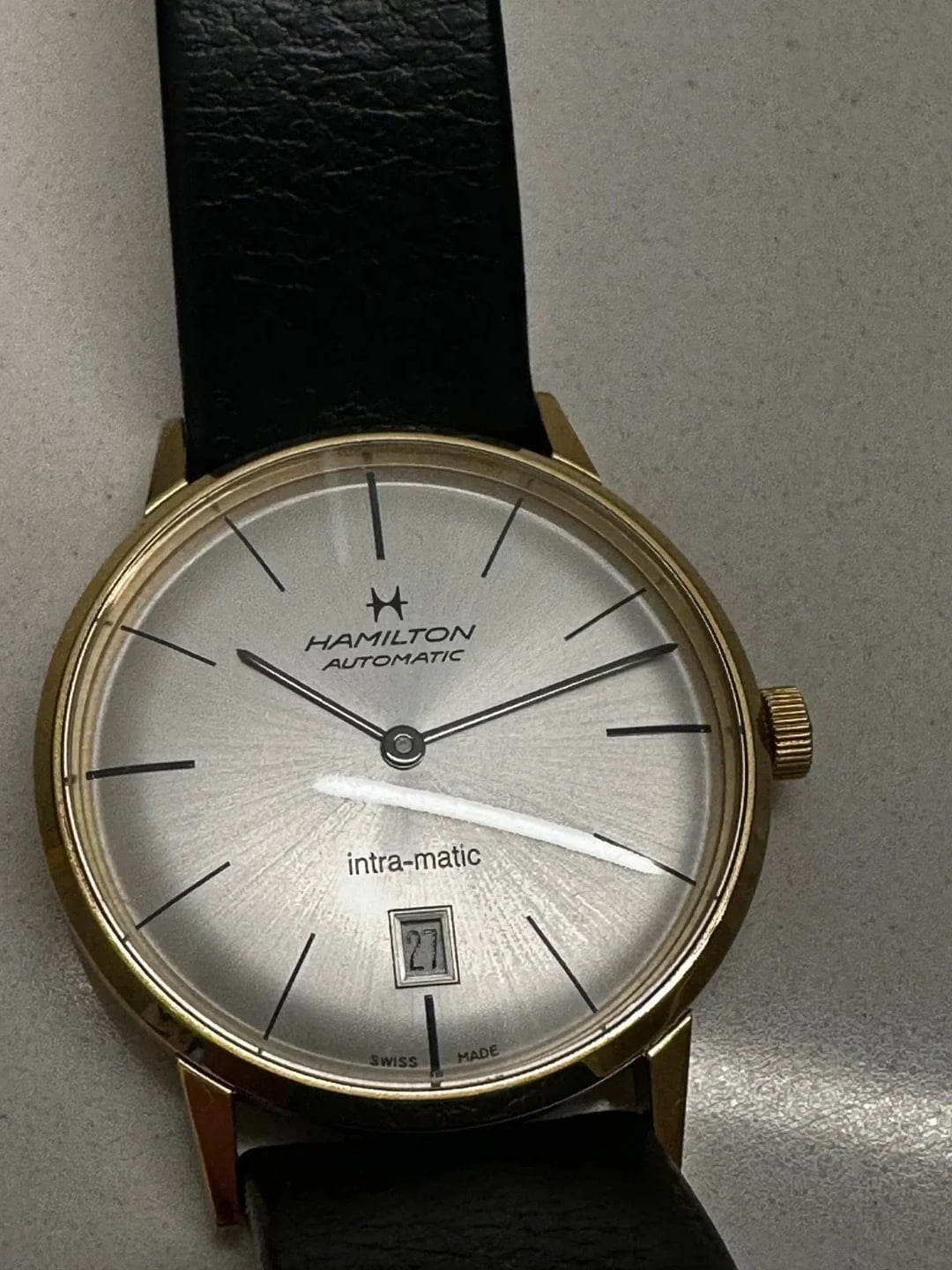 Hello! First time attempting to sell on this subreddit. For sale is a **Hamilton Intra-Matic Automatic Silver Dial Men's Watch H38475751.** Originally purchased online in 2016. Case is in very good condition and has minimal or virtually no scratches. **Leather strap however is separated (see pictures)** but still very functional and a brand new strap can be bought from Hamilton if desired. I simply don't dress formally enough to warrant wearing this. I've worn this to interviews, weddings, etc over the years but I'm a shorts kind of guy these days. Happy to Facetime. Happy to share my ebay profile too (not sure if it's allowed to be posted here so I will share upon request). Paypal Goods and Services preferred for both of us protections. Asking $325 shipped OBO. Thanks!!