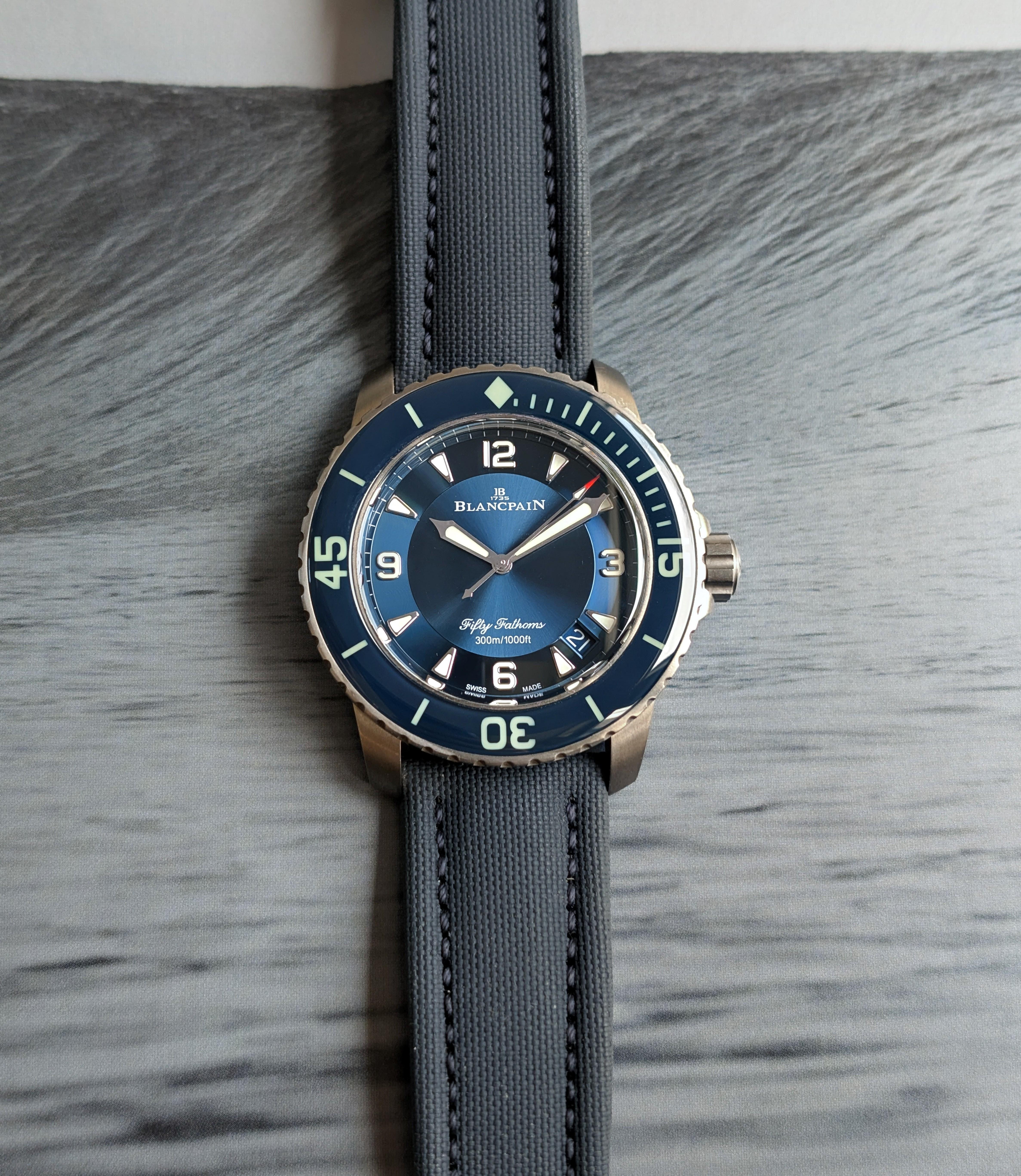 **Blancpain Fifty Fathoms Automatique 5015 - Titanium Blue** What makes the Fifty Fathoms truly special is its unmatched legacy in the world of dive watches. Introduced in the early 1950s, the Fifty Fathoms is widely regarded as the first modern professional dive watch and the blueprint that shaped the entire category that followed. This reference carries that history forward in a way that feels authentic rather than nostalgic, preserving the unmistakable design language that made the original famous. The titanium case keeps the substantial 45mm size comfortable on the wrist, while the sapphire bezel and deep sunburst blue dial give it a refined presence. 45mm titanium case, sapphire bezel, sunburst blue dial. Sail-canvas blue fabric strap with titanium buckle. Blancpain Caliber 1315 automatic movement, which is fitted with a magnetic-resistant silicon balance spring and holds a power reserve of five days. See-through caseback with 18k gold rotor. Water resistance 300 meters. Excellent overall condition. Comes with original dive box, travel case, booklets, and guarantee/warranty card dated 2025. Reference 5015 12B40 O52B More pics: [https://imgur.com/a/aSXRV2q](https://imgur.com/a/aSXRV2q) $11,500 plus shipping 🛫 All watches shipped FedEx fully insured. Local pickup available in Los Angeles area. 💬Positive feedback from hundreds of successful transactions across the watch community, including WUS, Chrono24, eBay, Facebook, and Reddit. I’m always happy to connect by phone or video call to answer questions or verify details. Zelle, Venmo and wire accepted. ⭐100+ five-star reviews on Chrono24 — buy with confidence. ⌚I have a wide range of exceptional watches available, with new pieces added every week.