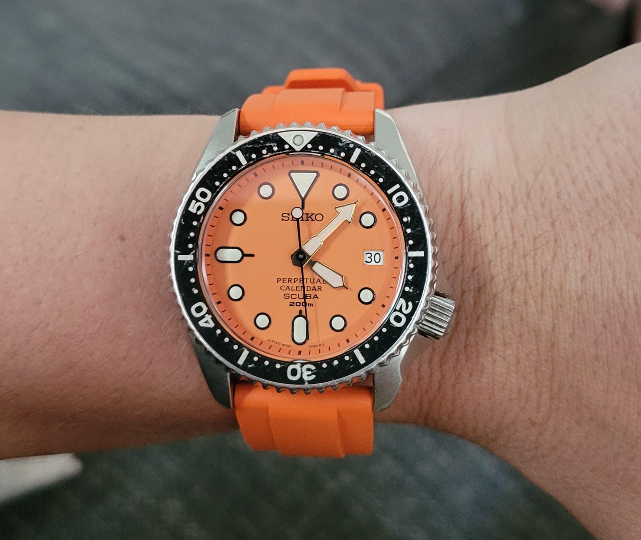 Hi everyone, Up for sale is a very rare orange dial Seiko SBCM029 Perpetual Calendar Diver with high-accuracy 8F35 movement. Goldilocks 39mm case size fits it right between the SKX007 and SKX013 in terms of sizing. Lug width is 20mm, thickness is 11mm and 44mm lug to lug. High-accuracy, perpetual calendar movement makes this the ultimate pick up and go watch. Accurate to +/- 20 seconds per year and automatically adjusts days for months with fewer than 31 days and for leap years. Battery was changed and calendar set in 2024. Comes on aftermarket FKM rubber strap. Pics: https://imgur.com/a/GEgJvdP Timestamp: https://i.imgur.com/eQZJS8O.jpeg See photos for condition. Original Hardlex crystal was professionally polished and is immaculate. Case has light marks and pitting consistent with use and age. One noticeable mark on the 9 o'clock side of the case has been photographed. Bezel insert has marks and patina. Price: $650 OBO shipped to CONUS, Paypal F+F preferred. Snap it up before I come to my senses.