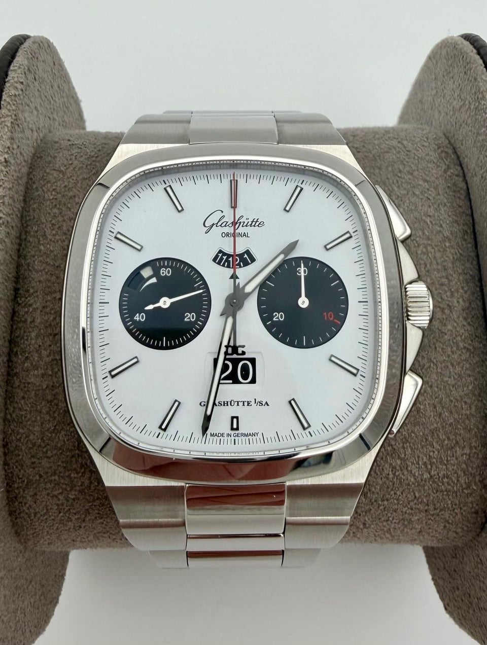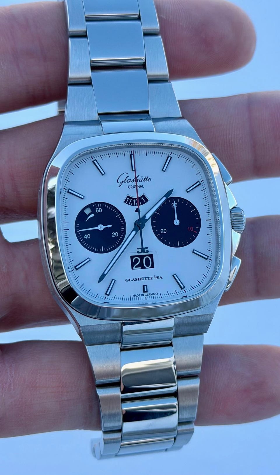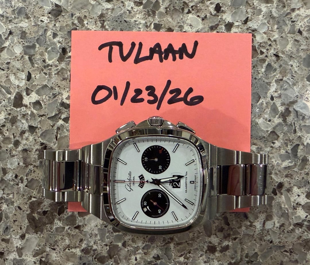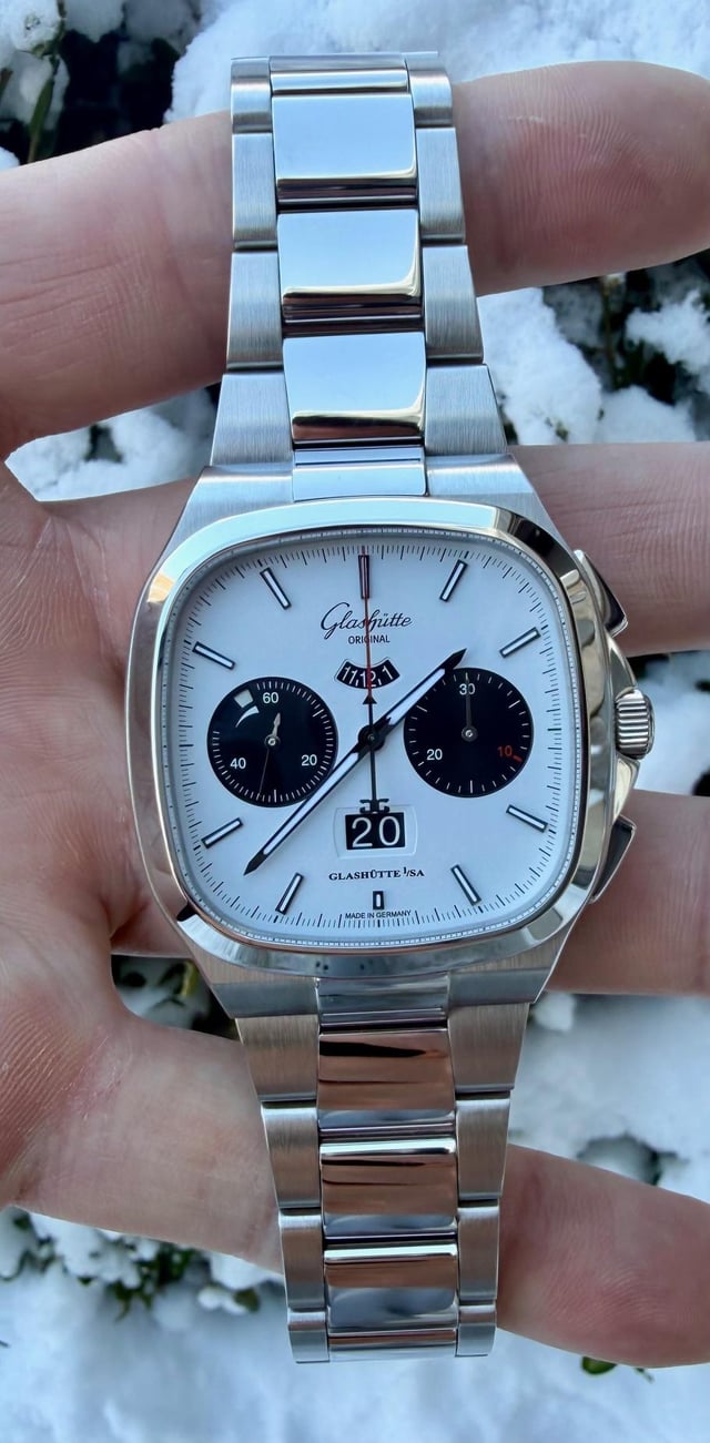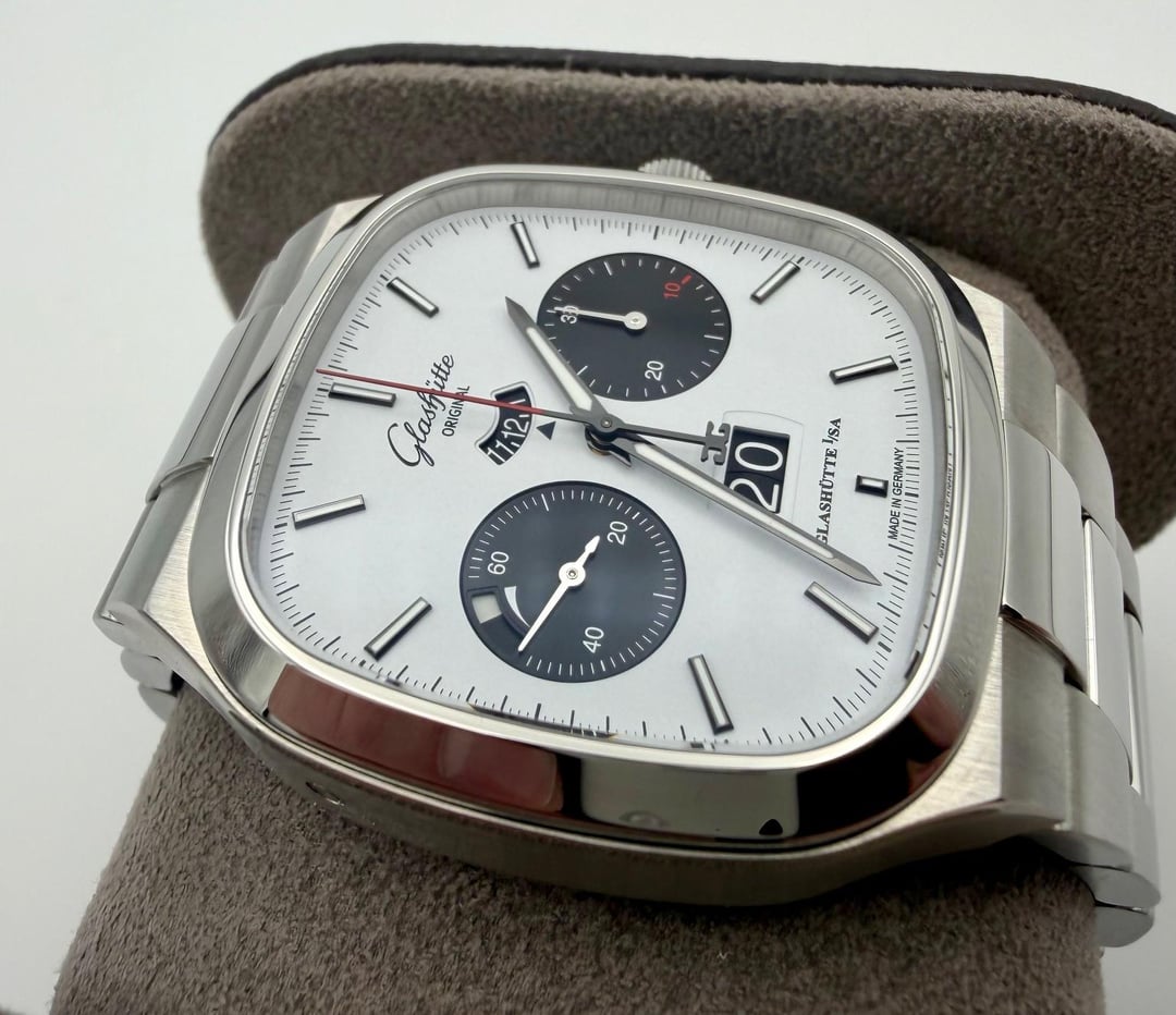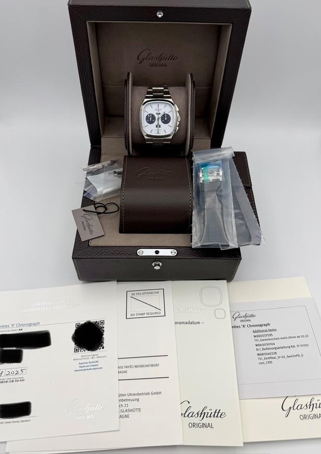 *Glashutte Original Seventies Chrono "X" (Model 1-37-02-18-02-70)* *This is the long sold out and currently impossible to find Glashutte Original Seventies Chronograph "X" edition - limited to 100 pieces in the US market only. Stunning what panda dial with red accents.* *Overall condition is near mint / excellent plus - crystal and bezel are perfect - only signs of wear are the faintest marks on the polished surfaces of some of the bracelet links.* *Comes with original boxes, presentation case, hang tag, manuals, limited edition certificate, AD completed warranty card (08/2025), strap tool and unworn black rubber strap with clasp.* Asking $14500. I'll cover insured Fedex 2-Day to your local fedex office. Not interested in trades. *From Glashutte:* *For the first time, Glashütte Original presents a Seventies model created exclusively for North America. This iconic timepiece is limited to 100 pieces and combines the brand's distinctive Panorama Date with the most important chronograph functions in a watch of a pleasing size: stop-second, flyback function, 30-minute display and numeric 12-hour display. Each timepiece includes both rubber strap and a stainless-steel bracelet - so there is no need to choose between style and function.* *Specs:* *Case Size* *40 mm x 40 mm* *Case Material* *Stainless Steel* *Movement* *Automatic* *Case Thickness* *14 mm* *Water Resistance* *100 meters* *Strap/Bracelet Material* *Stainless Steel* *Item Number* *GLA0100664* *Features* *Date, Fly back Chronograph, Power Reserve, Second Hand* *Collection* *Vintage* *Case Shape:* *Square* *Crystal* *Sapphire* *Dial Color* *White* *Dial Markers* *Stick* *Movement Caliber* *Calibre 37-02* *Strap/Bracelet* *Bracelet* *Country of Origin* *Germany* *Manufacturer Warranty* *2 years* *Manufacturer Reference #* *1-37-02-18-02-70*