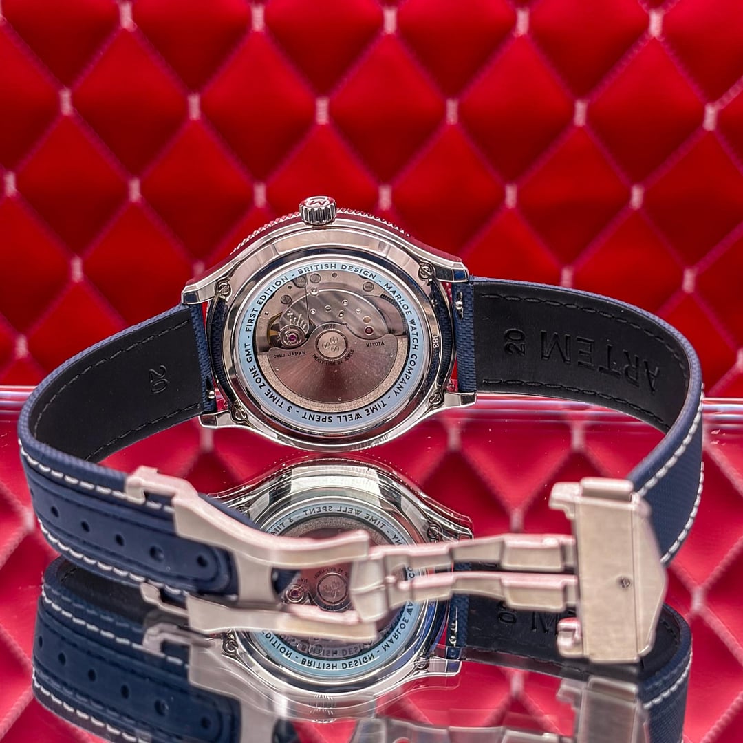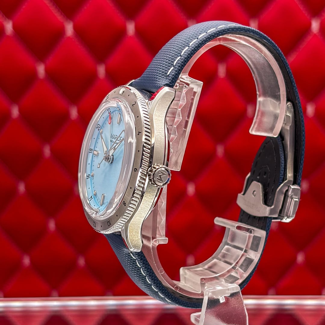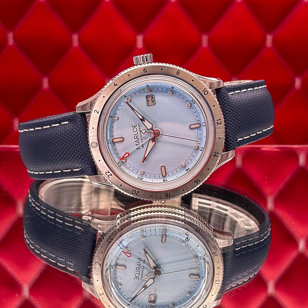 🏒🥅🚨 \[WTS\] Marloe Watch Company Day GMT - "True" GMT Miyota 9075 - Full Set For sale is my Marloe Day GMT, a beautifully designed traveler's GMT from the Scottish microbrand Marloe Watch Company. This watch is famous for being one of the most affordable ways to get a "True GMT" movement with an independently adjustable local hour hand. The "Day" edition features a stunning sky-blue dial with a unique "sandpaper" texture in the center and a smooth outer ring. It’s a limited release, with only 500 pieces produced in the first run. This timepiece is in pre-owned vintage condition and is ready for a new home. 💰 Price: 💲880 USD Condition & Photography Please review all photos for the most accurate representation of this watch's condition. Our macro photography is designed to capture every detail, including the smallest imperfections, ensuring you can buy with complete confidence. Shipping & Service We ship fully insured overnight via FedEx for your peace of mind. We are happy to arrange a video call to show the watch and answer any questions—just reach out anytime. We guarantee the authenticity and accuracy of all our timepieces. Your satisfaction is our highest priority, and we strive for a smooth, transparent, and 100% positive transaction. As a dedicated hockey coach and passionate timepiece collector (@pucks\_timepieces), I've spent years immersed in the world of horology. I now combine this passion with my hockey-playing daughters, and together we create the unique presentations you see here. Our photography is inspired by contemporary artists like KAWS, Banksy, Joan Cornellà, Death NYC, and Shepard Fairey. This artistic approach adds a distinctive, creative character to how each watch is presented. When you purchase from me, you can expect a seamless experience. I'm highly responsive and happy to provide extra photos or details to ensure you feel great about your purchase. Timestamps: https://drive.google.com/file/d/19peey\_rYJCx8dJighrKy5URXQuICvoKF/view?usp=sharing & https://drive.google.com/file/d/1BiAMFAXyYQq3MwJeGXZFlq4mv4cWzfQK/view?usp=sharing