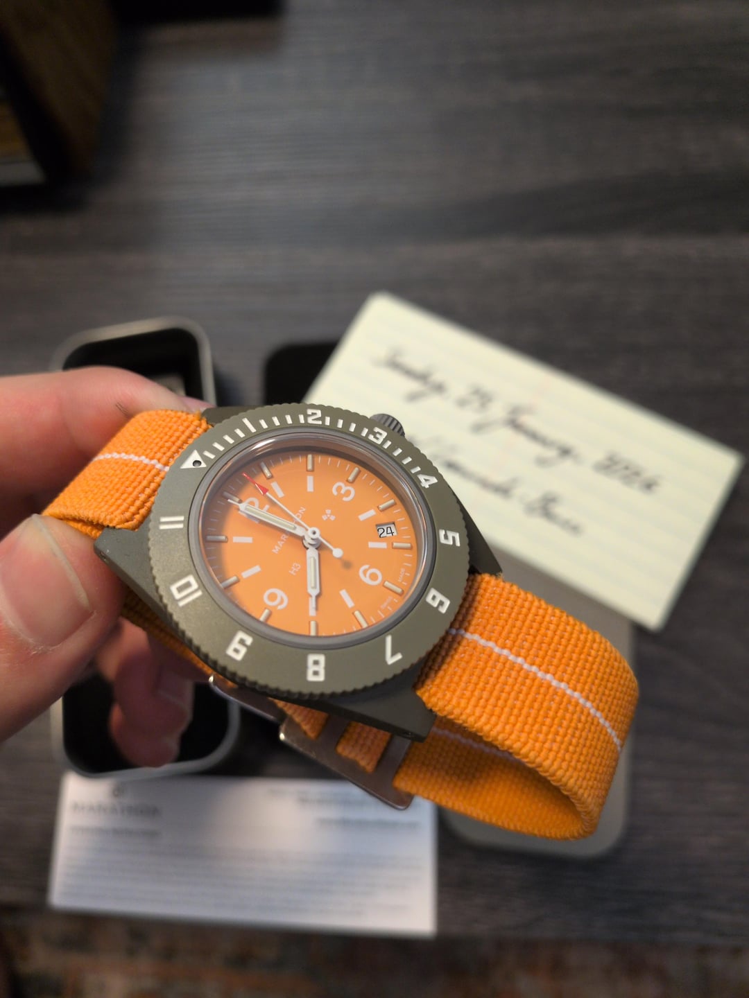 Hi watchex! Up for sale is my Marathon Navigator. This example is a 1 of 500 limited edition with a green case and orange dial. This model was a collaboration with J.Crew released in 2022. The watch is in near-perfect condition, with no visible scratches or dings. The original strap and box are in brand-new condition. The only signs of use are slight discolouration on the caseback under the strap. I'm moving it along to consolidate, as I just don't wear it. Asking price is **$349 shipped to the continental US**. Specs: * 41mm diameter * 11mm thick * 20mm lug width * 60m water resistance * \~45 gram total weight * Tritium gas tubes on dial markers and hands * Composite fibreshell case * Bidirectional composite bezel * Sapphire crystal * ETA F06.115 HeavyDrive quartz movement What you get: * The watch head * The original strap in brand-new, unworn condition * An aftermarket orange elastic strap * The original metal box * The original instruction card *(Basically, the full set plus an extra strap)*