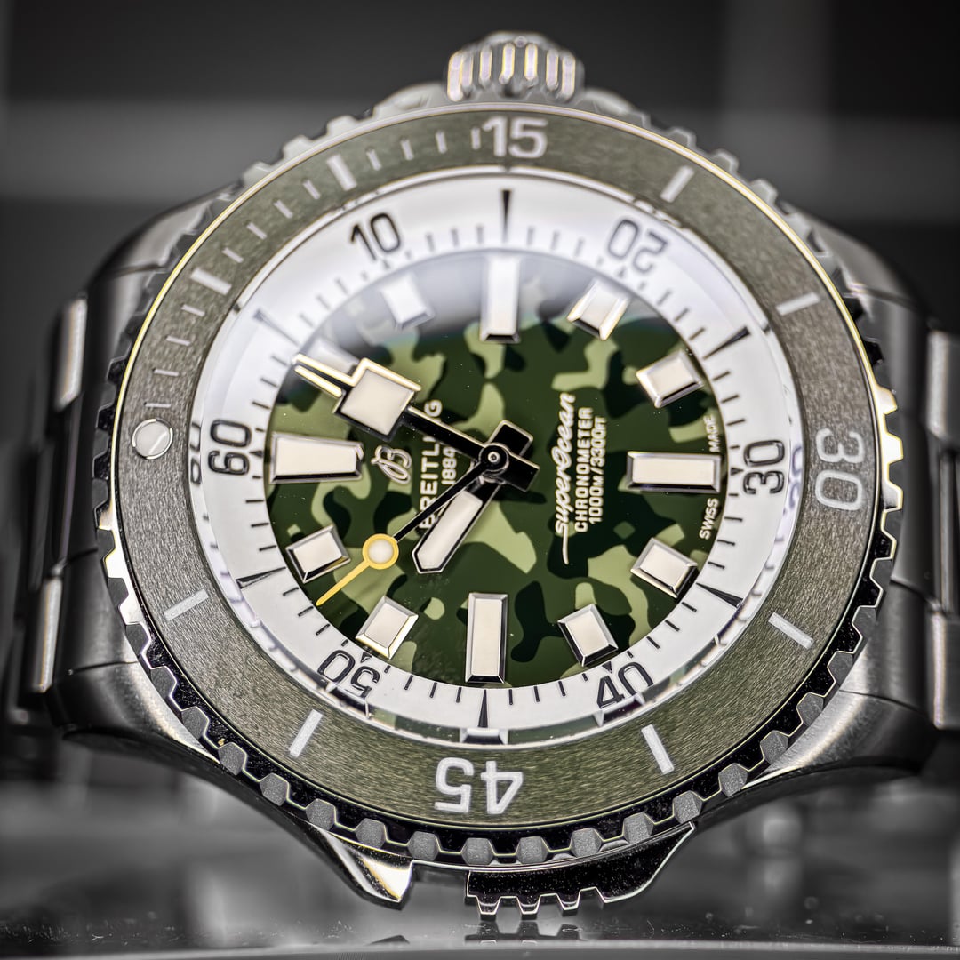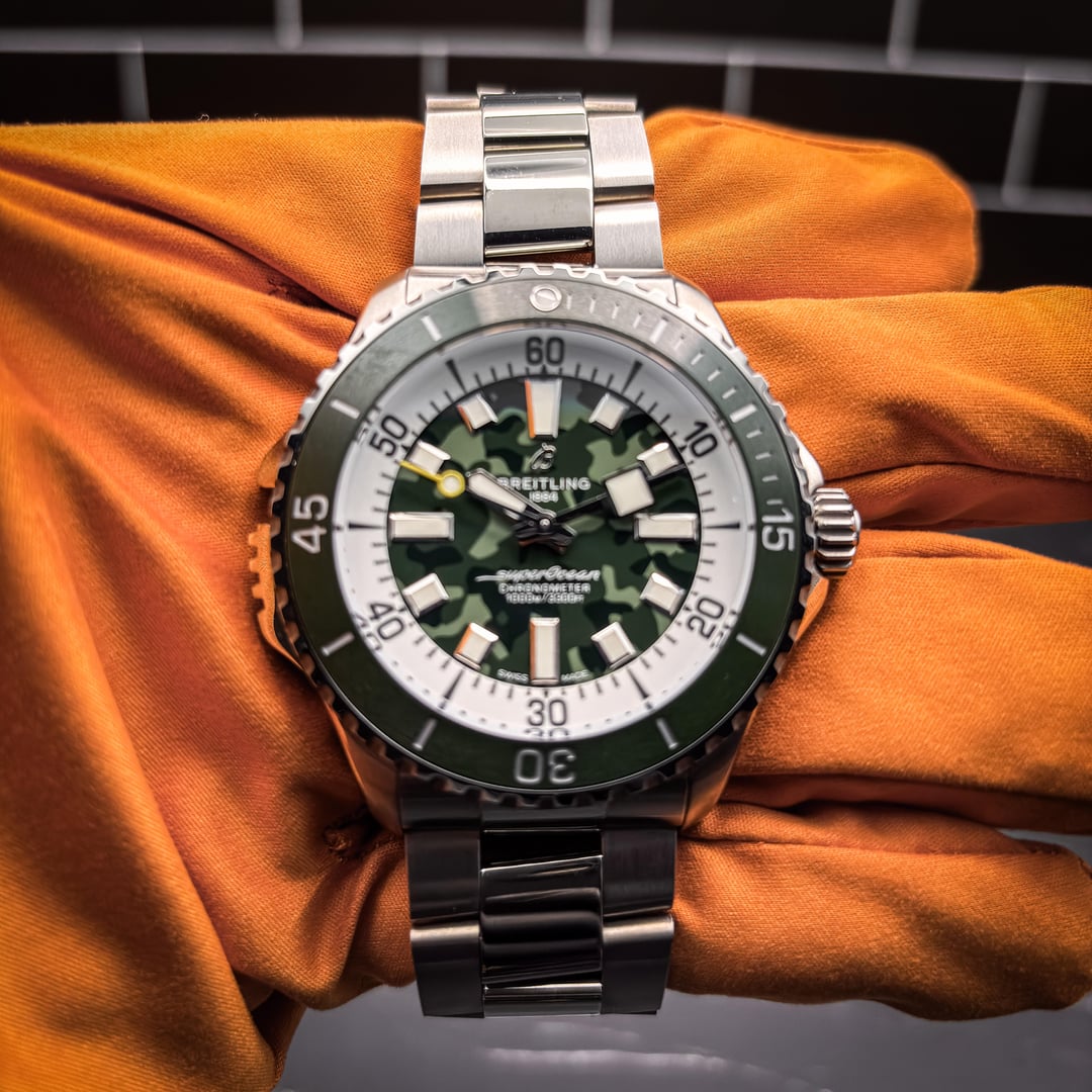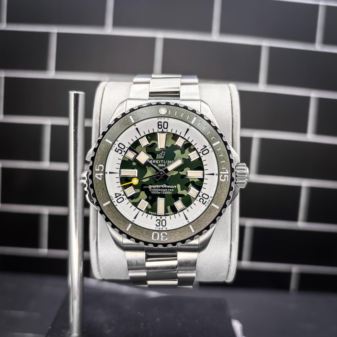 Breitling SuperOcean 44 Super Diver Ref. E10379D31L1E1 Titanium case with green camo dial on matching titanium bracelet. Automatic movement. Pre-owned and in very good condition. Factory warranty valid through 2027. Offered as a complete set including box, papers, and all original contents. 44 mm case | Titanium case & bracelet | Automatic | Full set | Factory warranty through 2027 The watch has been inspected and accurately represented. The serial number is intentionally blurred in photos for security but is present on the watch and matches the accompanying documentation. Additional photos or video can be provided if required. All photos and details are intended to accurately represent the watch. Please review them carefully and ask any clarifying questions in advance. $4,795 shipped and fully insured within the continental United States. Trades may be considered with full details, photos, and stated valuation. I’m present online and accessible.