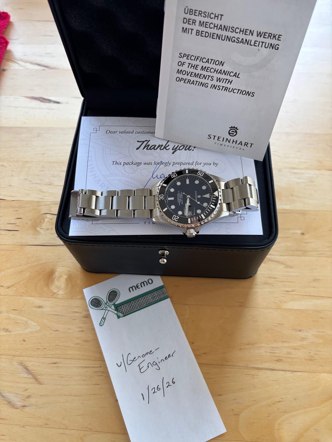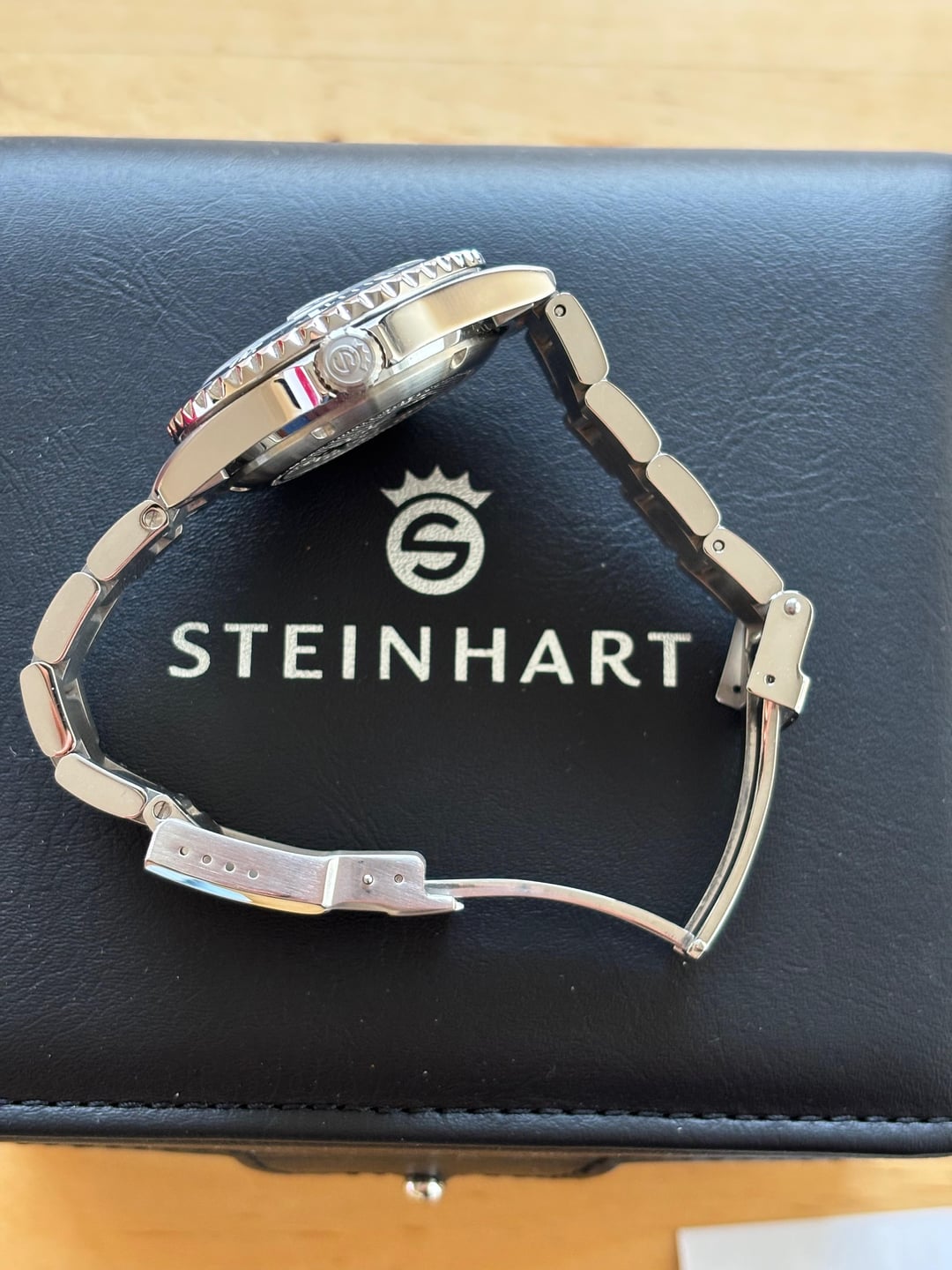 Hello all! Today I'm offering my Steinhart Ocean 39 Black Ceramic automatic watch for sale. This watch is a catch and release for me. I bought it to see whether I would ever want to own a Submariner and have decided I'm not a big fan of ceramic bezels. That being said, on its own this is an excellent watch. The build quality is great for the price - feels really solid with a nice amount of weight. The bracelet is quite comfortable and doesn't make any noise. The bezel has smooth action with a nice click. This particular example is in excellent condition and running within spec. There is a minor scratch on the right flank below the crown that I tried to capture, but it is invisible in most lighting. Full kit included. I am asking $425 shipped within the CONUS and accept Zelle or PayPay (G&S +3%). For trades, I would mainly consider a trade down to a Seiko SRPK29, but am open to other possibilities 39mm or smaller. Thank you for your interest and I'm happy to answer any questions.