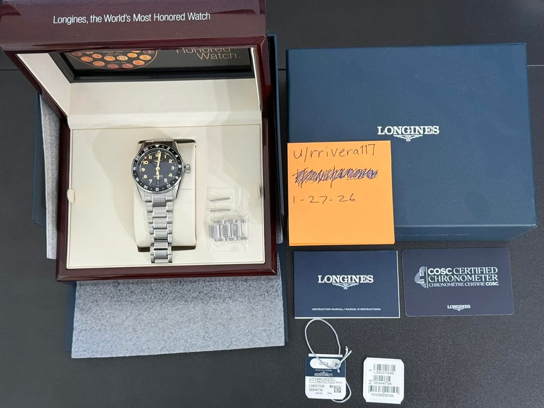 For sale is a Longines Spirit Zulu Time Titanium/ 39mm: L3.802.1.53.6 **Case**: 39mm width, 46.80mm L to L, 13.50mm thick, 21mm lug width, 100m water resistant, sapphire crystal **Movement**: Caliber L844.4 Automatic GMT with Date, Self-winding mechanical movement beating at 25'200 vibrations per hour, with a monocrystalline silicon balance-spring power reserve 72hrs. **Condition**: Overall the watch is in like new condition, I would rate it 9/10. I've worn it under half a dozen times since I purchased it from [jomashop.com](http://jomashop.com/) in September of 2025. The only imperfections I can find are a few hairlines on the polished sides of the links when it was resized which are barely noticeable, this grade 5 Titanium will hold off wear and tear like no other. Watch crystal, bezel, case, bracelet and clasp are 100% scratch free. I purchased soon after a Spirit 39mm non GMT, and I already had a GS SBGN027 GMT so this was getting no wrist time so id like to move it on. You will receive original box, booklets, tags, card, original purchase receipt and full links. **Price**: $2,750 USD. Insured Ground shipping included through UPS within CONUS. PayPal FF, Zelle or Venmo only. NO TRADES please. **Contact:** Happy to video call or text to discuss watch or any additional questions. \*\*\* Please look me up under user: rrivera1107 on eBay for extensive seller feedback. I have plenty of transactions with 100% seller rating.