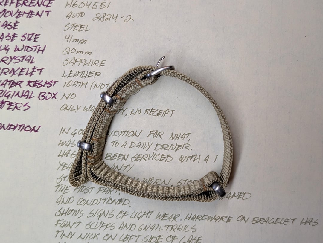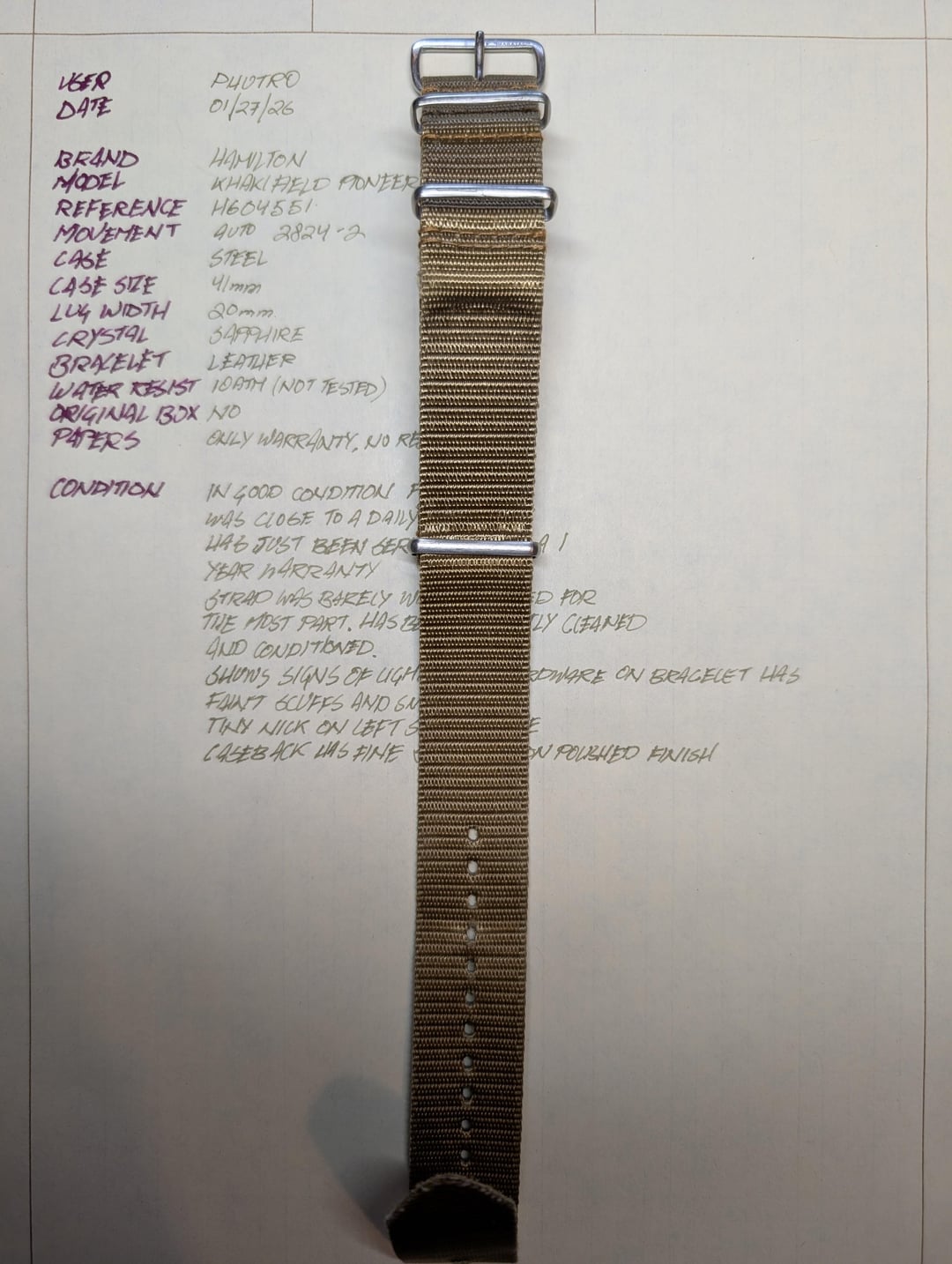 Afternoon, everyone. Looking to sell a Hamilton Khaki Field Pioneer, hasn't seen much wrist time lately. It's in good condition with light signs of wear. Recently serviced with a 1yr warranty. Strap has been stored for most of the time, cleaned and conditioned. The hardware on the bracelet has faint scuffs and snail-trails. On the left-face of the case is a small nick. Caseback has fine scratches on the polished finish. It comes with a 20mm, tan, NATO strap that the watch was on for most of its time. No box. Initial warranty (no bill of sale), and papers for service. Shipping included, ConUS only, Paypal G&S, insured with tracking and signature confirmation. Asking 650. I appreciate you taking the time to look.