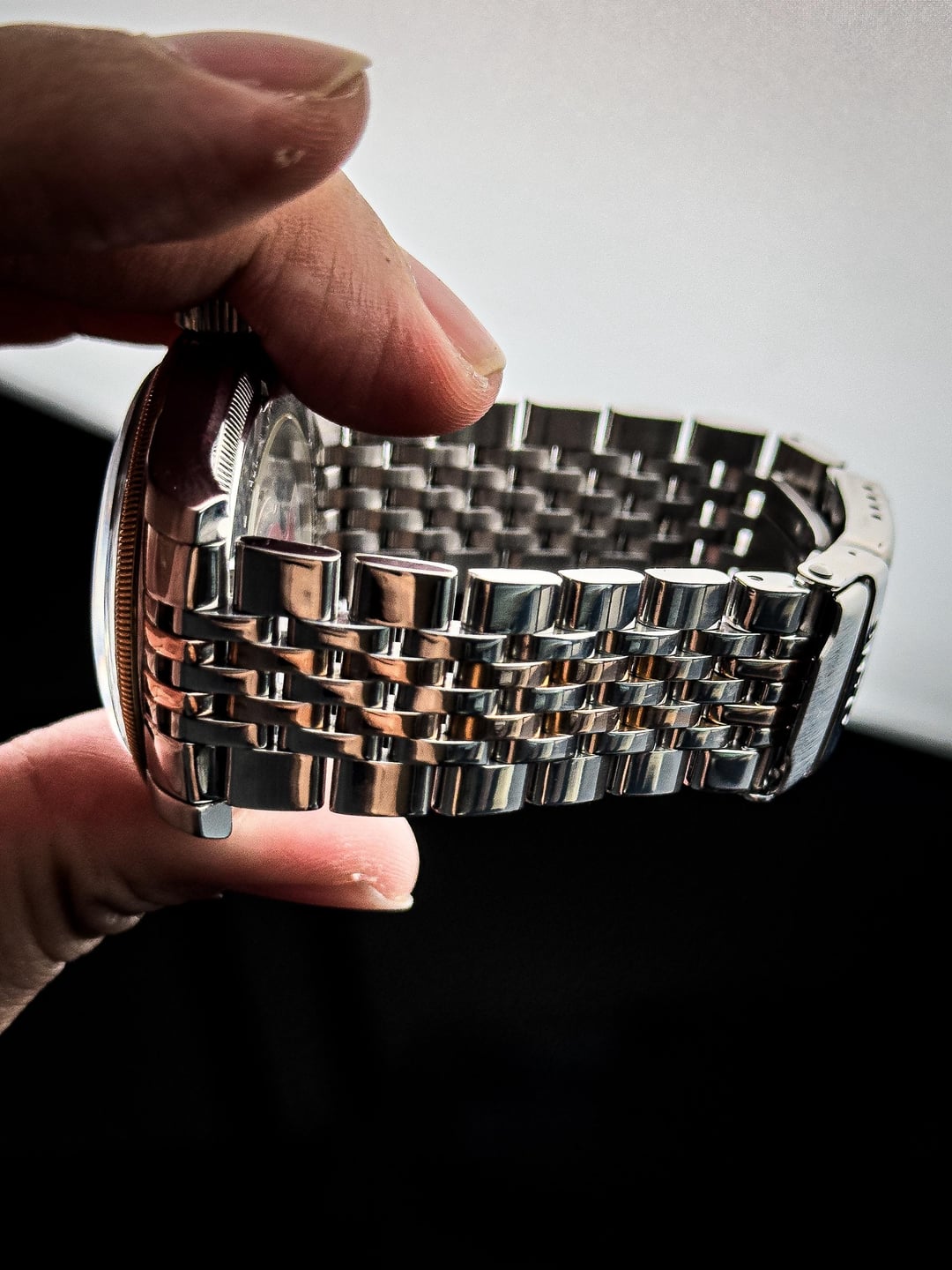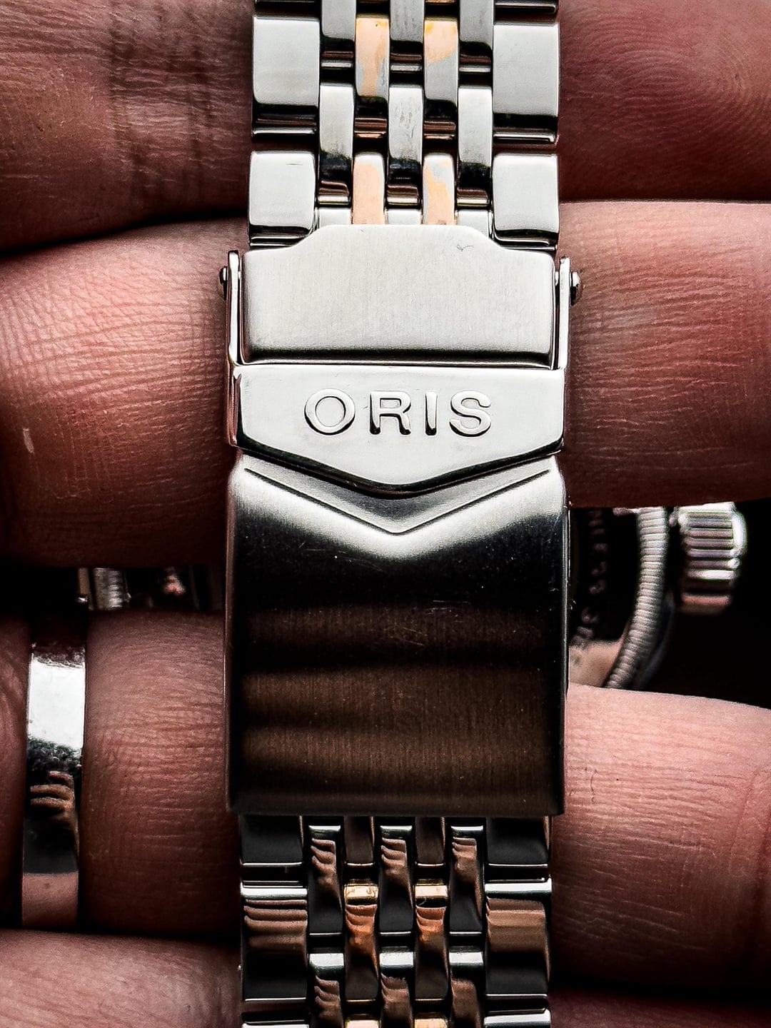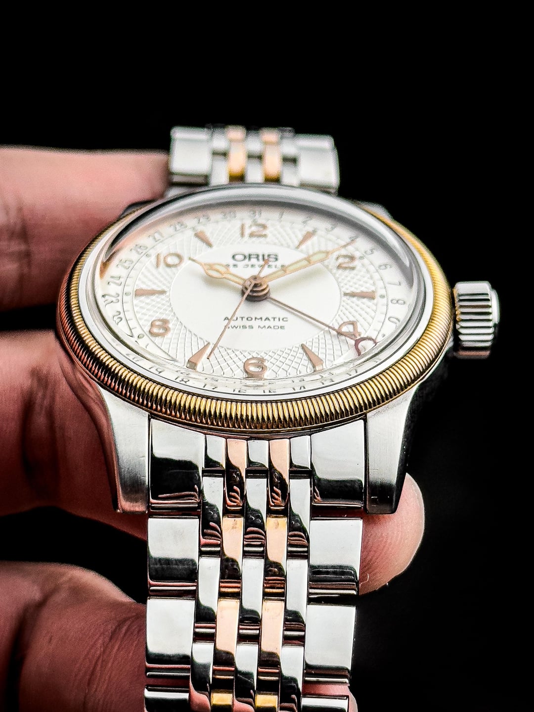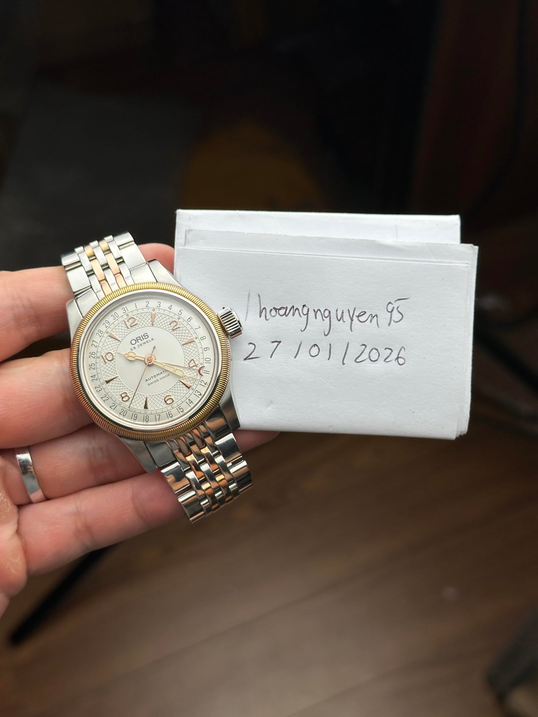 Up for sale is the Discontinued Oris Big Crown Pointer Date 7543 40mm in excellent condition Images: https://drive.google.com/drive/folders/1cBjVmNdZ0fkNz1O_2V9zfEjyvPP50OEi Video: https://drive.google.com/file/d/12lOeMpvM_IpmWyDYhzlXh_fSy8n70s7f/view?usp=drivesdk Timestamp: https://drive.google.com/file/d/1f2hqcu0ctb5wvQCBHC_3YKEBLeUxWifL/view?usp=drivesdk Oris is one of the well-known independent Swiss brands, and its Big Pointer Date design has been a staple of the brand since its introduction in 1938. Originally designed for pilots, the “Big Crown”—which gives the model its name—allowed for easy adjustments while wearing gloves. The watch measures 40mm in diameter with a 48mm lug-to-lug and a 20mm lug width. It features a brushed and polished stainless steel case paired with rose gold plated bezel for a refined contrast. The light cream dial includes Arabic numerals and rose gold index markers, along with luminescent hands for improved visibility. Additional highlights include a multi-piece stainless steel construction, a domed plexiglass crystal up front, and a see-through case back made of mineral glass. The watch is in excellent condition with very little scratches and no dent. Crystal is nice and clean, and dial is flawless. Watch is featured on OEM Oris bracelet that fits up to 18.5-19cm (7.2-7.5 inches). It has been recently serviced and is running well within COSC standard at +/-5s a day. Watch comes with standard box (no papers) Price: $1085 (similar condition goes for $1600+ online) + $60 flat shipping (via UPS/DHL express - fully insured with duty fee/tariffs covered). Payment via PayPal F&F or G&S (+4.6% fee covered by the buyer). Not accepting trades. Feel free to message me with any questions or if you're interested. Have a great day! Check out my other watches on Instagram: @jasonswatchcorner