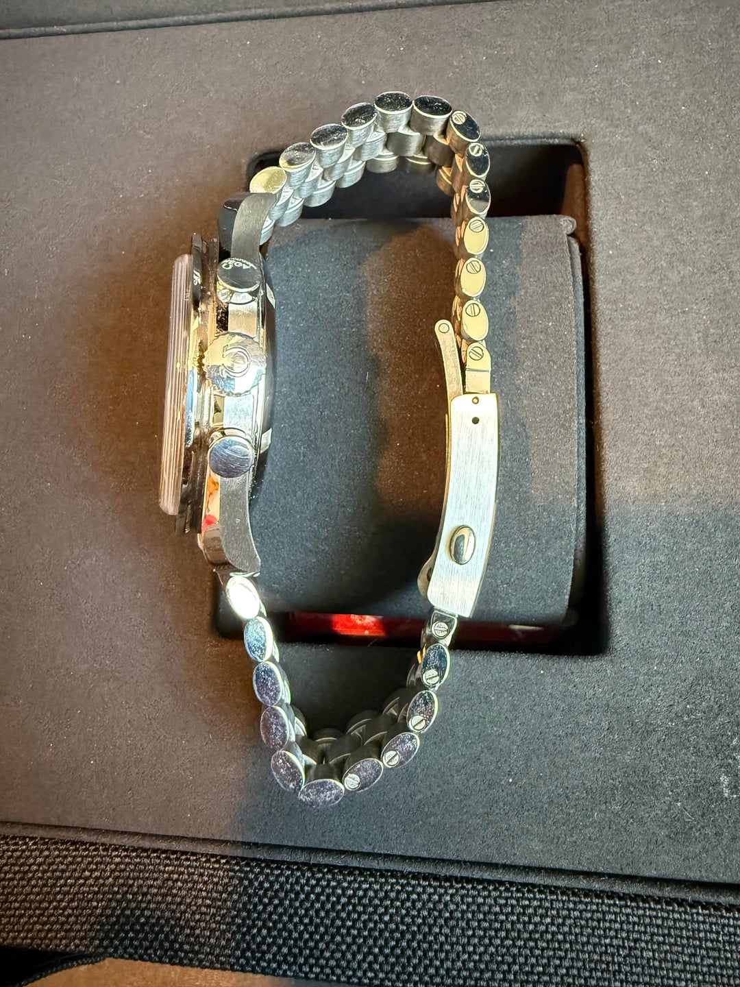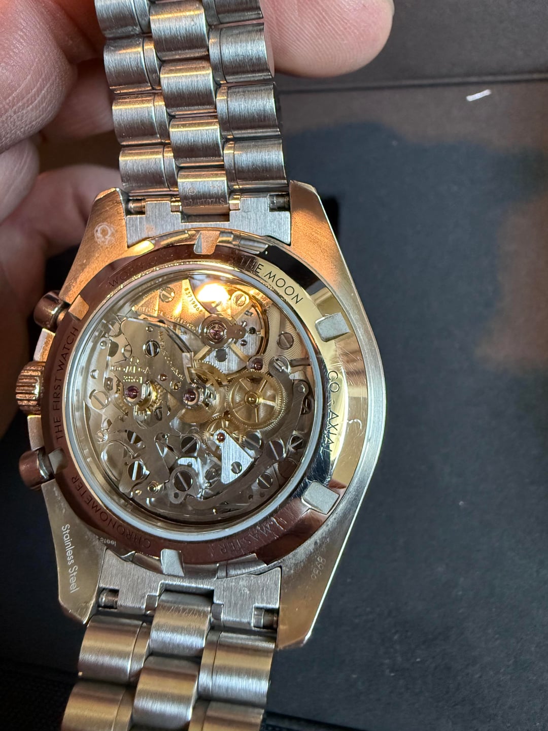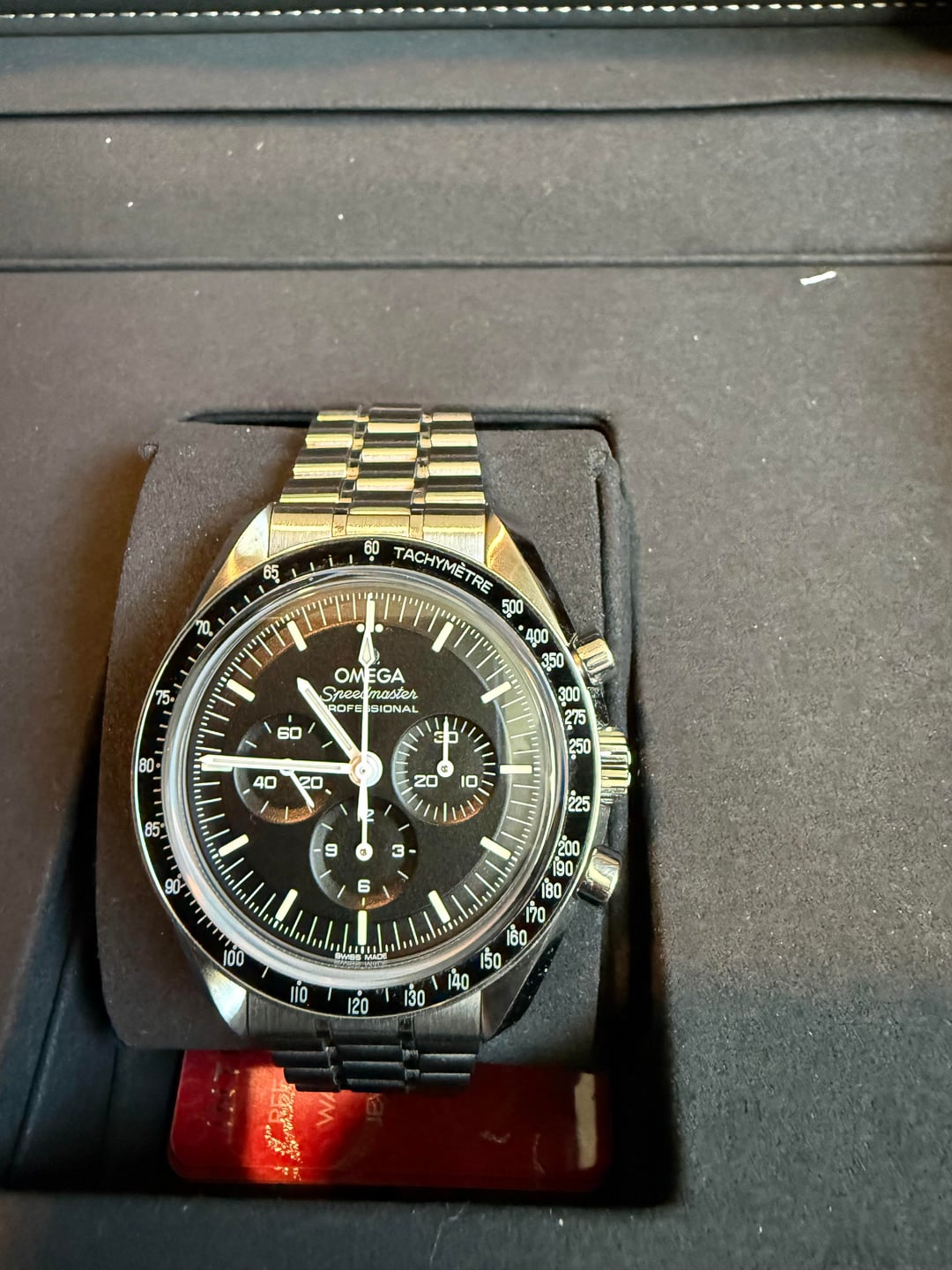 Selling my 2022 Omega Speedmaster 3861 sapphire sandwich 310.30.42.50.01.002 on a bracelet. I purchased this directly from Omega in Feb 2022. Has seen regular wear but is in great condition. Bezel is clean, glass is clear and winds smoothly. Warranty card, manual included. No issues mechanically. There are micro scratches throughout from regular user but nothing noticeable or something my photos can capture. It was very well taken care of. Sized for my roughly 7.5 inch wrist. Includes 2 extra links. Warranty card was not stamped by Omega, but it was purchased through the Omega website. Asking $6100 Zelle shipped and fully insured CONUS. Additional references through reverb or other platforms available on request.