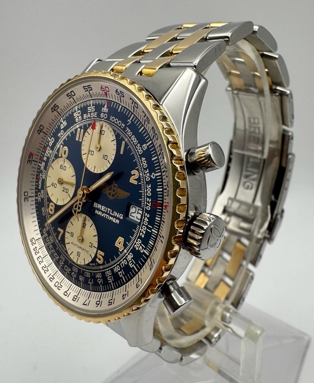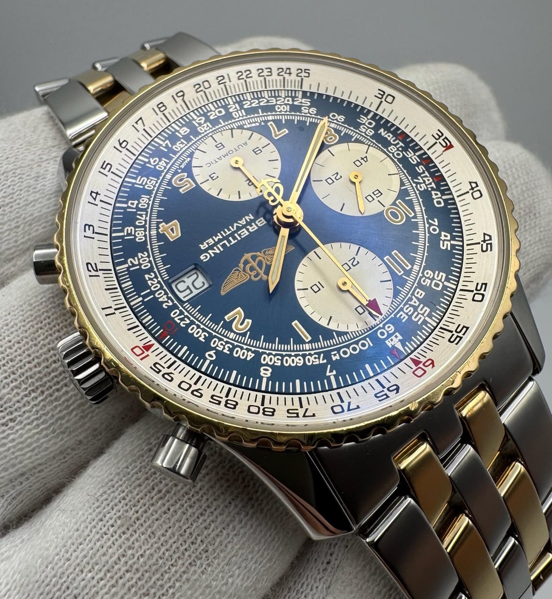 This Breitling Old Navitimer Ref. D13022 is presented in outstanding all-original condition, showcasing the brand’s aviation heritage in a refined two-tone configuration. The case remains exceptionally clean with minimal signs of wear, preserving its sharp lines and original surfaces. The period-correct blue tritium dial is particularly striking, featuring evenly developed yellow patina across the numerals and perfectly matching tritium-filled gold hands, adding depth and character while maintaining excellent legibility. The bi-directional rotating bezel operates smoothly and securely, functioning exactly as intended. The original two-tone bracelet is in excellent condition with no visible stretch and is believed to retain its full complement of links, offering both comfort and collectability. Powering the watch is its automatic chronograph movement, professionally serviced in January 2026 and running properly. A well-preserved example of the classic Old Navitimer, combining strong aesthetics, mechanical integrity, and original components throughout. **Reference:** D13022 **Size:** 41mm **Year:** 1990s 📜 Includes: No box or papers 💵 Price: $4,230 + FREE overnight shipping with FedEx fully insured. [Timestamp](https://imgur.com/a/io2GmQk) 🔗 Other Listings: [profile](https://www.reddit.com/u/BoghossianJewelry/s/vm81HAdB7o) | [watchrecon](https://www.watchrecon.com/?query=BoghossianJewelry&last_days=0) 🔥 Follow us on [Instagram](https://www.instagram.com/bogossiajewelers) 📍 Location: New York ✉️ Email: [email protected] 🔒 Authenticity: 100% guaranteed, buy with confidence. We have 160+ reviews on Chrono24 with 180+ transactions, and Excellent rating score on Trustpilot. Visit our [profile](https://www.reddit.com/u/BoghossianJewelry/s/vm81HAdB7o) for links and references. View [reddit feedback](https://watchcharts.com/repcheck/reddit/BoghossianJewelry/feedback) and [reddit transactions](https://www.reddit.com/r/watchexchange/wiki/confirmations/boghossianjewelry). 📦 Domestic Shipping: Ships with FedEx overnight, within 24 business hours of payment, from New York, NY to CONUS. The shipment is fully insured against damage, loss or theft. 🌍 International Shipping: Incurs an additional $100. 💳 Payment: Crypto (+2%), PayPal/CC (+4%), Web, or Face-to-face deal in NY. 🔐 [Seller References](https://bogossia.com/authenticity) 📸 [IG: @bogossiajewelers](https://www.instagram.com/bogossiajewelers)