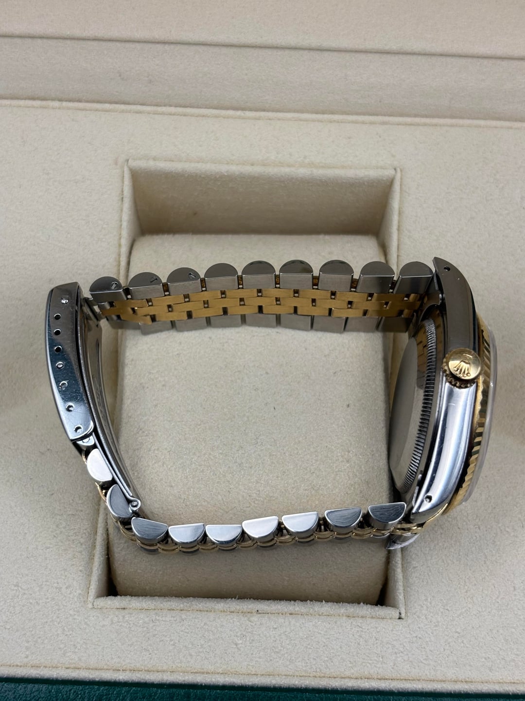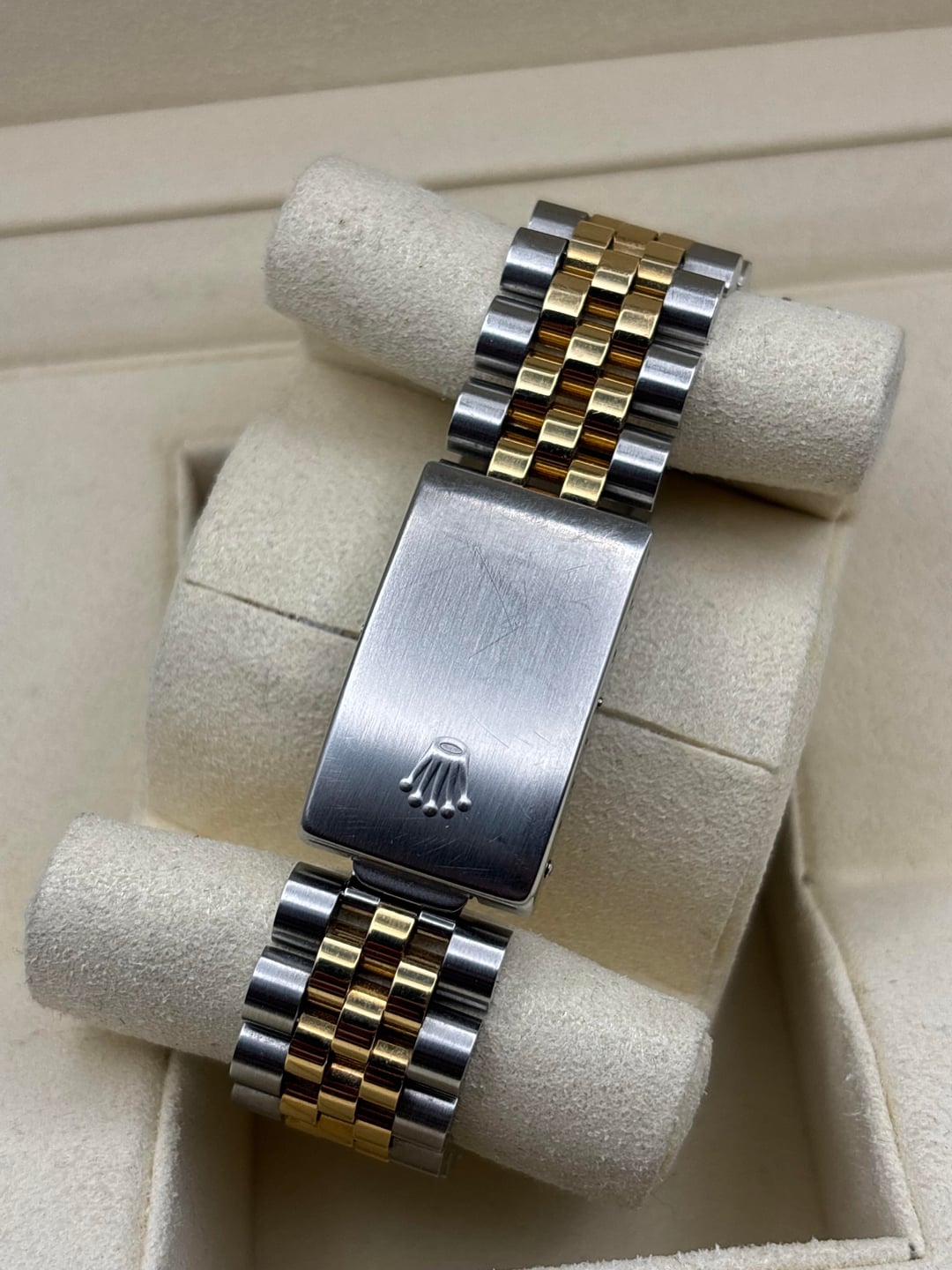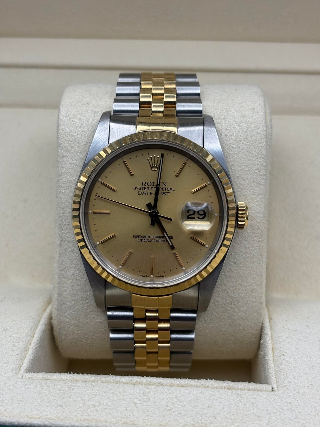 Up for sale is a Rolex Datejust reference 16233, a timeless two-tone classic featuring a champagne dial, 18k yellow gold fluted bezel, and Rolesor Jubilee bracelet. This is an all-original example with no aftermarket components. Condition: • Overall very good vintage condition • Case shows normal light wear consistent with age • Bracelet has slight stretch / band wear, typical for a Jubilee of this era (see photos) • Crystal is clean • Watch is running well and keeping time Details: • Reference: 16233 • Case size: 36mm • Stainless steel & 18k yellow gold (factory Rolesor) • Champagne dial with applied baton markers • Sapphire crystal with cyclops • Automatic movement • Screw-down crown • Swiss made Included: • Rolex inner box • Rolex outer box • Appraisal paperwork $5,850 shipped