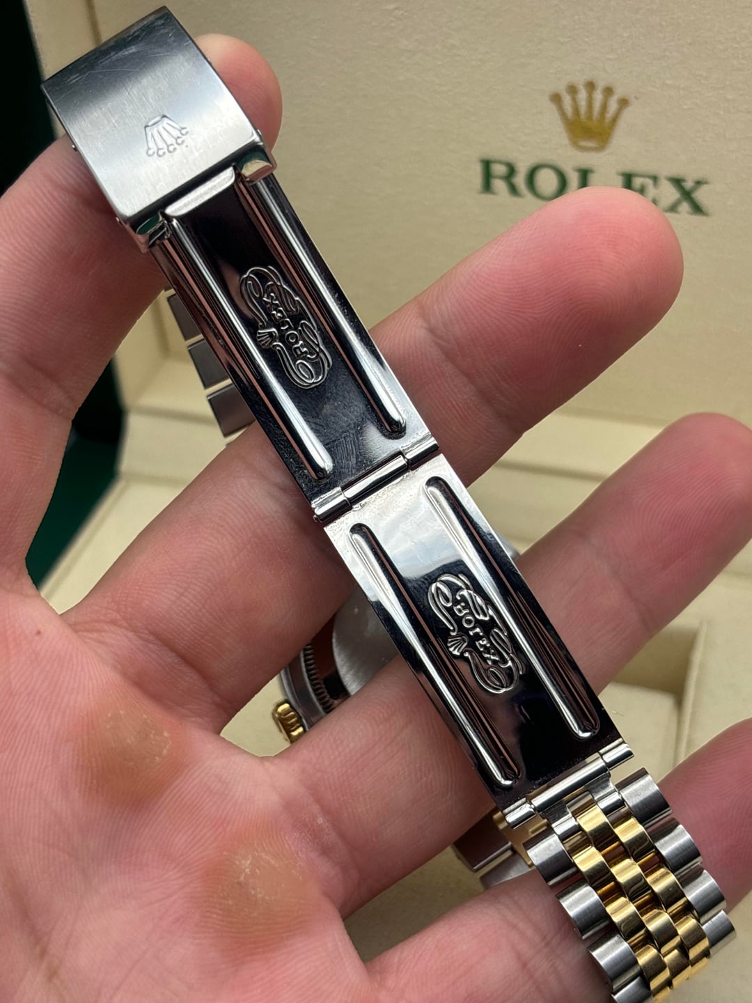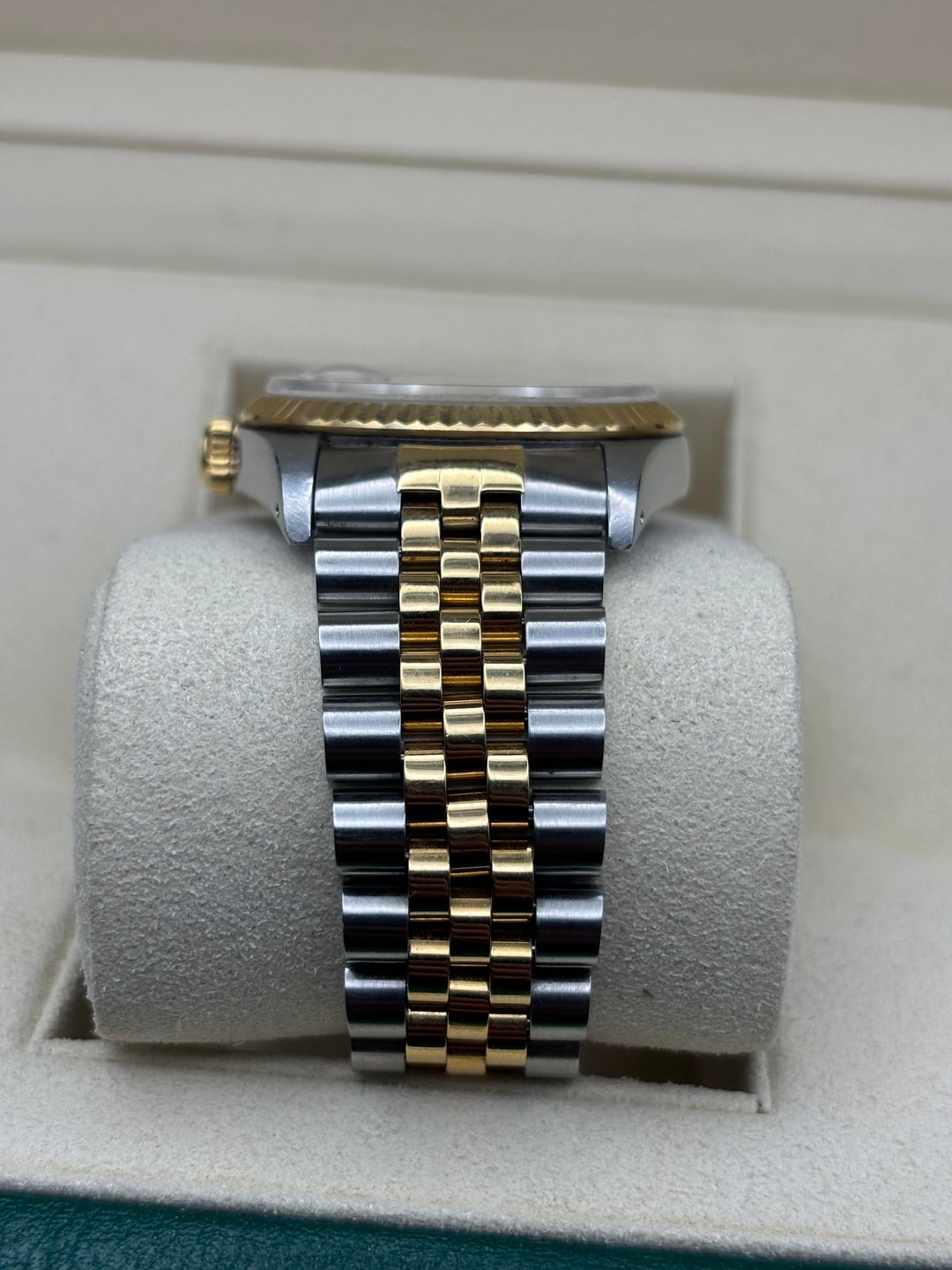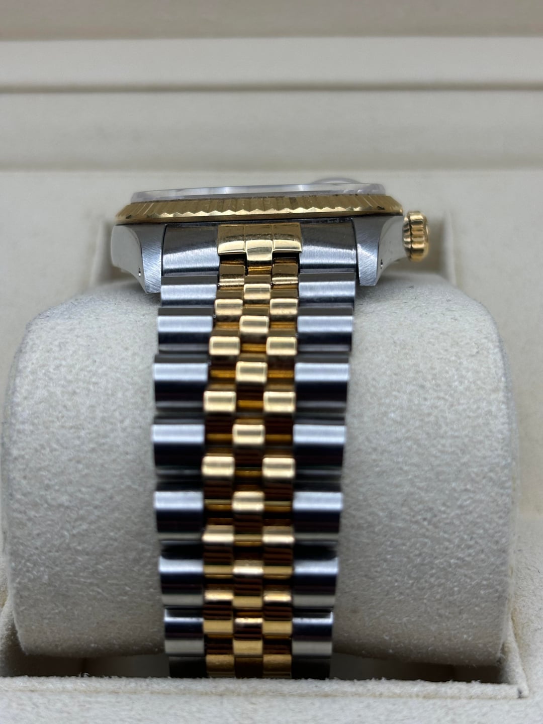 Up for sale is a Rolex Datejust reference 16233, a timeless two-tone classic featuring a champagne dial, 18k yellow gold fluted bezel, and Rolesor Jubilee bracelet. This is an all-original example with no aftermarket components. Condition: • Overall very good vintage condition • Case shows normal light wear consistent with age • Bracelet has slight stretch / band wear, typical for a Jubilee of this era (see photos) • Crystal is clean • Watch is running well and keeping time Details: • Reference: 16233 • Case size: 36mm • Stainless steel & 18k yellow gold (factory Rolesor) • Champagne dial with applied baton markers • Sapphire crystal with cyclops • Automatic movement • Screw-down crown • Swiss made Included: • Rolex inner box • Rolex outer box • Appraisal paperwork $5,850 shipped