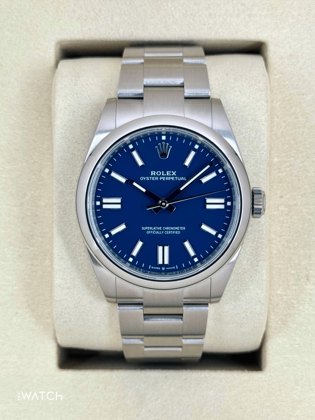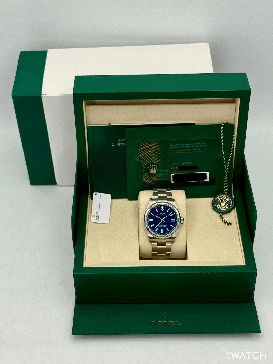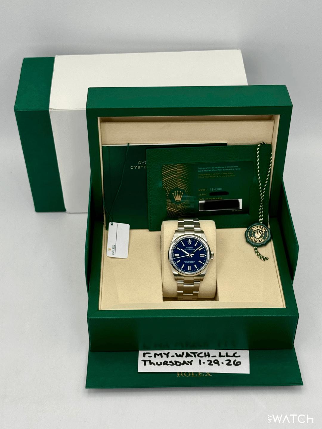 🔵**NEW 2025 Rolex Oyster Perpetual 41mm 134300 Stainless Steel Med Blue Dial with Oyster Bracelet** 🔵**NOTE: Watch still has factory stickers on the clasp, clasp lock and bracelet** 🔵**TRADE or SELL us your luxury watch, all brands considered. Message me details.** **Includes the following:** **✔️BRAND NEW 2025 UPDATED ROLEX BOX (DOUBLE BOXED)** **✔️Box and Papers - Yes** **✔️Warranty card dated October 2025** **✔️5 year manufacturer warranty** **✔️Manual and Warranty booklets** **✔️Green and White Hang Tags included** **✔️Size: 7.75inch wrist (Full Links)** **✔️Material: Oystersteel** **✔️Watch is BRAND NEW/UNWORN** **✔️**[**Trades**](https://mywatchllc.com/pages/sell-rolex-watch) **welcome** Business Name: **My Watch LLC** LOCATION: Oak Park, Michigan ✔️[MyWatchLLC.com](http://mywatchllc.com/) for current inventory ✔️Google Business Listing [https://g.co/kgs/Cmd6FPW](https://g.co/kgs/Cmd6FPW) ✔️Business Hours M-F 9-6 ✔️Facetime/Video chat/calls welcome to view the watch interested. ✔️Contact: 248-422-0909 via text or call for quickest response. 🟢TERMS: Visit [MyWatchLLC.Com](http://mywatchllc.com/) for payments accepted 🟢REFERENCES/REVIEWS: We are well reviewed on all platforms from google, trust pilot, rolexforums, additionally we have 300+ reference in multiple FaceBook watch groups, reference checks welcome. 🟢SHIPPING: If you are not local, we offer Fully Insured FedEx overnight shipping in the USA for a fee. International shipping available. [https://mywatchllc.com/products/new-2025-rolex-oyster-perpetual-41mm-134300-med-blue-dial](https://mywatchllc.com/products/new-2025-rolex-oyster-perpetual-41mm-134300-med-blue-dial)
