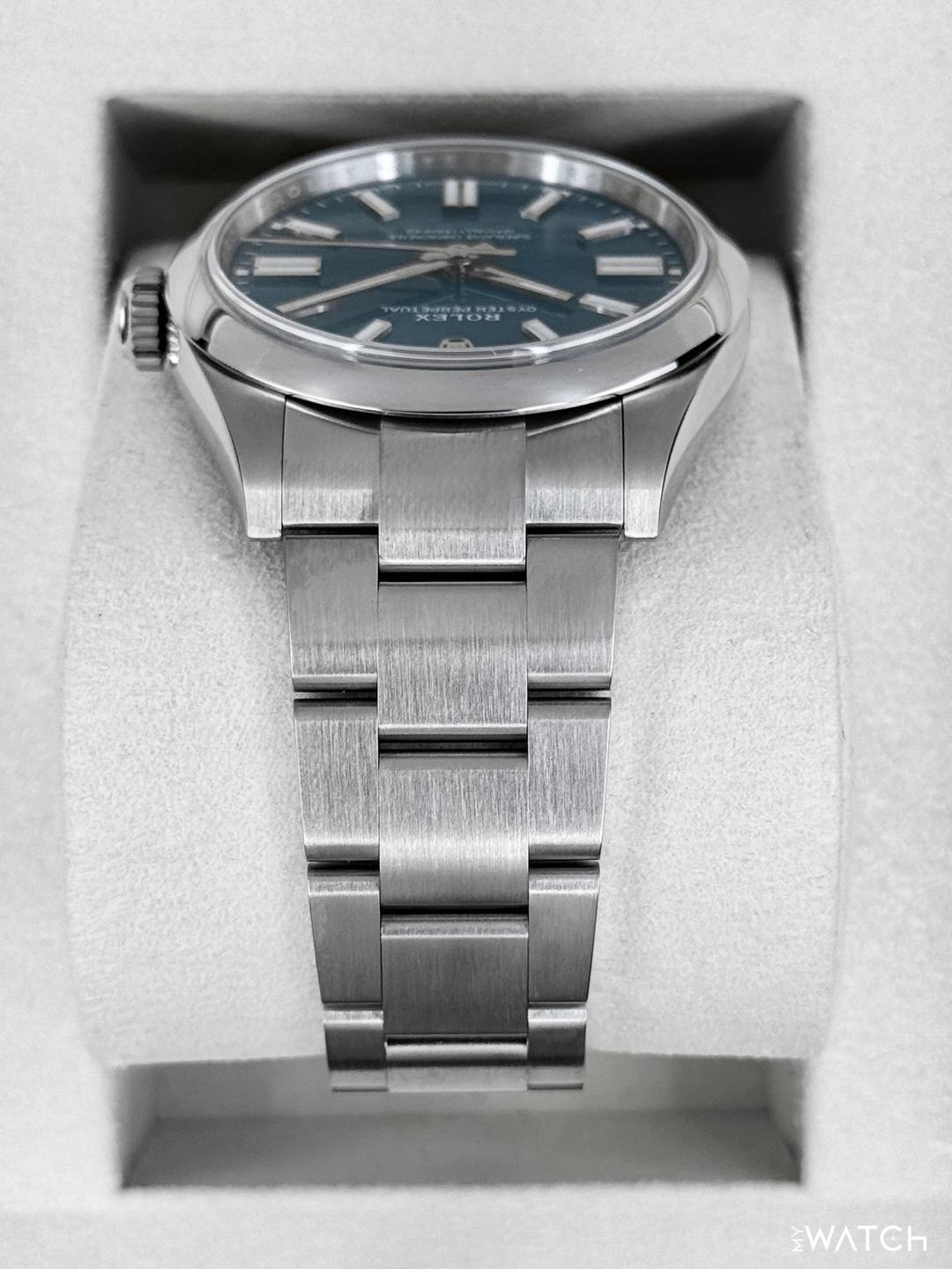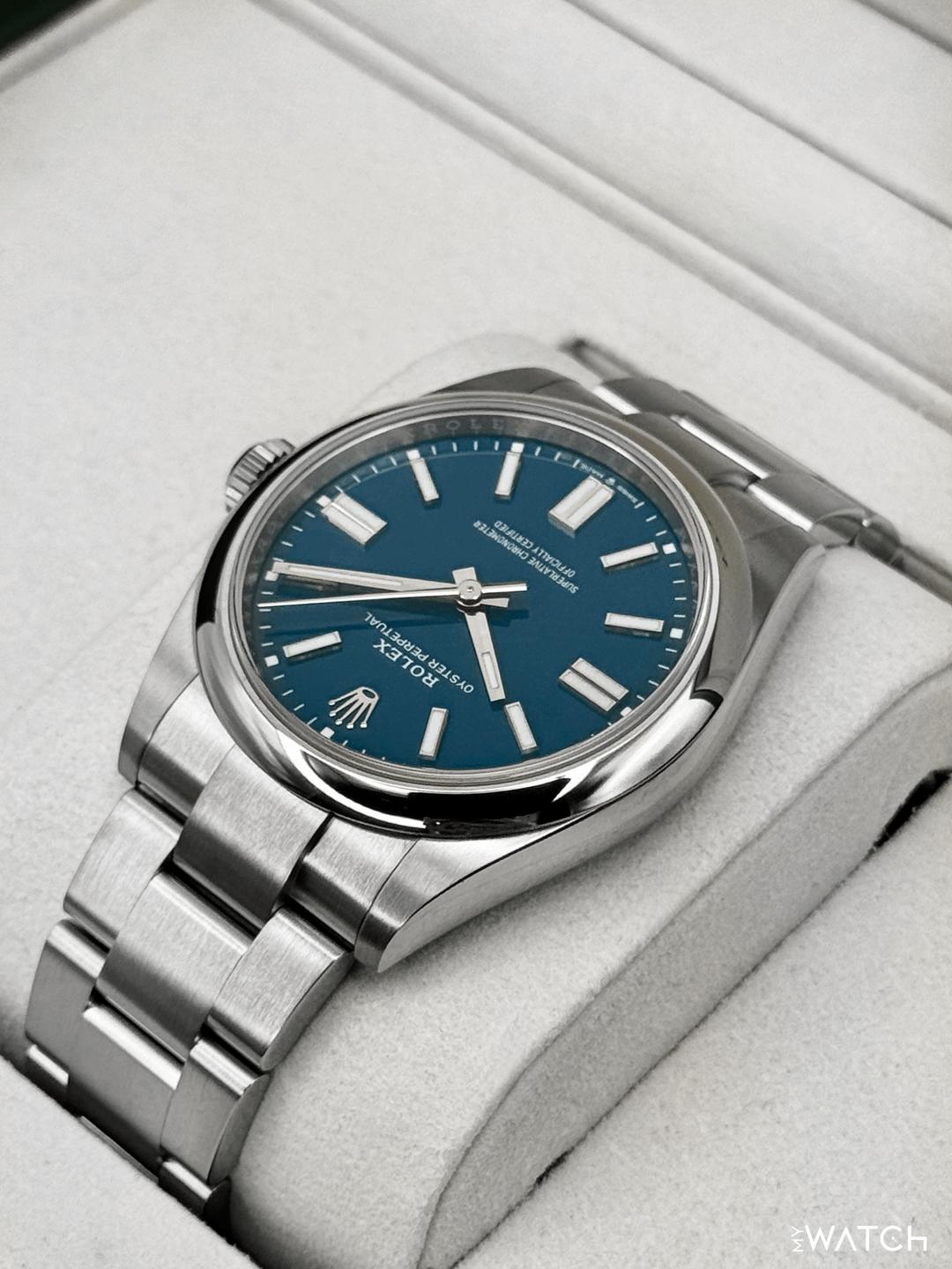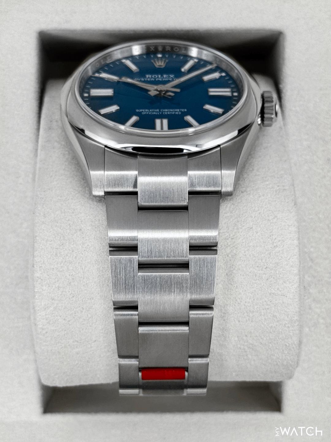 🔵**NEW 2025 Rolex Oyster Perpetual 41mm 134300 Stainless Steel Med Blue Dial with Oyster Bracelet** 🔵**NOTE: Watch still has factory stickers on the clasp, clasp lock and bracelet** 🔵**TRADE or SELL us your luxury watch, all brands considered. Message me details.** **Includes the following:** **✔️BRAND NEW 2025 UPDATED ROLEX BOX (DOUBLE BOXED)** **✔️Box and Papers - Yes** **✔️Warranty card dated October 2025** **✔️5 year manufacturer warranty** **✔️Manual and Warranty booklets** **✔️Green and White Hang Tags included** **✔️Size: 7.75inch wrist (Full Links)** **✔️Material: Oystersteel** **✔️Watch is BRAND NEW/UNWORN** **✔️**[**Trades**](https://mywatchllc.com/pages/sell-rolex-watch) **welcome** Business Name: **My Watch LLC** LOCATION: Oak Park, Michigan ✔️[MyWatchLLC.com](http://mywatchllc.com/) for current inventory ✔️Google Business Listing [https://g.co/kgs/Cmd6FPW](https://g.co/kgs/Cmd6FPW) ✔️Business Hours M-F 9-6 ✔️Facetime/Video chat/calls welcome to view the watch interested. ✔️Contact: 248-422-0909 via text or call for quickest response. 🟢TERMS: Visit [MyWatchLLC.Com](http://mywatchllc.com/) for payments accepted 🟢REFERENCES/REVIEWS: We are well reviewed on all platforms from google, trust pilot, rolexforums, additionally we have 300+ reference in multiple FaceBook watch groups, reference checks welcome. 🟢SHIPPING: If you are not local, we offer Fully Insured FedEx overnight shipping in the USA for a fee. International shipping available. [https://mywatchllc.com/products/new-2025-rolex-oyster-perpetual-41mm-134300-med-blue-dial](https://mywatchllc.com/products/new-2025-rolex-oyster-perpetual-41mm-134300-med-blue-dial)