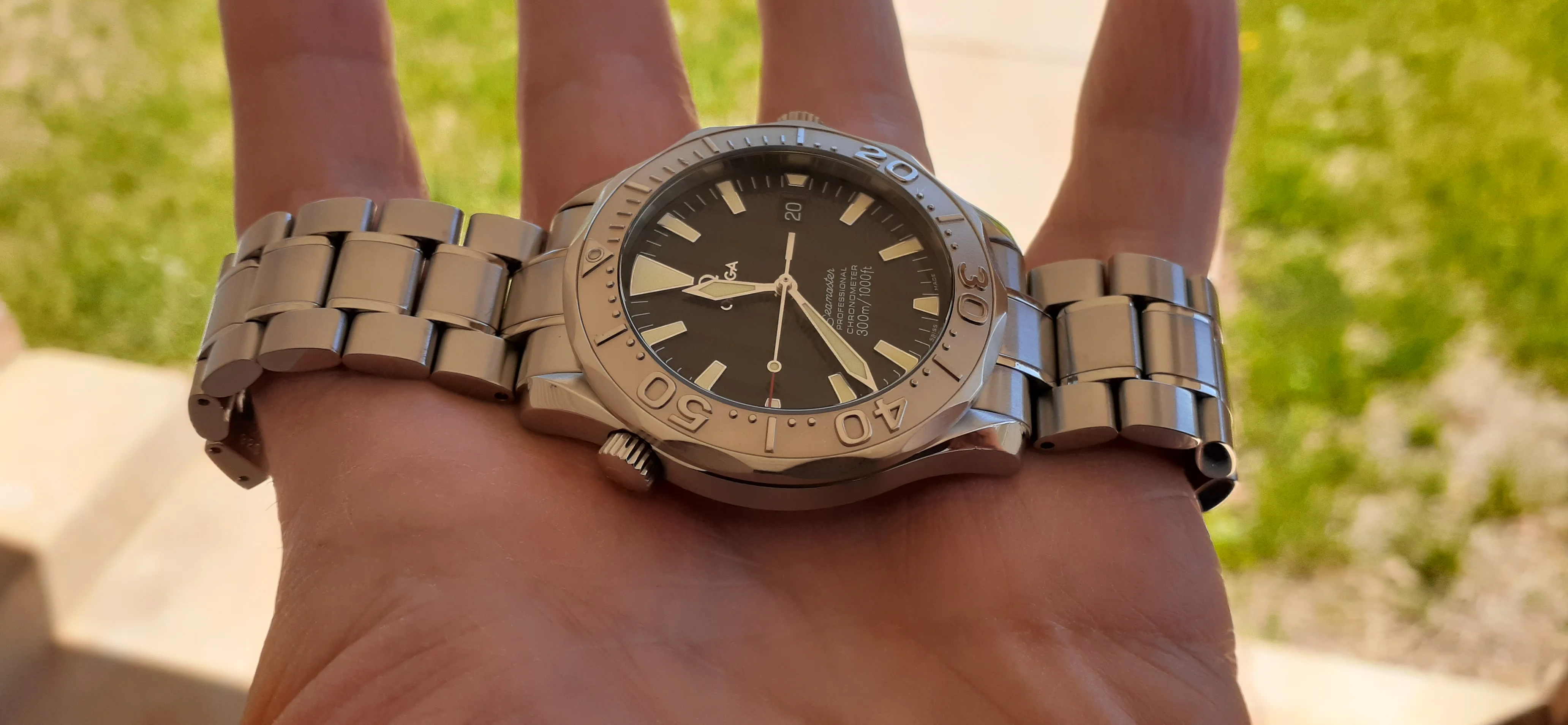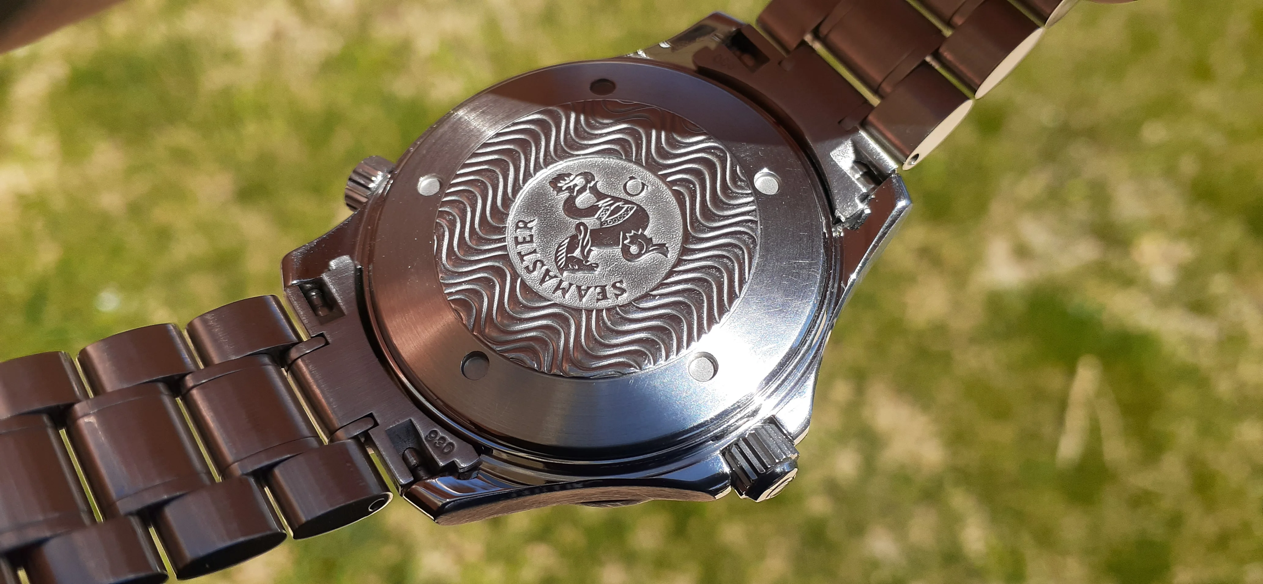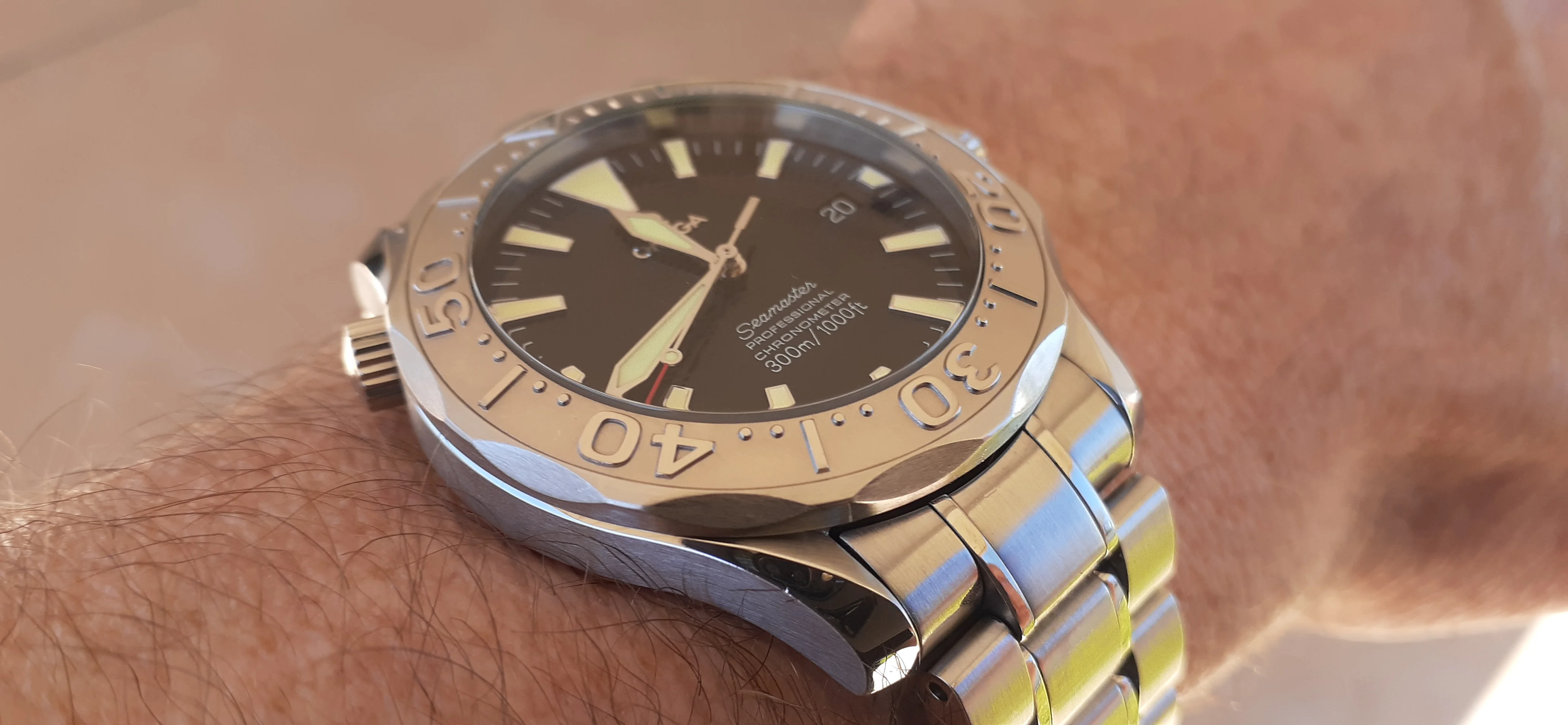 I am selling my Omega Seamaster 2230.50 "Non-America's Cup" Please look at the photos for condition. I bought it from Watch Vault NYC two or three years ago and as far as I know, it hasn't been serviced (there is even some of the red wax on the back of the case.) I timed it with WatchCheck over a week and it is averaging +7.4 sec per day. It is a great looking watch but it does have micro-scratches everywhere (I took a lot of photos today in harsh lighting to show it at it's worst) and a few deeper dings. Comes with the chronometer card, warranty card, bibliography card, three full links only.