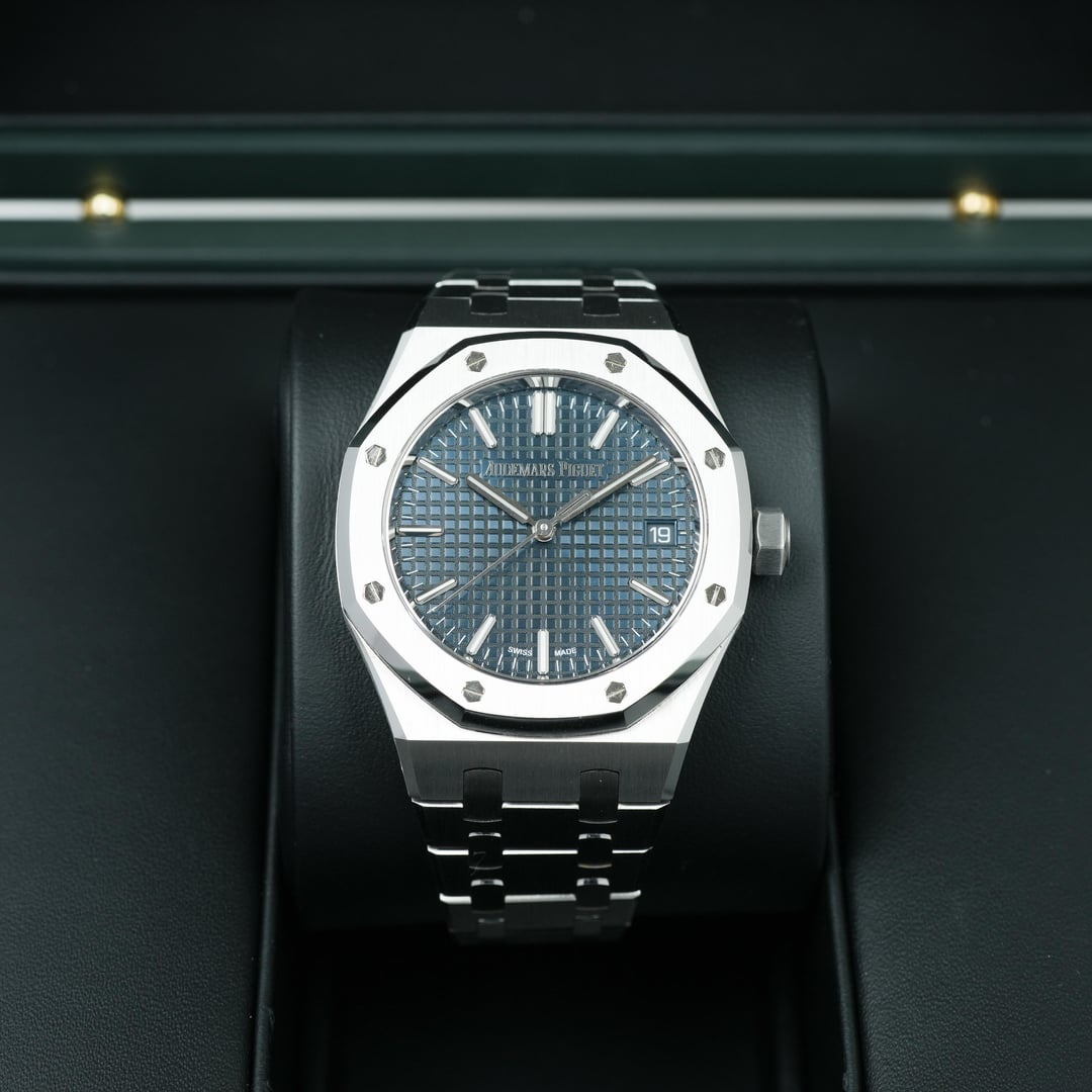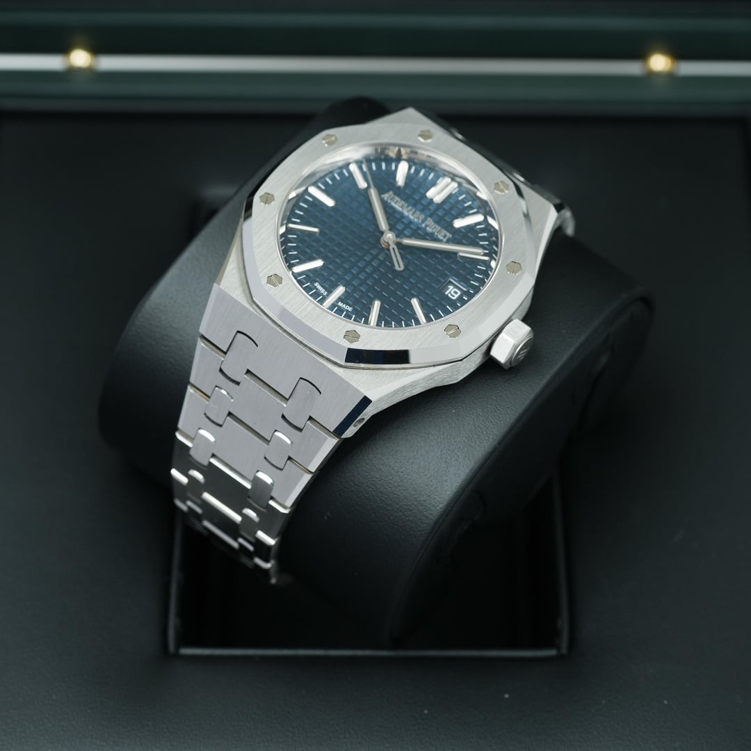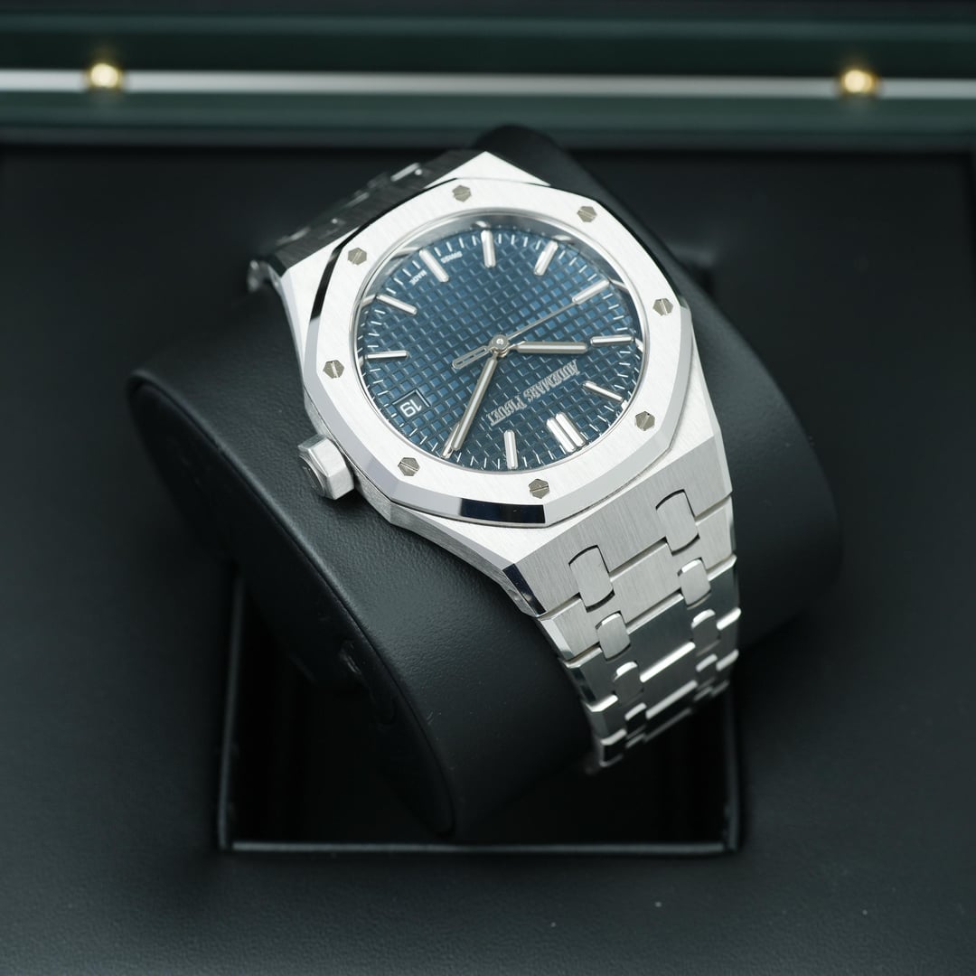 2022 Audemars Piguet Royal Oak 50th Anniversary 15550ST 37mm Complete Set Timestamp: [https://imgur.com/Qrxz1fH](https://imgur.com/Qrxz1fH) Timeless and instantly recognizable, the Audemars Piguet Royal Oak 15550ST 37mm embodies iconic design paired with modern refinement. Crafted in stainless steel with the brand’s signature brushed and polished finishes, it features a versatile Blue “Grande Tapisserie” dial that delivers understated elegance and everyday wearability. Powering the watch is the in-house Caliber 5900, a slim automatic movement offering a 60-hour power reserve and visible through the sapphire caseback. Completed by the Royal Oak’s integrated bracelet, this piece is a seamless balance of form, function, and technical excellence. Comes as a complete set with Inner/Outer box, Booklets, Certificate of Origin, Warranty card. This timepiece is overall in mint condition. Please look at my pictures as I like to fully represent the exact condition of the watch through my photography. **Offered at $51999 shipped in US or OBO.** Payments accepted: Wire or Direct Bank Transfer (Bank of America). Shipping is always FedEx/UPS overnight, fully insured. I am an avid enthusiast and collector and am not affiliated with any watch brand I post. **Always open to trades or purchases! Looking for Audemars Piguet, Rolex, Patek Philippe, F.P. Journe, Vacheron Constantin, and other luxury brands.** I guarantee every watch I sell to be 100% authentic. Follow me on IG: JJ\_Timepiece\_Co Call or text (941) 800-3931