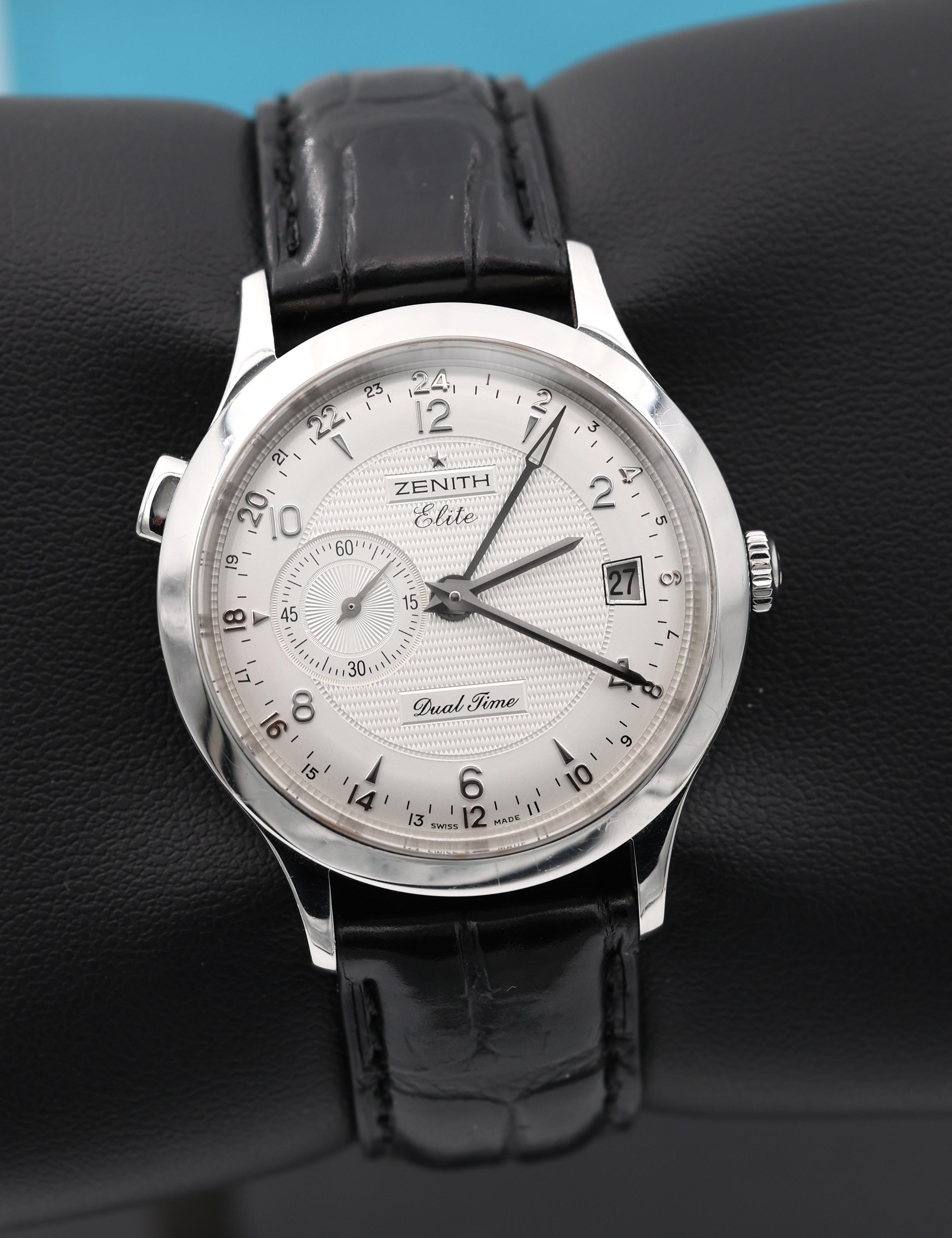 Hello All - I am putting for sale - Zenith Elite. Dual Time. GMT. Automatic. 39mm.. OEM Alligator leather, deployant clasp. Clean 📷 More Pics: [https://www.dropbox.com/scl/fo/pnxdmfb8w3jptn3iww18r/AJ3k5NpxmywsOsh7YeTDpd0?rlkey=7kl69jx2m35631h02dzy0fo9x&st=br76cwh2&dl=0](https://www.dropbox.com/scl/fo/pnxdmfb8w3jptn3iww18r/AJ3k5NpxmywsOsh7YeTDpd0?rlkey=7kl69jx2m35631h02dzy0fo9x&st=br76cwh2&dl=0) 📆 Timestamp: [https://www.dropbox.com/scl/fi/w7azjstty7uxponifpk5k/Photo-Feb-01-2026-10-51-23-AM.jpg?rlkey=o6db44m67hqvpbckgmfgtxyhq&st=xygndeal&dl=0](https://www.dropbox.com/scl/fi/w7azjstty7uxponifpk5k/Photo-Feb-01-2026-10-51-23-AM.jpg?rlkey=o6db44m67hqvpbckgmfgtxyhq&st=xygndeal&dl=0) I am asking $1950 + shipping . Watch located in NJ USA. All my listings here: [https://www.watchrecon.com/?query=watchex\_enterprises&last\_days=0](https://www.watchrecon.com/?query=watchex_enterprises&last_days=0) watchex\_enterprises - WatchRecon I am very comfortable doing a facetime to show the watch if needed. Please PM me for any questions that you may have. I am certain it will go to a good home. Thanks for looking. \*\* 🛡️Buy with Confidence!! 700+ references. \*\* ⭐️Checkout my profile for other amazing watches. \*\* 📦All packages are shipped Fedex with insurance. \*\* 🌎Shipping accepted globally.
