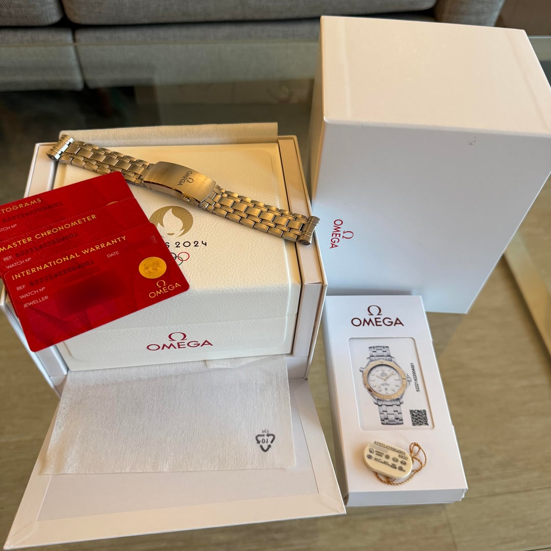 Celebrating OMEGA's role as the Official Timekeeper of the Olympic Games, the Seamaster Diver 300M "Paris 2024" Ref. 522.21.42.20.04.001 is a luxurious tribute to sporting excellence. The 42mm case combines stainless steel with OMEGA's exclusive 18K Moonshine Gold, creating a warm, elegant contrast. The bezel features a laser-structured diving scale in positive relief, while the white ceramic dial is matte finished with polished waves. A nice touch is the custom "Paris 2024" typography on the date disc. The solid caseback features a stamped medallion of the Paris 2024 logo in 18K Moonshine Gold. Powered by the Calibre 8800 Master Chronometer, this watch delivers gold-medal performance and precision, making it a coveted piece for collectors of Olympic memorabilia. **Model Info** - **Maker:** OMEGA - **Model Name:** Seamaster Diver 300M "Paris 2024" - **Model:** 522.21.42.20.04.001 **Watch Info** - **Condition:** [UNWORN] Watch is unworn. "Paris 2024" NATO strap is pre-installed. - **Contents:** [ULTIMATE SET] Includes box, papers, serial hang tag, shipping coffin, and digital copy of original purchase receipt. Also includes (pre-installed) "Paris 2024" NATO strap. - **Dated:** 2024 **Delivery** - **Price:** $8,100 USD - **Shipping:** Free two-day shipping anywhere in CONUS. Will ship overnight or internationally for a fee. - **Payment:** Pay via bank wire, Zelle, or crypto. Will accept Venmo or PayPal G&S (+3.5%) from individuals with sufficient transaction history. **Photo Gallery** - **Timestamp:** https://imgur.com/a/OW6MaZD ***Let us help you... MAKE THE CALL!***