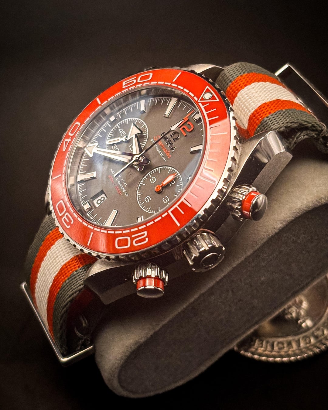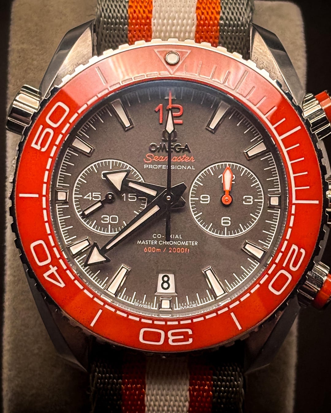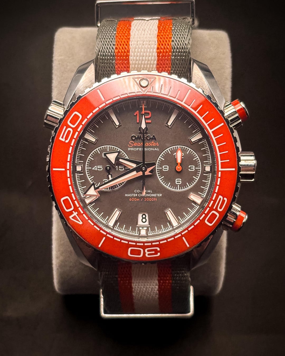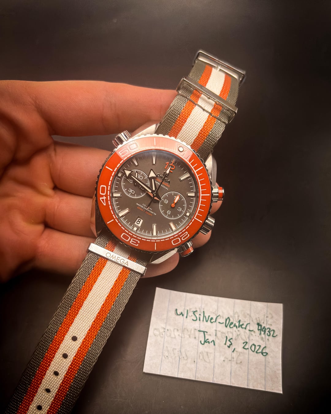 Condition: Great overall. Stainless steel case shows light surface scuffs and hairlines consistent with careful wear; no deep dents or structural damage. Red ceramic bezel is clean and vibrant with no chips or cracks. Sapphire crystal is clean with no visible scratches. Grey dial is excellent with crisp printing, clean hands, and intact lume. Chronograph pushers and crown operate properly; date changes correctly. NATO strap is in good condition with light wear only. Timegrapher photo included showing healthy running parameters. Includes: Watch only Price: $4,599 shipped. Sales tax may apply to GA/IL buyers. ⸻ Shipping — Fully insured FedEx 2-Day within 24 hours of cleared payment. Timestamp — Included in photos. ⸻ Overview — Omega Seamaster Planet Ocean 600M Chronograph (Ref. 215.32.46.51.99.001). Features a 45.5mm stainless steel case, grey dial with orange accents, unidirectional red ceramic bezel, sapphire crystal, screw-down crown and pushers, and 600m / 2000ft water resistance. Powered by the Omega Co-Axial Master Chronometer Calibre 9900, offering METAS certification, column-wheel chronograph architecture, and exceptional anti-magnetic performance. A bold, modern professional dive chronograph with strong wrist presence and serious technical credentials.