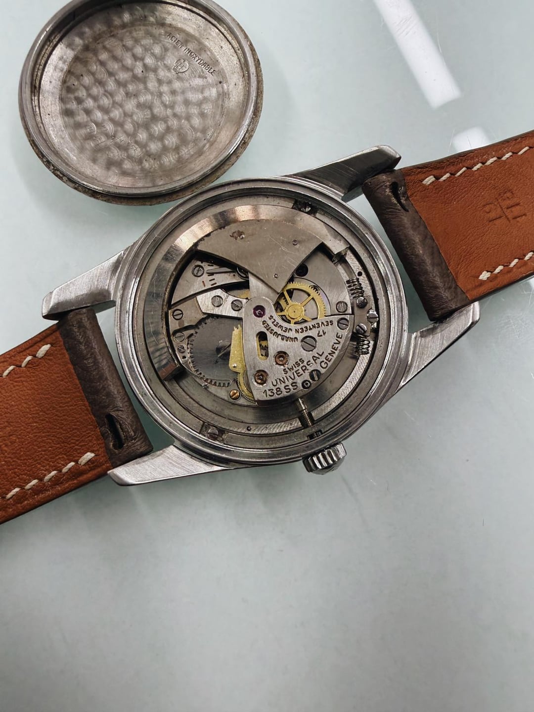 Inside you’ll find the caliber 138SS, one of Universal’s first in-house automatic movements from their golden era. These laid the groundwork for the microtors calibers that followed, making this watch an historically significant watch. It also has a Portuguese import stamp.