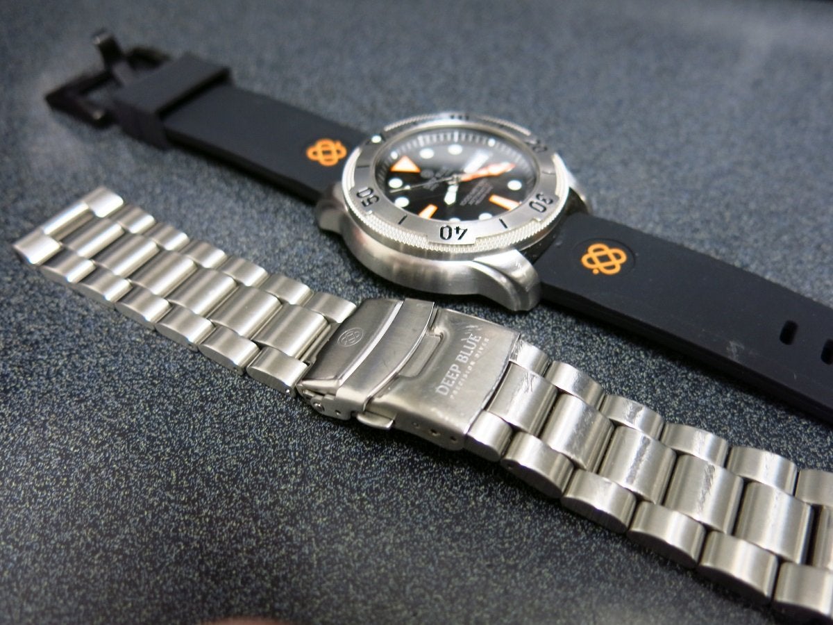 Comes with the original Pelikan style case, Deep Blue rubber strap, bracelet that is a bit beat up and long enough for about 7 1/2" wrists, cloth and warranty card.