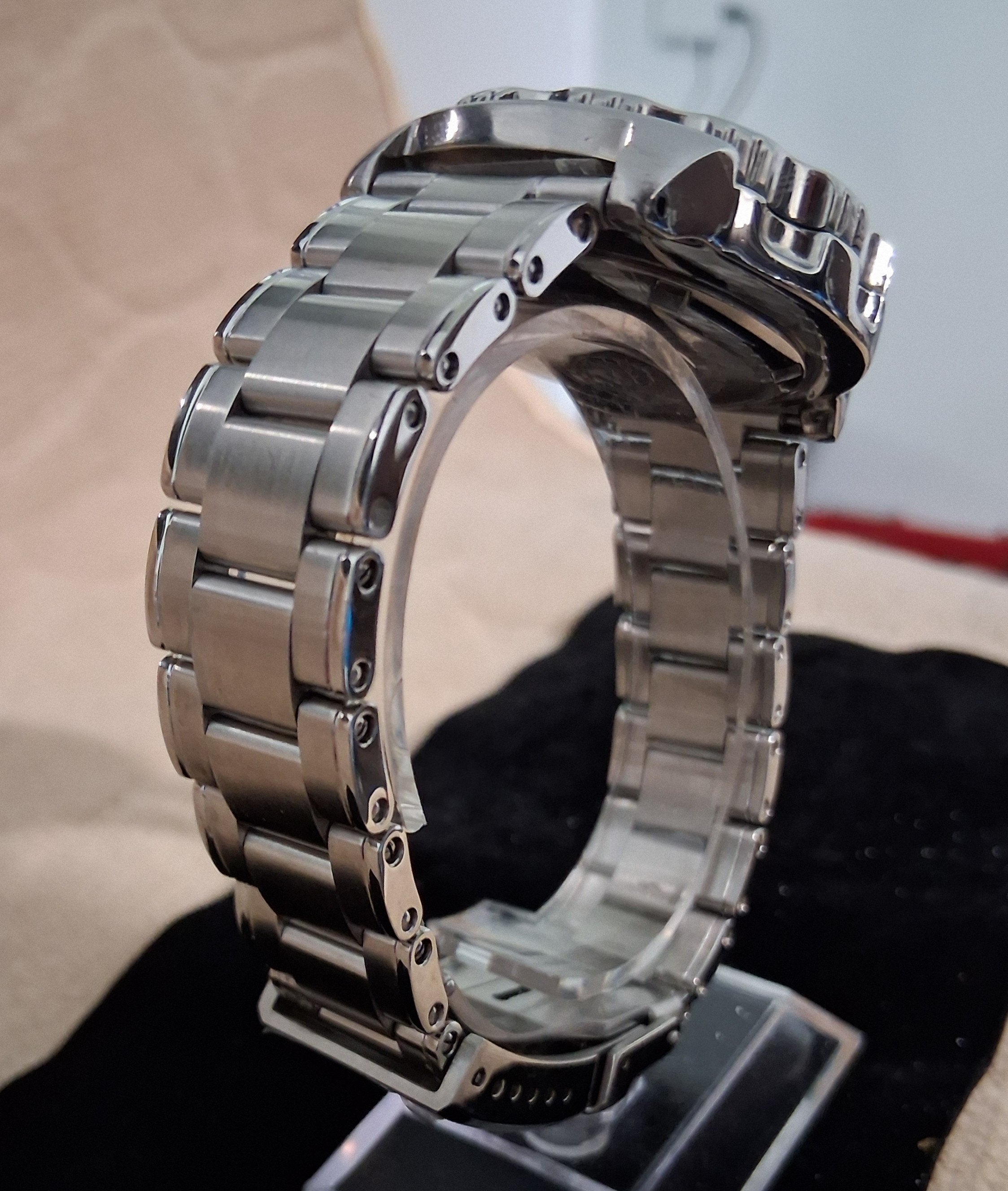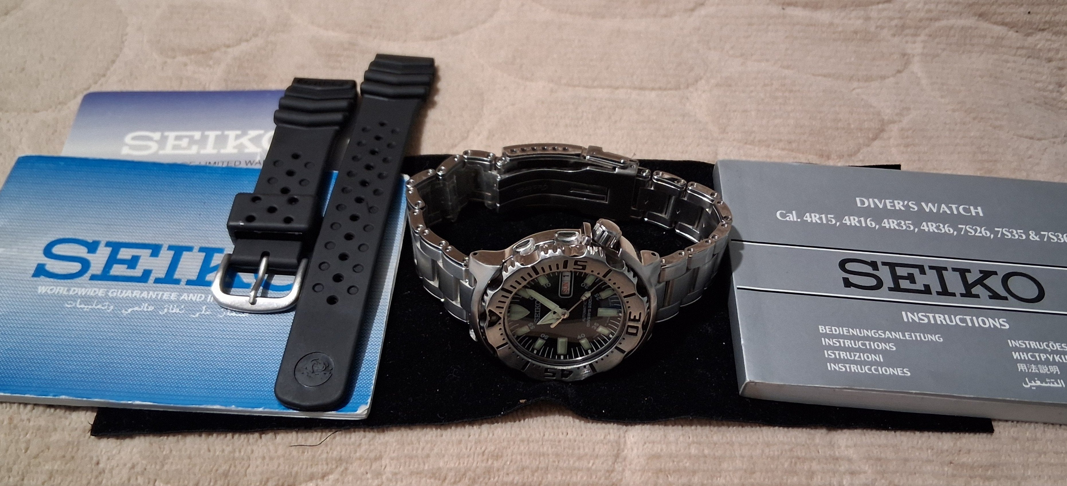 In very good shape, no deep scratches, dings or dents, clean crystal, original rubber strap included, showing little to no wear and tear, and bracelet is a Watch Gecko product, a Vintage style Rivet Bracelet, much better than the original cheap Seiko bracelet that came with the Orange Monster, SKX781. This model, the black dial, came mounted on the included rubber strap. Also included is the owner's manual and warranty card and booklet. The original box didn't make it through the years, but I will include a single watch travel pod that is perfect for bracelet watches.