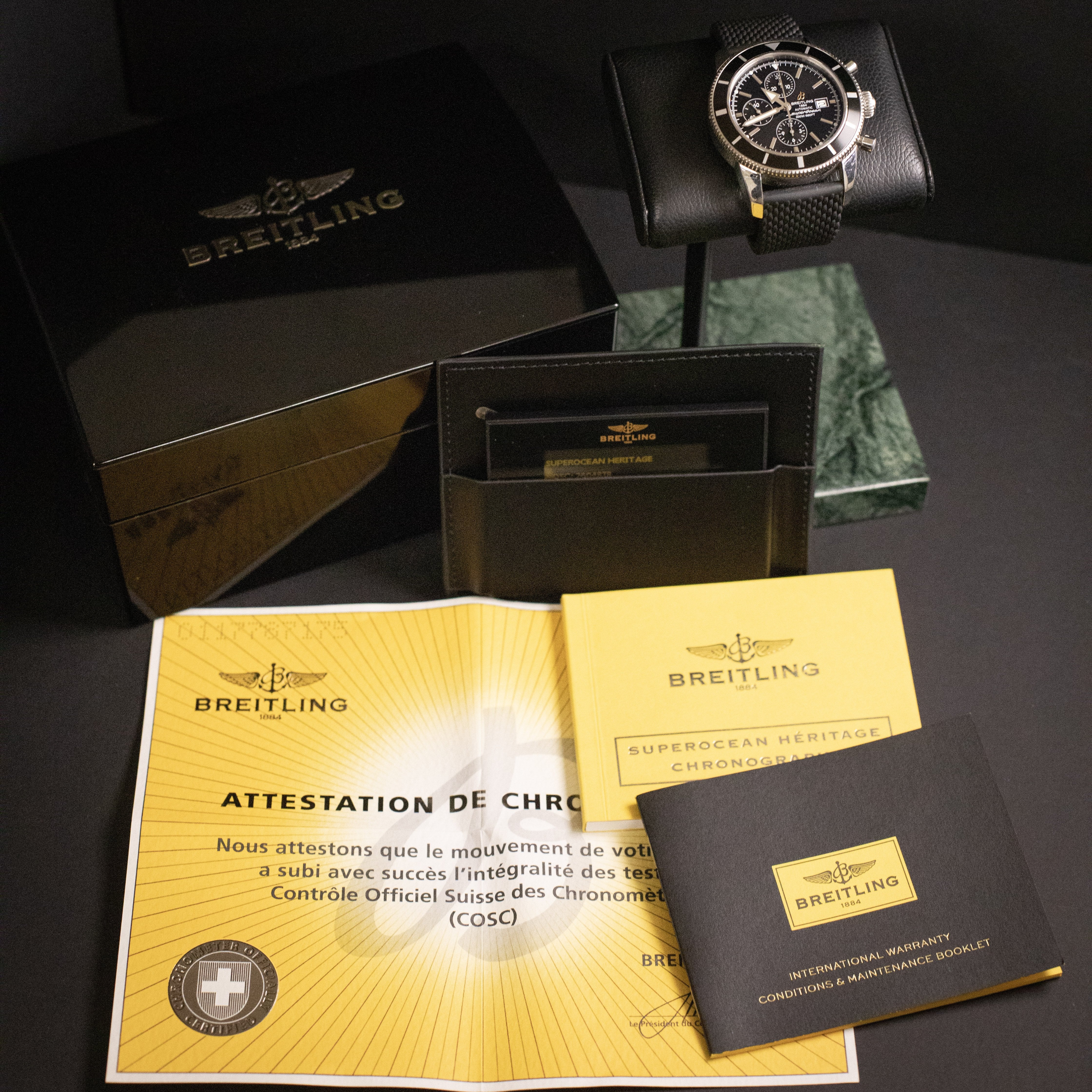 Accessories: Comes mounted on Breitling divers rubber strap and deployment buckle, as well as original leather strap and butterfly clasp