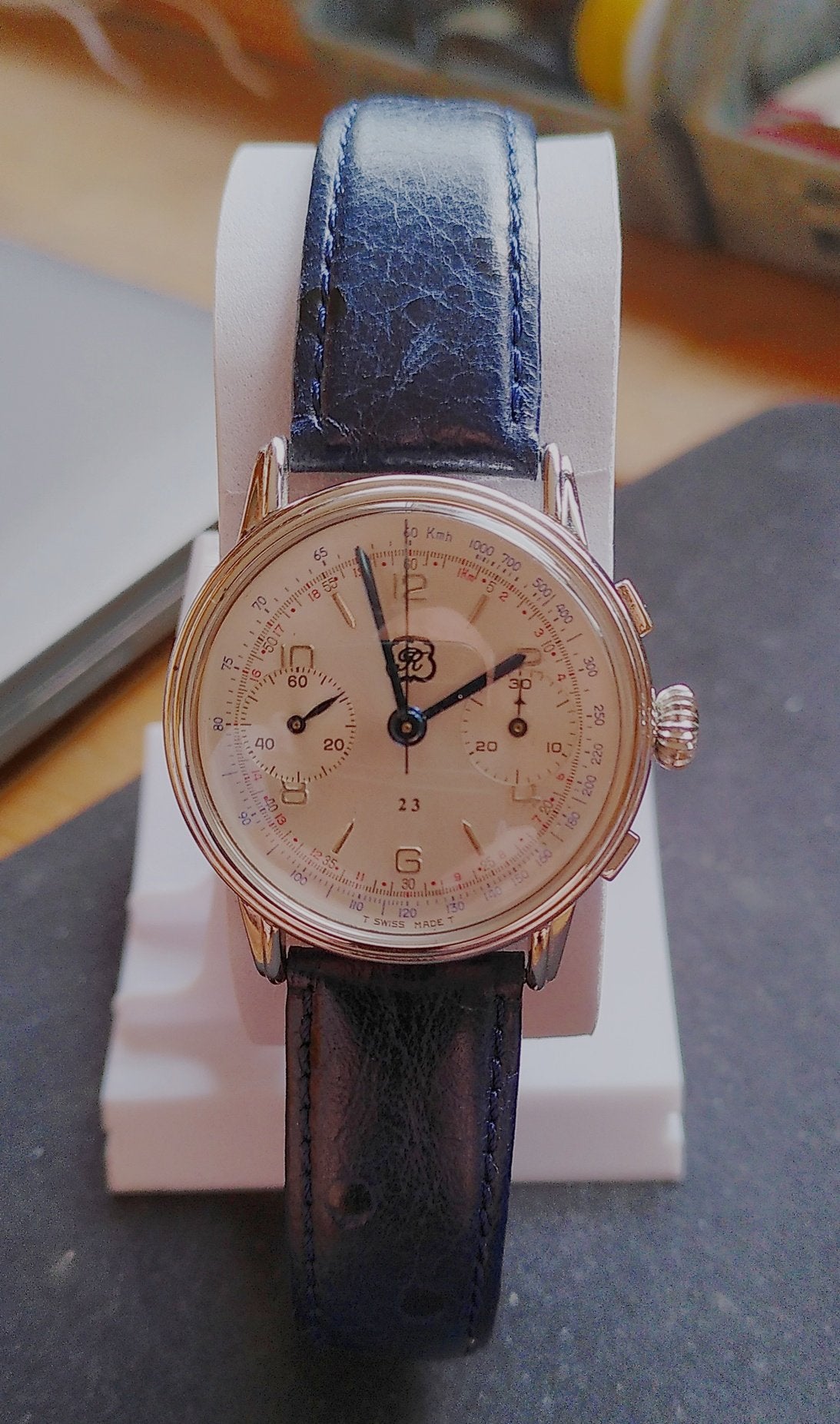 Solid silver 0,925 Chronograph . Vintage. Cal. Valjoux 23 ! Very clean watch , no scratches , no dents. All functions given . Ø 35 mm , 41 mm over the lugs , 13mm thick , 18mm strap .