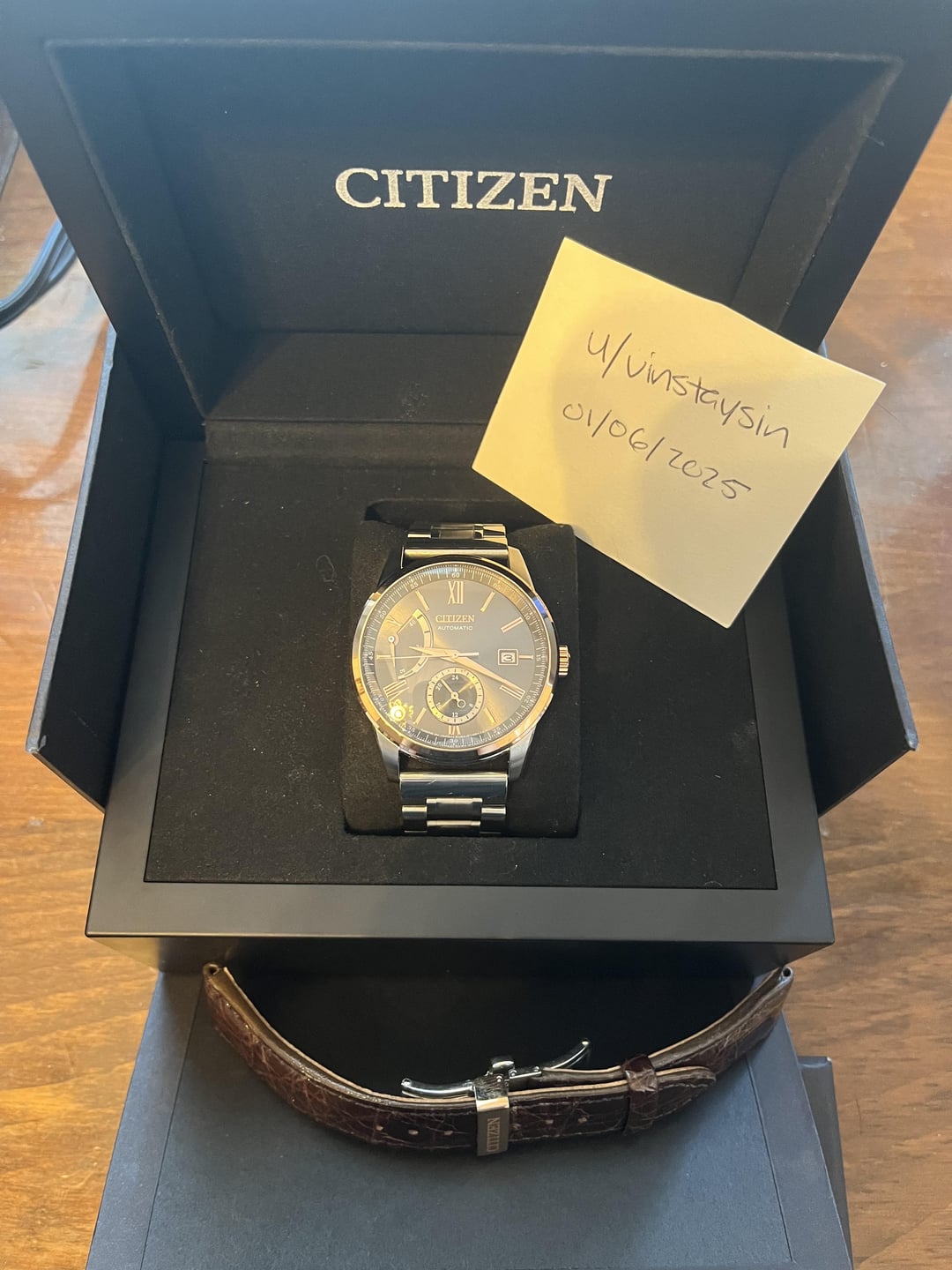 Hello all! I have a Citizen Automatic Taiwan Exclusive for sale! I got it December 2024, comes with full US warranty, box, extra links for a StrapsCo bracelet and OEM alligator strap! It runs great, only worn maybe 5 times. Very tiny hairline scratch on bezel at the 5 o clock. Selling for $499! No trades please, clearing out for car repairs :(