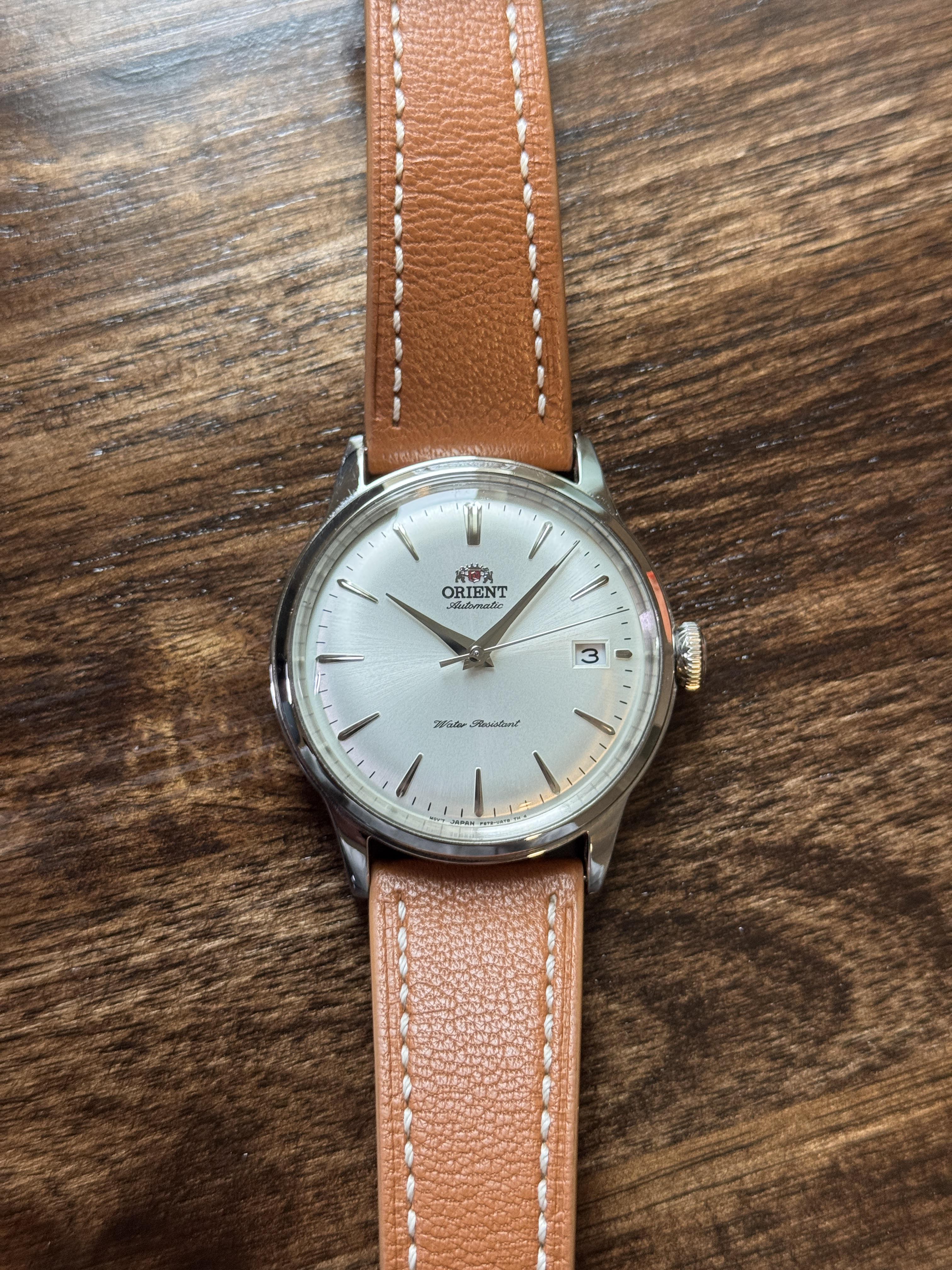 Orient Bambino Version 7 (RA-AC0M03S30B) Orient Caliber F6724 Domed Mineral Crystal and display back 30m of water resistance Case diameter: 38.4mm Case thickness: 12.5mm Lug width: 20mm Lug-to-lug: 44mm There is a small scratch on the case at 5 o’clock. I wear the watch on other 20mm watch straps. The OEM strap is not used. Throwing in both OEM and a handmade Epsom strap. Watch box not included. Look to get $200 shipped CONUS Zelle or PayPal. Please send inquiries as PM or chat. Let me know if you have any questions, concerns, and offers. Pictures: https://imgur.com/a/N8c4kY6 Timestamp: https://imgur.com/IrYEXao [EDIT] Not looking for trades.