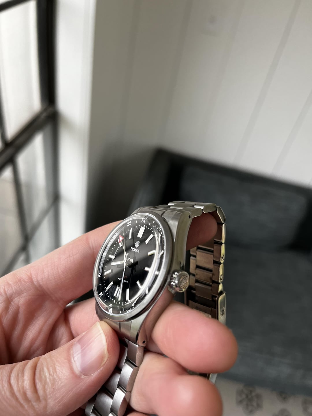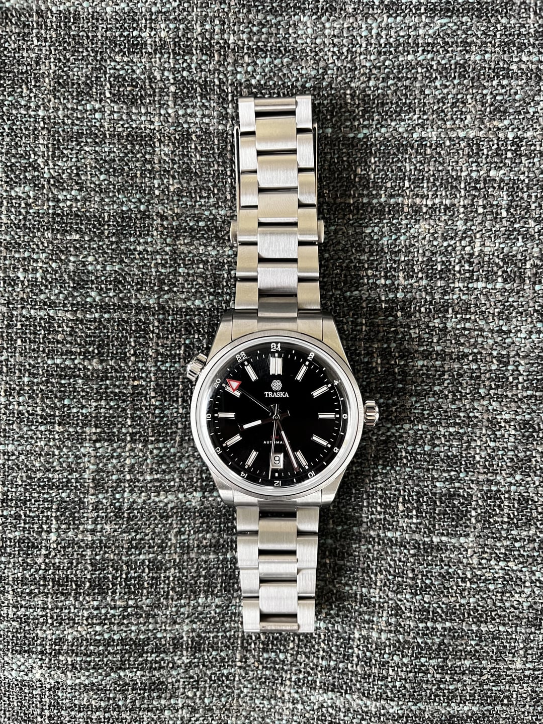 Hello WatchExchange! For your consideration is this Traska Venturer GMT in Carbon Black. It's got hardened steel so it looks practically unworn (I literally can't find any scratches on it anywhere, even the clasp). It comes with the full kit, including outer and inner boxes, the leather travel pouch, and all links. It is keeping excellent time < 4 seconds +/- per day depending on the position I leave it in overnight. It's an incredible watch at an incredible value. I'm just not wearing it so I'm going to it go to someone who will. **Crystal:** Sapphire **Case:** 39mm **Thickness:** 9.75mm **Lug Width:** 20mm **Movement:** Miyota 9075 Automatic **Price:** $640 shipped **Shipping:** USPS w/ tracking **Payment:** Paypal or Venmo F&F only More info can be found [here](https://www.traskawatch.com/products/venturer-gmt-carbon-black). Happy hunting!