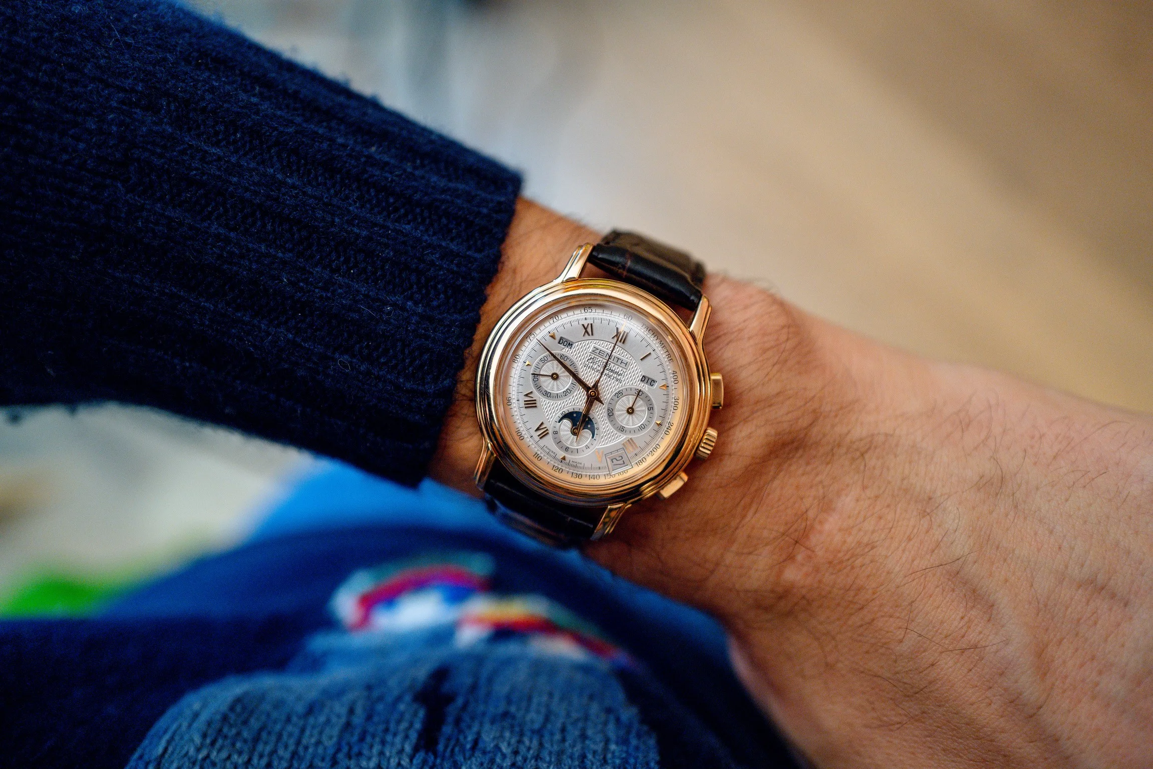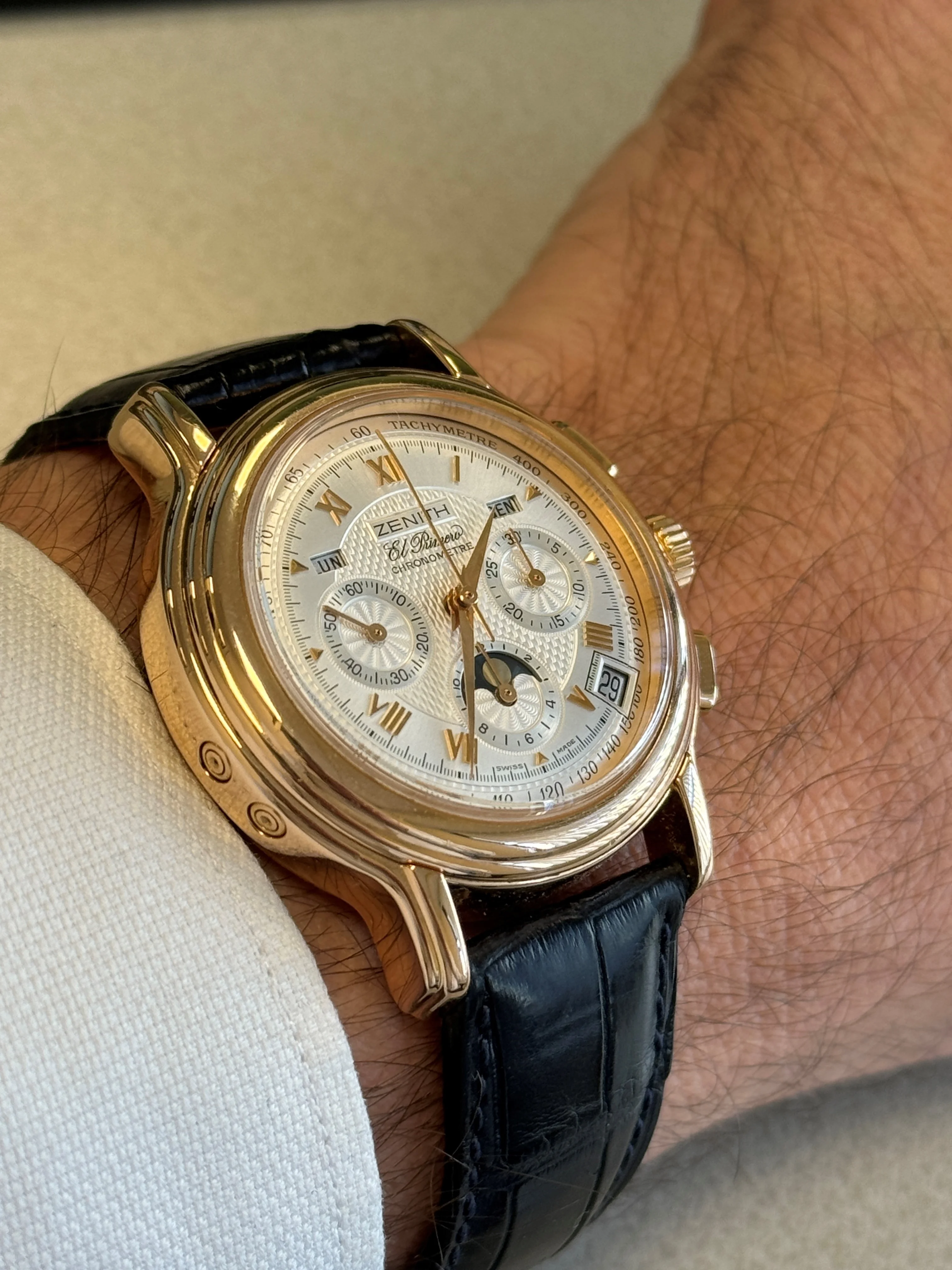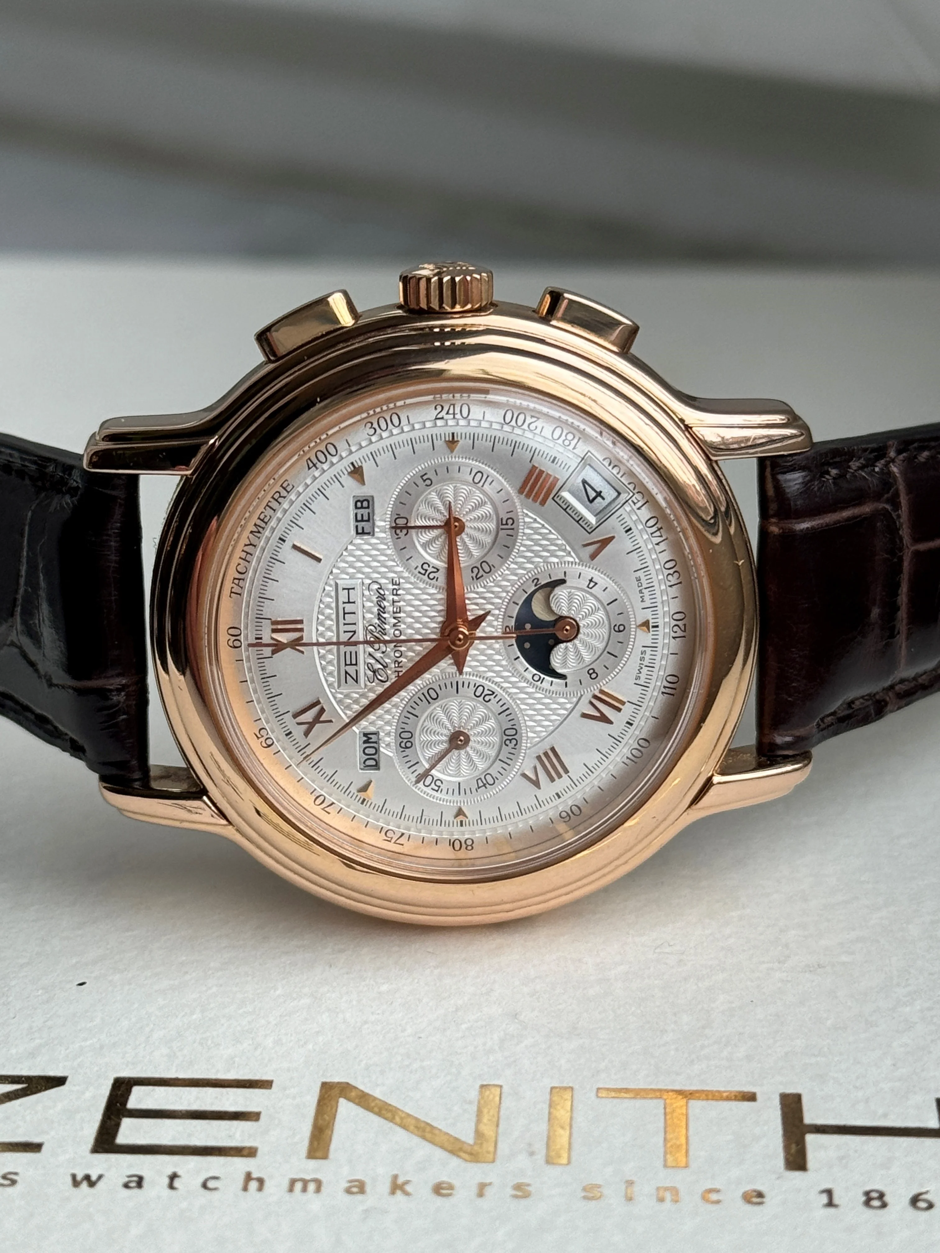 This watch is in excellent condition. The guilloché dial is flawless, and the case is also in superb shape. The sapphire crystal on both the front and back is scratch-free. The renowned El Primero movement in this model offers not only a chronograph but also day, date, and moon phase functions. Additionally, this version is chronometer-certified, and the set includes a copy of the COSC certificate. The watch retains its original signed crown and the original 18k rose gold tang buckle.